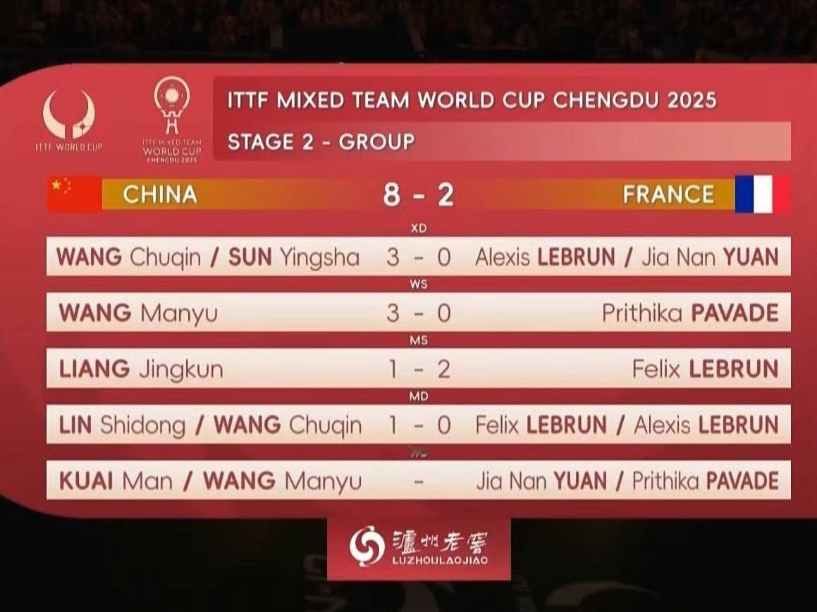 国乒8比2法国23年混团8-1 25年混团8-2法国队一共得了3分 3分都是Felix拿的