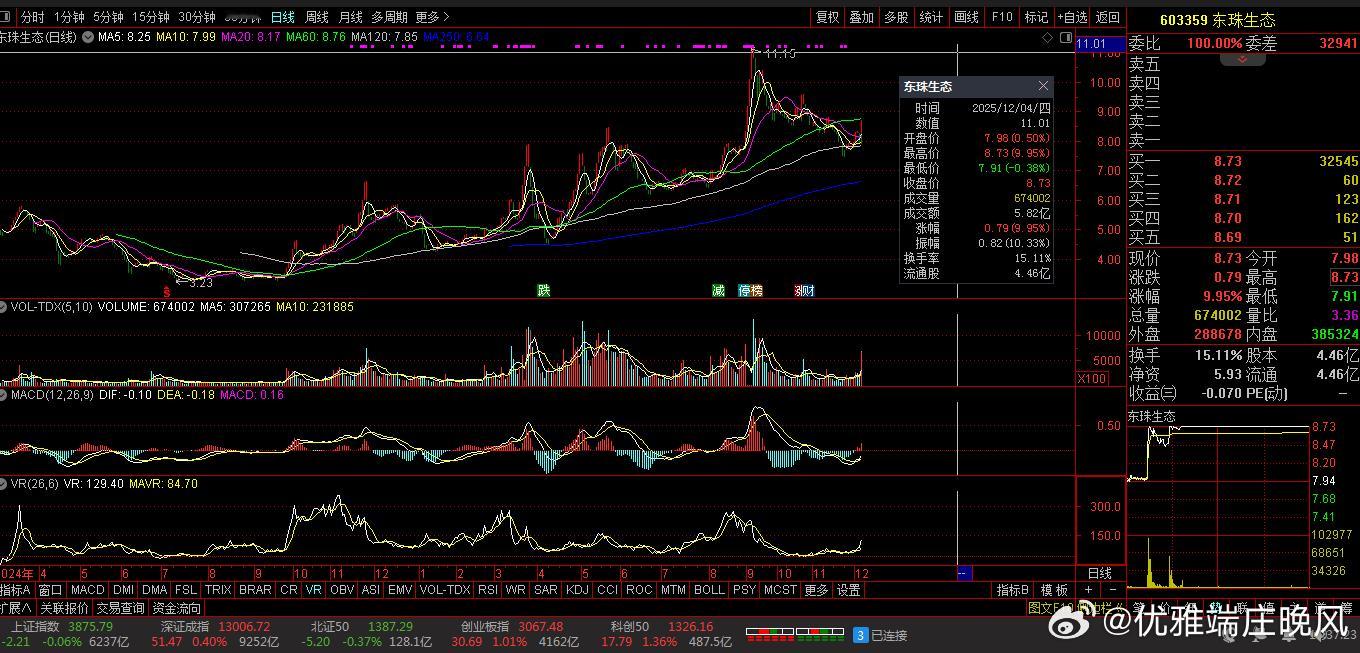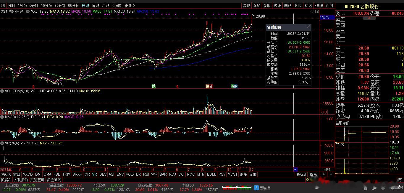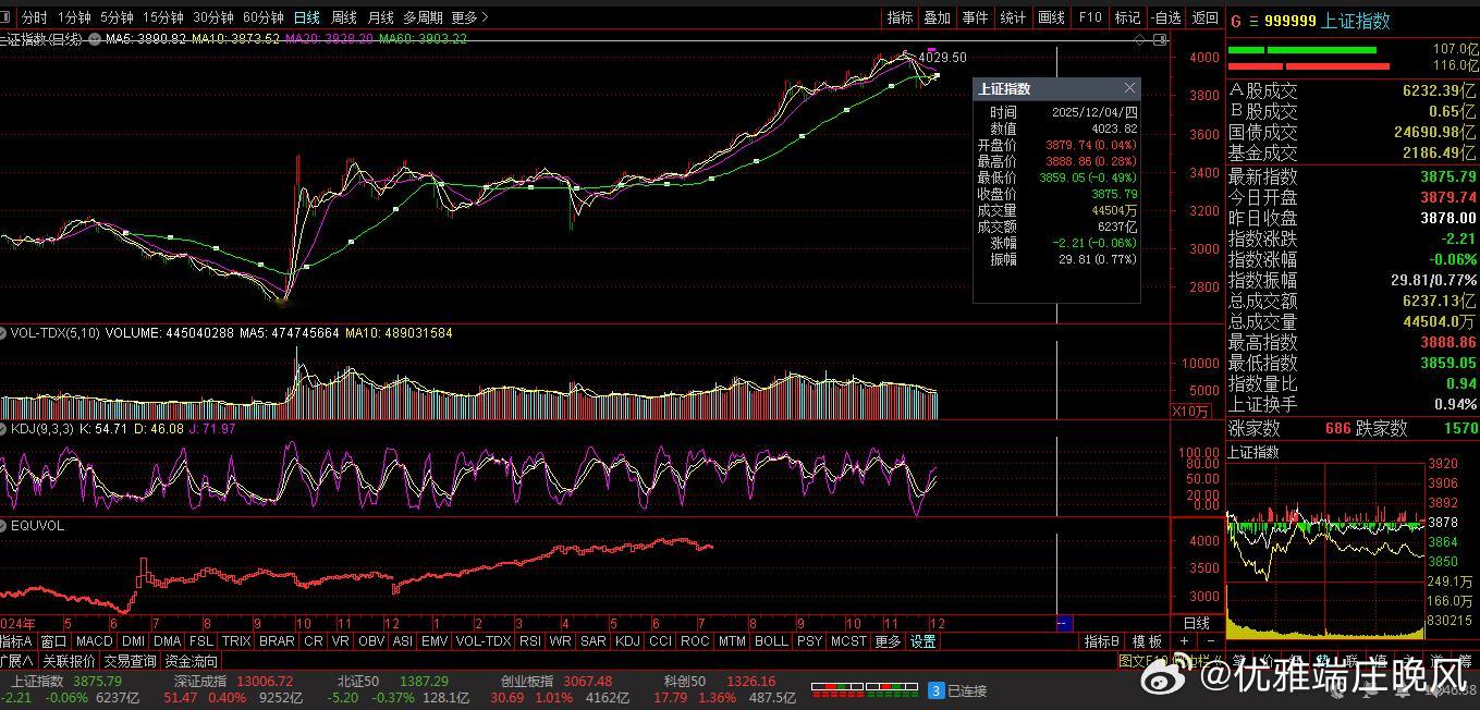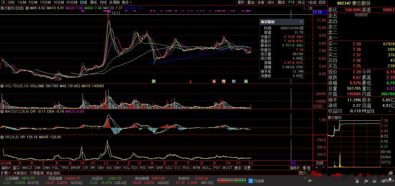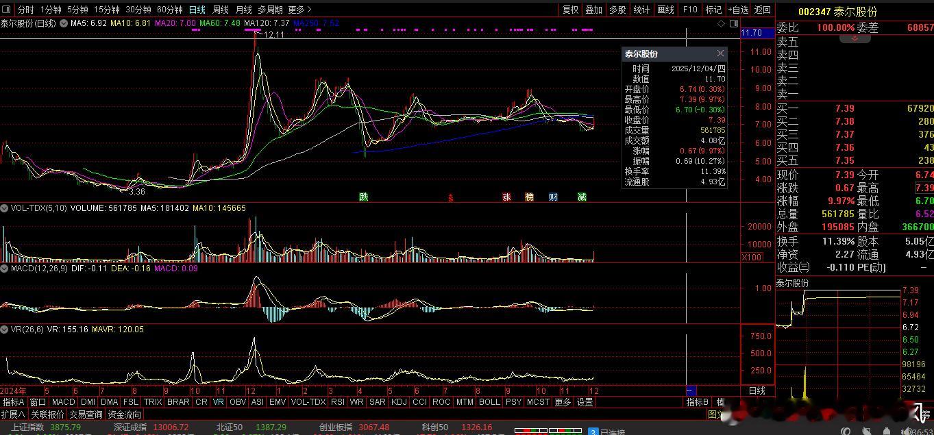 【财富晚茶】午盘透析(12.04):北证涨幅0.23%:体育反弹渔业回调导语:作者系《网易号》优质财经领域创作者。曾经原创作者和知名网易号旅游领域创作者。大跨度行业等的写作,颇受网友喜爱。作品发表于2025.12.04.12:18 优雅端庄晚风。(标题照片:全球最佳野外攀岩:美国约塞米蒂国家公园)【内容概述】今日股市午评:截止11:30:沪指:贡献1根阳线3阴线。深指:贡献2根阳线2阴线。沪指跌破:阻力位:03901点。沪指跌破:支撑位:03869点。深指跌破:阻力位:13126点。深指跌破:支撑位:12922点。追寻盘面:沪深弱势冲高受阻,尾盘杀跌资金入场。一、透析市场:风口公司,上下起伏002347 泰尔股份 盘中 01涨1、突破八年箱顶视野盘面:前期四底,震荡拓展:2025-12-04 截至11:30:股价报收:7.39元。股指上涨:9.97%。成交总量::561785手,成交金额:4.08亿元。总换手率11.39%,观总市值:36.46亿元。流通市值:36.46亿元。2、高端装备龙头主营业务:高端装备-智慧运维服务的研产和销售。公司品牌:国内领先高端装备和方案服务商。3、营收优净利减业绩好转:2025-09-30 三季度报:公司营收:8.231亿 同比增11.57%。公司净利:-5369.0018万 同比增-240.29%。二、沪深红盘:空方强势,悲剧股市今天目击:沪深北市:早盘:高开二跌,四涨一跌。尾盘:触底一涨,次高红盘。看点之一:沪深北指:股指高开:盘中探底:瞬间回升。沪指强势:杀跌翻红。看点之二:强势黑马:创指超强:一度涨超1%。看点之三:沪深北市:半日成交:10403亿元。盘面追踪:3493股飘绿。三、沪阴深阳:个股弱势,亏钱效应沪深追踪:截至午间:市场收盘:沪指涨0.04%报3879.52点,深指涨0.35%,创指涨0.76%,北证50指涨0.23%,沪深北市:10403亿元。四、盘面观察:体育脉冲,渔业回调1、板块扫描透析沪深板块:板块走强:体育、航天装备、家电零部件、电机制造等。板块走低:渔业、酒店餐饮等。概念活跃:减速器、人形机器人、工业母机等。2、个股涨跌起伏沪深北市:多空遭遇。1795股票上涨,31涨停板。3493股票下跌,7股跌停板。沪深北市:合计成交:1.04万亿元。午盘视野:沪深高开做多夭折,尾盘冲高筹码兑现。五、沪深涨跌:三甲前茅,安不忘危1、今日涨幅谁家主旋律:天经地义:风口股票涨停板002830 名雕股份 002347 泰尔股份 603359 东珠生态第一、涨幅榜眼排行榜-1:002830 名雕股份主营业务:中高端家装-家居综合服务等研产和销售。公司品牌:科技家装的综合服务提供商。排行榜-2:002347 泰尔股份主营业务:高端装备-智慧运维服务等研产和销售。公司品牌:国内领先高端装备和方案服务商。排行榜-3:603359 东珠生态主营业务:苗木种植-园林景观设计绿化工程养护等研产和销售。公司品牌:中国生态修复与景观建设行业综合实力最强企业。第二、综评榜技术看盘-1:002830 名雕股份。潜力股票-1:002830 名雕股份:科技家装的综合服务提供商。风险股票-1:暂时没有:即无301092 争光股份。2、今日跌幅谁家主旋律:摇摇欲坠:弱势股票涨停板300391 *ST长药 002632 道明光学 002564 天沃科技跌幅榜-1:300391 *ST长药主营业务:医药制造-通用设备-新能源的研产和销售。公司品牌:亚洲最有影响力道地药材全产业链供应商。跌幅榜-2:002632 道明光学主营业务:反光材料-反光服装-反光制品等研产和销售。公司品牌:薄膜型新材料核心平台型科技企业。跌幅榜-3:002564 天沃科技主营业务:高端装备制造-国防建设电力设计的研产和销售。公司品牌:石油有色等领域压力容器国内知名专业厂家。六、创作不易:优质网易,财经作者投资投机迷茫之中:给予尽可能有帮助:资本市场风险自负。(优雅端庄晚风《网易号》财经领域创作者和原创作者 违者必究)
