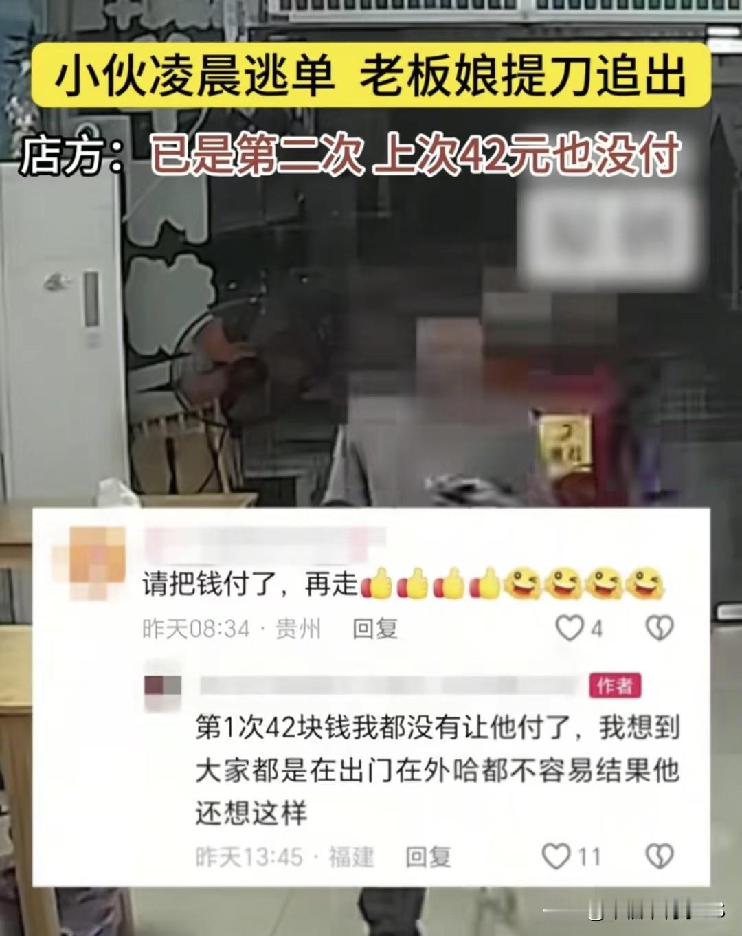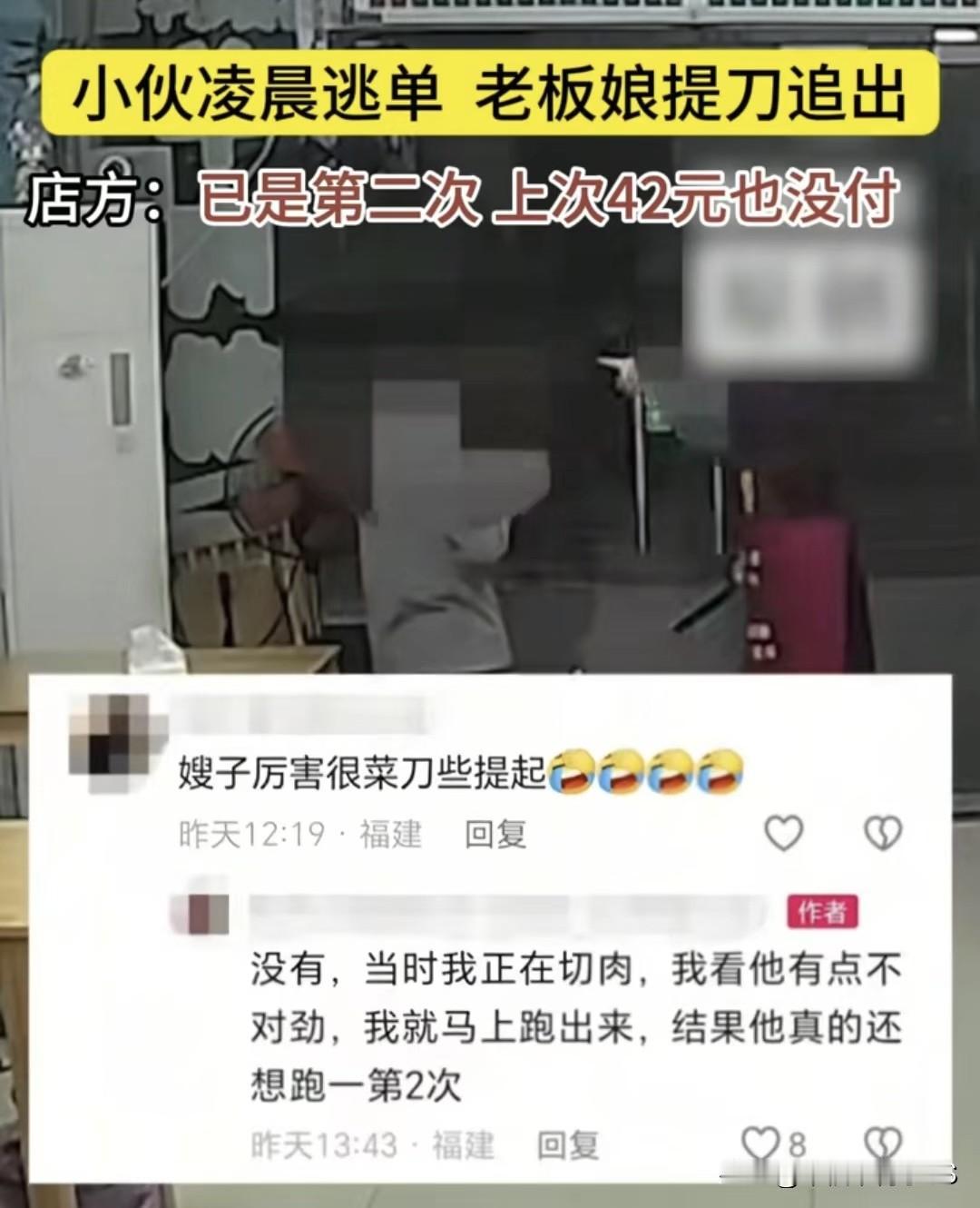 见过吃霸王餐的,没见过一家店吃两次还想跑的 福建泉州有家粉店,最近上演了一出现实版逃单连续剧。一个小伙逃单一次,第二次又往这家店钻,不是因为粉多好吃,就是想白嫖! 老板娘正忙着切肉备料,一抬头,嚯,看见个熟脸!这不就是上次吃了42块没付钱的那家伙嘛!老板娘也没声张,站在门口盯着他。 果然,这小伙一碗粉下肚,起身就往店外挪临走前还顺手抄了瓶冰箱里的饮料,掏出手机假装自己结过账了,转身就想溜之大吉。 结果刚到门口,迎面就撞上提刀而立的老板娘!小伙非说自己付款了,就要扒拉门离开最后在老板娘的“气场压制”下,老老实实把这次26元的餐费补上了。 老板娘没翻旧账,上次那42块也没让他赔。有网友说,这不是心软,可能是上次没证据。 一个成年人,为了几十块的粉,把自己的诚信和脸面扔地上摩擦,这哪是穷啊,多半是习惯性占便宜上瘾了,把别人的容忍当成了傻。 真别觉得几十块是小钱,你眼里不起眼的一顿饭,可能是别人起早贪黑切肉熬汤,一站一整天的辛苦钱。尊重别人的劳动,遵守最基本的规则,这不是多高尚的事,是一个成年人该有的最起码的体面。