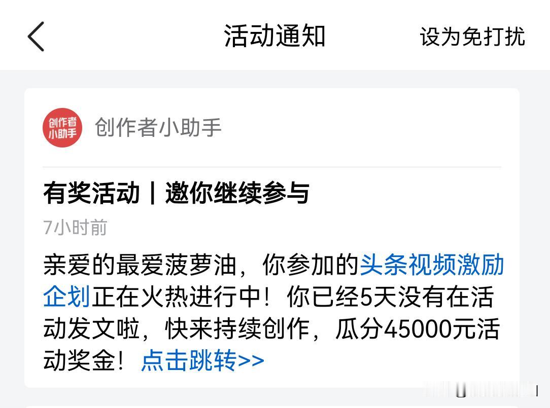 总奖金4.5万元,发视频每天赢流量分666元!“头条视频激励企划”活动,你参加了吗? 今天上午收到“创作者小助手”发来活动通知:有奖活动,邀你继续参与! “亲爱的最爱菠萝油,你参加的头条视频激励企划正在火热进行中!你已经5天没有在活动发文啦,快来持续创作,瓜分45000元活动奖金!” “头条视频激励企划”这个活动的奖金还蛮丰厚,总奖金4.5万元,发视频每天赢流量分666元。 活动时间截止到12月17日结束,仔细一看,参加活动的人还挺多的,209.7万人参与! 总奖金4.5万,209.7万人参加,平均每人可刮分0.02元! 这么一算,还有动力参加吗? 然而,思想很懈怠,身体却很重要勤快! 动动手指的事情,随手一拍也就发了一个视频,也算是积极参与了这个活动,没有辜负创作者小助手的诚意邀请。 咱们主打的就是一个:双向奔赴!礼尚往来! 只要你敢邀请,我就敢参加! 希望在不久的将来能收到0.02元的奖金,到那时再发文记录一下吧!