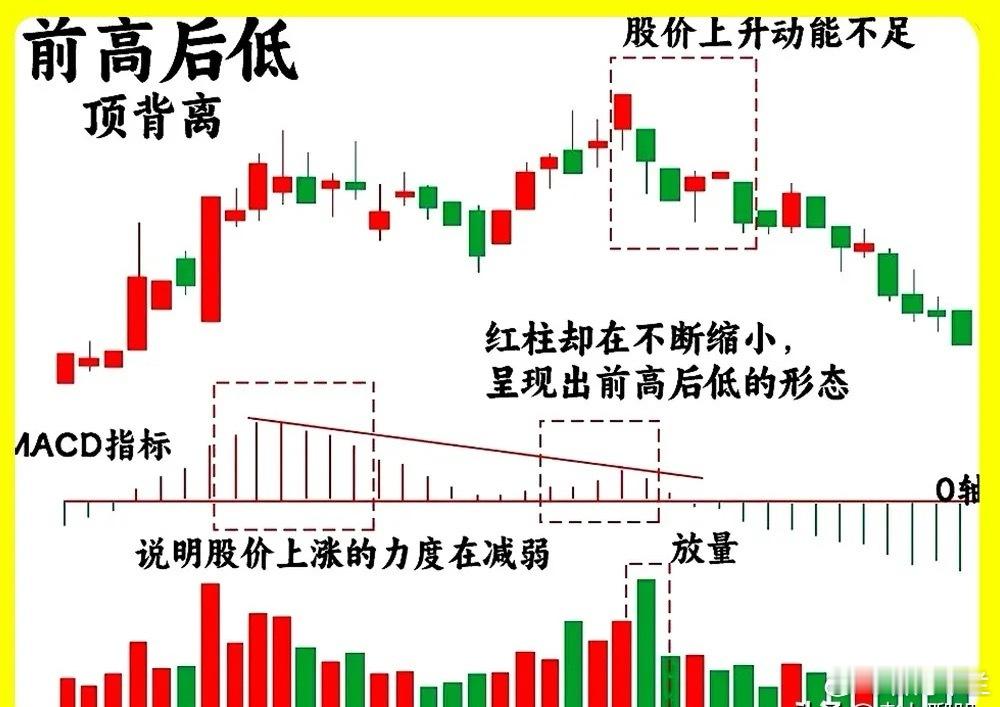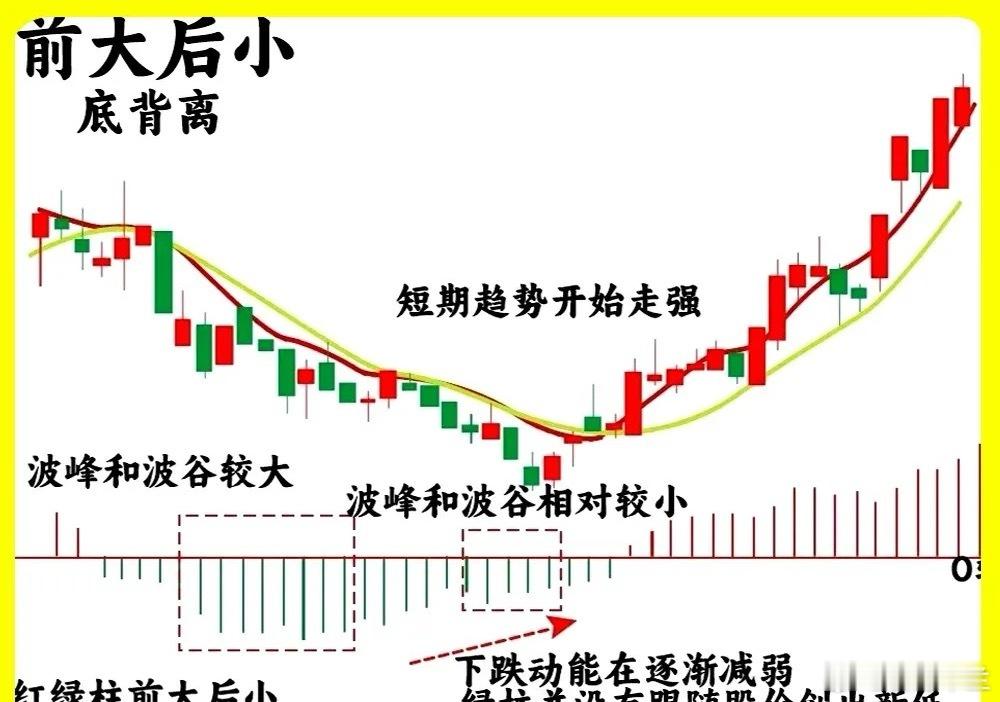注意了!在MACD指标中,市场上流传着一句经典的口诀,可以说这两个形态是指标走势中,最为特别,最为好记忆的形态走势。这句口诀就是“前大后小金叉就搞,前高后低放量就跑。这句话是什么意思呢?我们今天就一起看看首先我们先来简单了解一下MACD指标。MACD指标号称指标之王,它是有五部分组合,快线、慢线、零轴、红柱和绿柱。而零轴是一个关键点位。我们来说说前大后小金叉就搞什么样的形态前大,是指的指标出现金叉之前,在零轴的下方,绿柱很大,时间比较长,导致快慢线相隔的距离比较远,说明这个阶段多空力量比较强,是持续的释放。后小,是指的在前大的绿柱后面有再次出现绿柱,这里的绿柱体积和时间比较短,说明此时的空方力量开始变弱,甚至出现红柱。后面的绿柱小于前面的绿柱,跟着就是快线快速和慢线靠近。总的来说这样的两个绿柱,代表空方力量的衰竭,左侧转右侧的一个逻辑前高后低放量就跑是什么意思呢前高是指的快慢线或者是红柱的高点,在健康的指标走势里,股价在上涨趋势里,股价创出新高,而红柱也会同步创出新高,形成阶段高点,后低是指的是,股价继续创出新高,而红柱,并没有同步创出新高,而是比前面的红柱要小,这个典型的指标背离,说明此时的多方力量开始减弱。这种指标走势,一般会出现上涨趋势的末期或是高位震荡阶段所以,后市出现放量下跌,那说明空方力量开始不计后果的出货了。好了!以上就是MACD指标中红绿柱形态,如果你对红绿柱还不熟悉,那下方的这两个案例图,就要一定要牢记。希望对大家有启发和帮助,也是最为基础的内容,一定吃透。我们下期内容再见