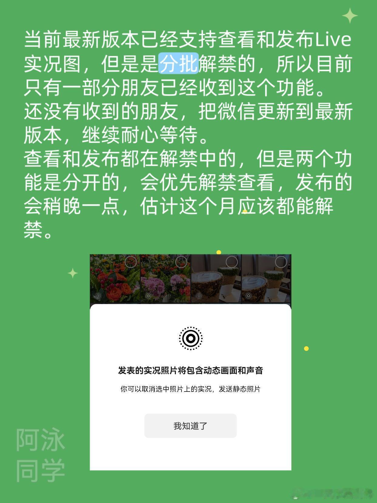 鸿蒙版微信已支持朋友圈Live实况图鸿蒙版微信当前最新版本8.0.13.34,已经支持查看和发布Live实况图,但是是分批解禁的,所以目前只有一部分朋友已经收到这个功能。还没有收到的朋友,把微信更新到最新版本,继续耐心等待。查看和发布都在解禁中的,但是两个功能是分开的,会优先解禁查看,发布的会稍晚一点,估计这个月应该都能解禁。
