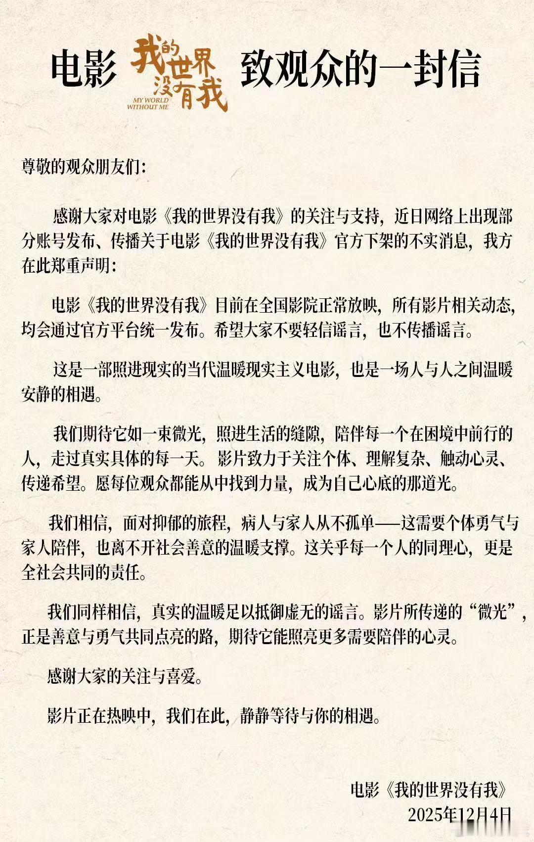 《我的世界没有我》热映中!这部温暖现实主义电影,以真实触碰心灵,以善意对抗虚无。不信谣不传谣,让每一份理解与陪伴,成为抵御困境的光。