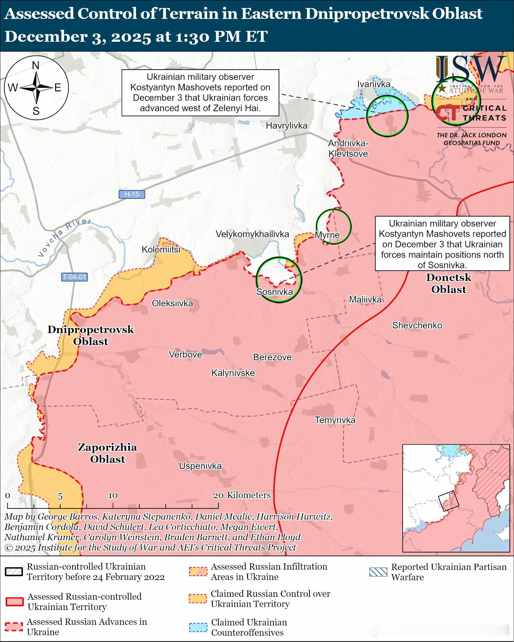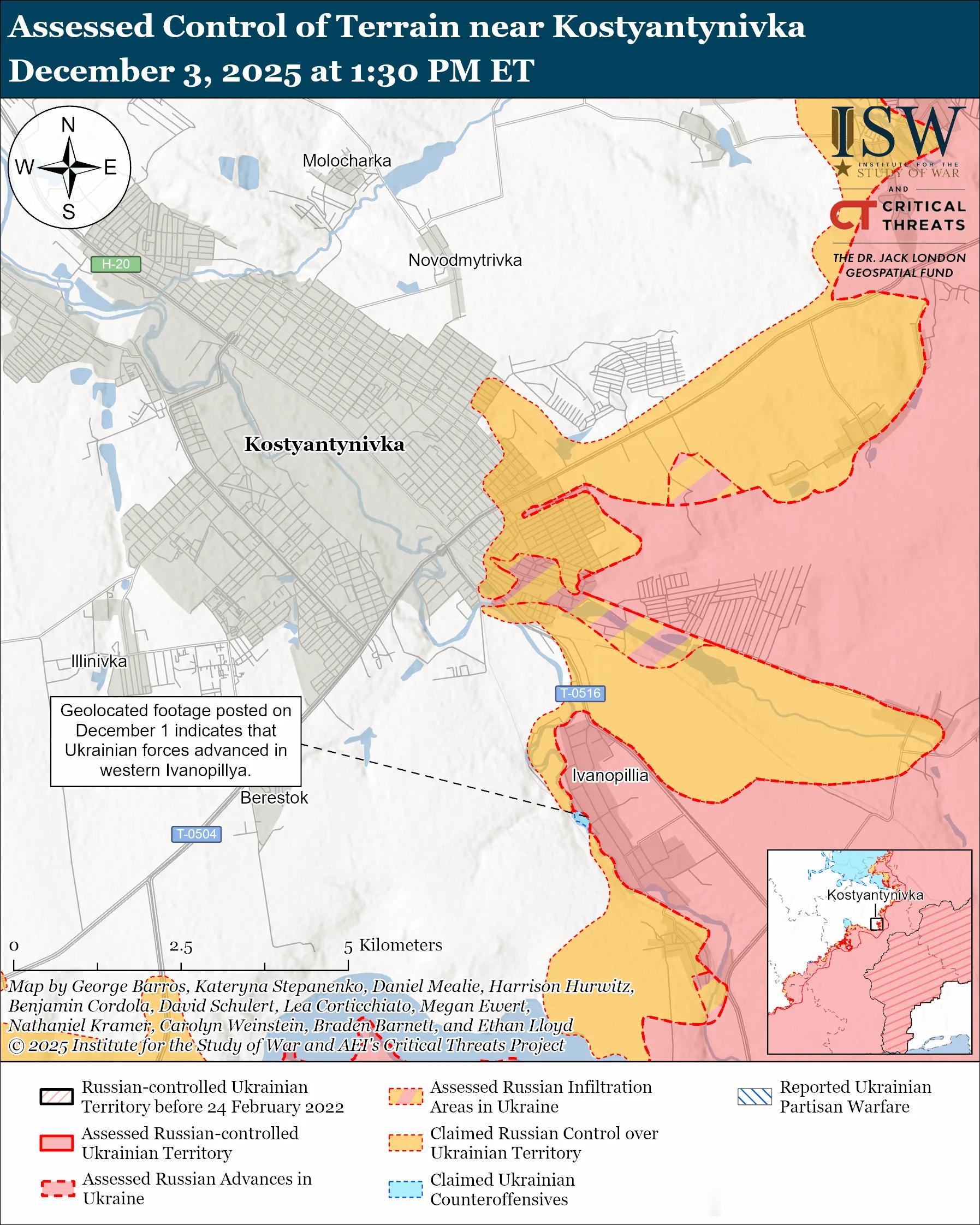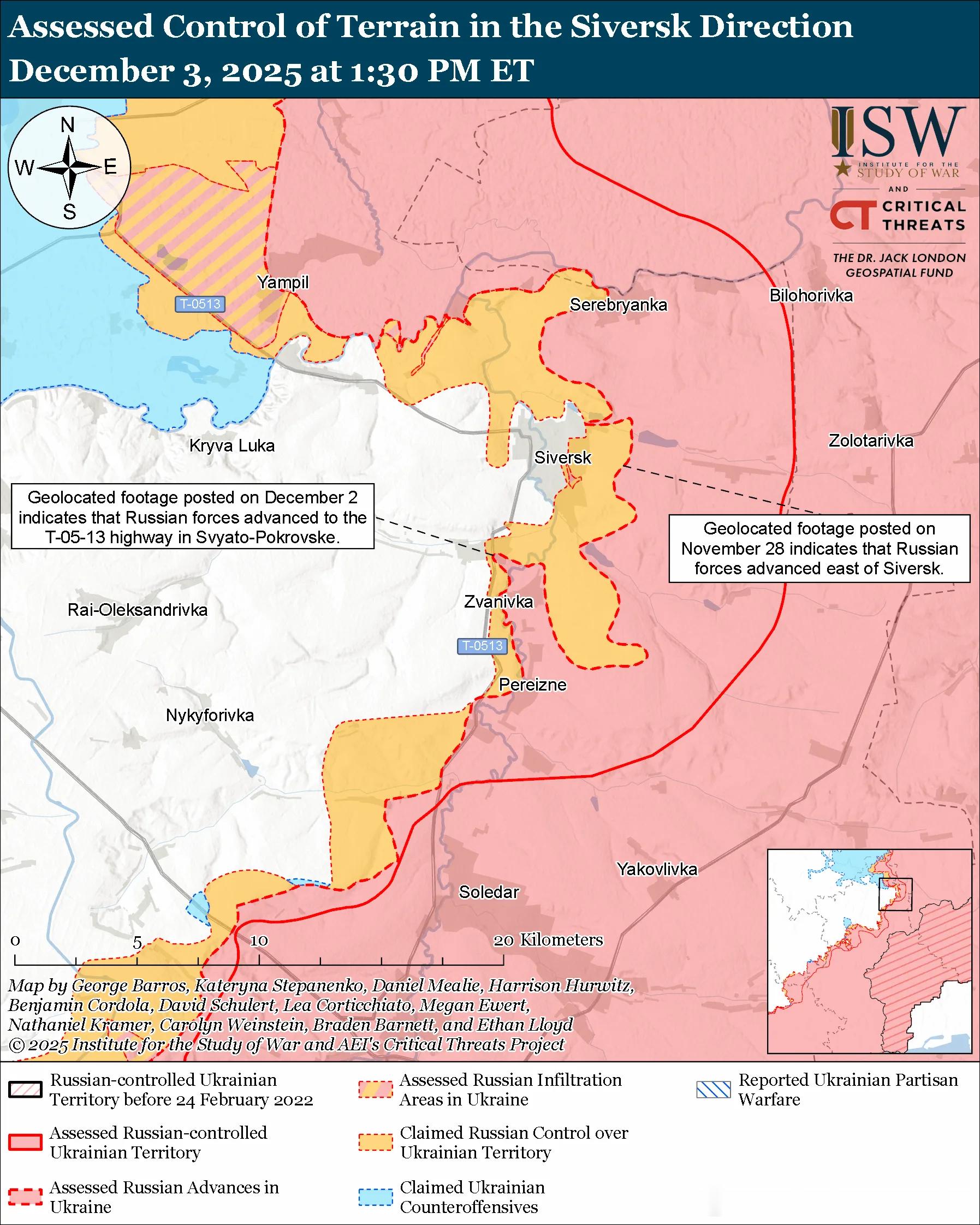 俄军主要行动3俄军目标:占领顿涅茨克州全境,并向第聂伯罗彼得罗夫斯克州推进。俄军最近向锡维尔斯克方向推进。评估俄军进展:11 月 28 日发布的地理定位视频显示,俄军在锡韦尔斯克以东取得了小幅进展。12 月 2 日发布的其他地理定位视频显示,俄军第 88 摩步旅(第 3 合成集团军 [CAA],南部军区 [SMD])在斯维亚托-波克罗夫斯克东部(锡韦尔斯克西南)取得了进展。未经证实的说法:俄罗斯军事博客作者声称,俄军在锡维尔斯克中部和南部以及斯维亚托-波克罗夫斯克中部的 T-0513 锡维尔斯克-莱曼公路沿线推进。一位俄罗斯军事博客作者声称,俄军已经占领了斯维亚托-波克罗夫斯克的一半。12月2日和3日俄军在锡韦尔斯克附近及城内发动进攻;在锡韦尔斯克西北部的德罗尼夫卡、普拉托尼夫卡和扎基特涅附近发动进攻;在锡韦尔斯克东北部的谢列布里扬卡附近发动进攻;在锡韦尔斯克西南部的费多里夫卡和斯维亚托-波克罗夫斯克附近发动进攻。俄罗斯军事博客作者声称,俄军切断了乌克兰通往锡维尔斯克的主要地面交通线,迫使乌克兰军队通过田野进行后勤补给。ISW 评估认为,这些打击很可能是俄军更广泛的战场空中封锁行动的一部分,旨在削弱乌克兰的后勤能力,以便将来在锡维尔斯克方向发动地面进攻。作战序列:俄第6摩步旅(第3集团军,SMD)的FPV无人机操作员正在打击锡维尔斯克北部的乌克兰阵地。第123摩步旅(第3集团军)的FPV无人机操作员正在打击锡维尔斯克以东的乌克兰车辆和飞行器。乌克兰军队最近向科斯特扬季尼夫卡-德鲁日基夫卡战术区推进。评估乌克兰的进展:12 月 1 日发布的地理定位视频显示,乌克兰军队在伊万诺皮利亚西部(科斯蒂安蒂尼夫卡东南部)取得了进展。未经证实的说法:一位俄罗斯军事博主声称,俄军占领了奥列克桑德罗-舒尔蒂涅(科斯蒂安蒂尼夫卡以东),并向伊万诺皮利亚以北推进。俄罗斯声称占领的区域范围:11 月 28 日发布、12 月 3 日定位的视频显示,乌克兰军队在科斯蒂安蒂尼夫卡南部的 T-0516 托列茨克-科斯蒂安蒂尼夫卡公路沿线保持阵地并推进——此前俄方声称俄军在该地区驻扎。俄军攻击了科斯特扬季尼夫卡附近;从Kostyantynivka以北前往Klynove和Virolyubivka; Kostyantynivka 东北部,Chasiv Yar 附近; Kostyantynivka 以东,靠近 Oleksandro-Shultyne;位于 Kostyantynivka 东南部,靠近 Shcherbynivka 和 Pleshchiivka; Kostyantynivka 以南,靠近 Yablunivka; Kostyantynivka西南方向Stepanivka; Druzhkivka以南,靠近Rusyn Yar;位于 Druzhkivka 西南部,靠近 Sofiivka 和 Volodymyrivka;从 Druzhkivka 以西前往 Torske 和 Novopavlivka。12 月 2 日发布的地理定位视频显示,乌克兰无人机操作员在波皮夫亚尔(德鲁日基夫卡西南)附近击退了俄军一个排级规模的机械化进攻,进攻方向可能是弗拉基米里夫卡。在波克罗夫斯克附近作战的一个乌克兰旅报告称,乌克兰军队摧毁了一辆俄军 MTU-72 架桥车、一辆坦克和一辆步兵战车。作战序列:俄军车臣第78北艾哈迈德摩步团(第42摩步师,第58集团军)第1营,以及第1194摩步团(第4摩步旅,第3集团军)的无人机操作员正在伊万诺皮利亚打击乌克兰阵地。 第238炮兵旅(第8集团军)的FPV无人机操作员正在索菲伊夫卡附近打击乌克兰阵地。第4摩步旅“胡金斯”FPV突击排的无人机操作员正在科斯蒂安蒂尼夫卡和伊万诺皮利亚打击乌克兰阵地。12月3日俄军继续在多布罗皮利亚战术区开展进攻行动,但并未取得进展。12月2日和3日,俄军在多布罗皮利亚东北部的托列茨克附近、多布罗皮利亚东部的沙霍韦附近以及多布罗皮利亚东南部的马亚克附近发动了进攻。战斗序列:据报道俄第150摩步师(第8集团军,SMD)第174独立侦察营正在多布罗皮利亚突出部作战。乌克兰和俄罗斯军队最近分别向波克罗夫斯克方向推进。评估乌克兰的进展:12 月 2 日发布的地理定位视频显示,乌克兰军队向乌达奇内(波克罗夫斯克西南)以北推进。评估俄罗斯的进展:12 月 3 日发布的地理定位视频显示,俄罗斯军队可能占领了莫洛杰茨克(波克罗夫斯克西南)。12月2日和3日俄军在波克罗夫斯克附近及城内发动进攻;在波克罗夫斯克西北部靠近格里申内及谢尔盖伊夫卡方向发动进攻;在波克罗夫斯克北部靠近罗丁斯克方向发动进攻;在波克罗夫斯克东北部靠近切尔沃尼(克拉斯尼)莱曼和新经济城方向发动进攻;在波克罗夫斯克东部靠近米尔诺赫拉德和里夫内方向发动进攻;在波克罗夫斯克西南部靠近科特利涅、乌达奇涅和莫洛杰茨克方向发动进攻。一位俄罗斯军事博客作者声称,乌克兰军队从格里申内到罗丁斯克以及沿着科特利涅-乌达奇涅一线发动反击。12月3日在波克罗夫斯克方向作战的乌军旅发言人报告称,俄军正利用恶劣天气掩护阵地,并以小股部队发起攻击。该发言人指出,乌克兰军队近日阻止了一队俄军装备向战线推进。12月3日在波克罗夫斯克方向作战的乌军旅一名军官报告称,波克罗夫斯克方向局势依然紧张,俄军继续优先考虑战术上的胜利,以削弱乌克兰的谈判地位。该军官指出,俄军的“波克罗夫斯克-阿布哈兹 ...沙波瓦尔表示,乌克兰军队仍然控制着波克罗夫斯克北部地区,并已组织额外的后勤路线,为波克罗夫斯克和米尔诺赫拉德的乌克兰部队提供补给。作战序列:据报道俄第 132 摩步旅(第 51 集团军,SMD)第 3 营和第 5 摩步旅(第 51 集团军)的 FPV 无人机操作员和其他部队正在米尔诺赫拉德附近