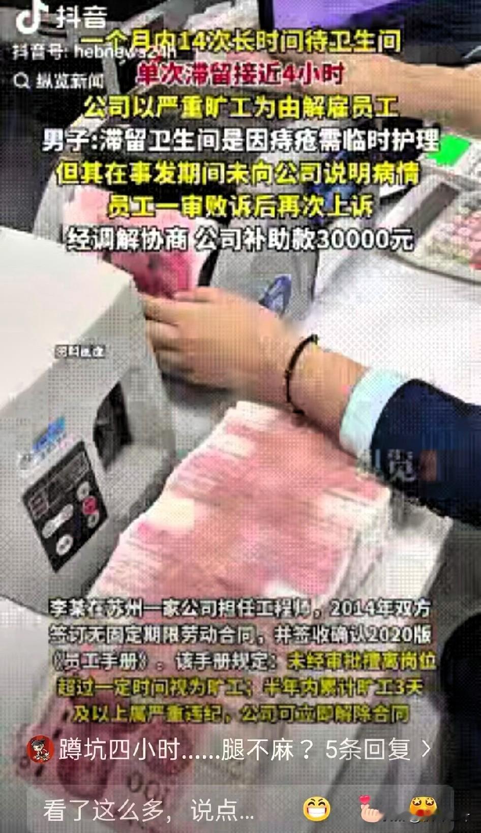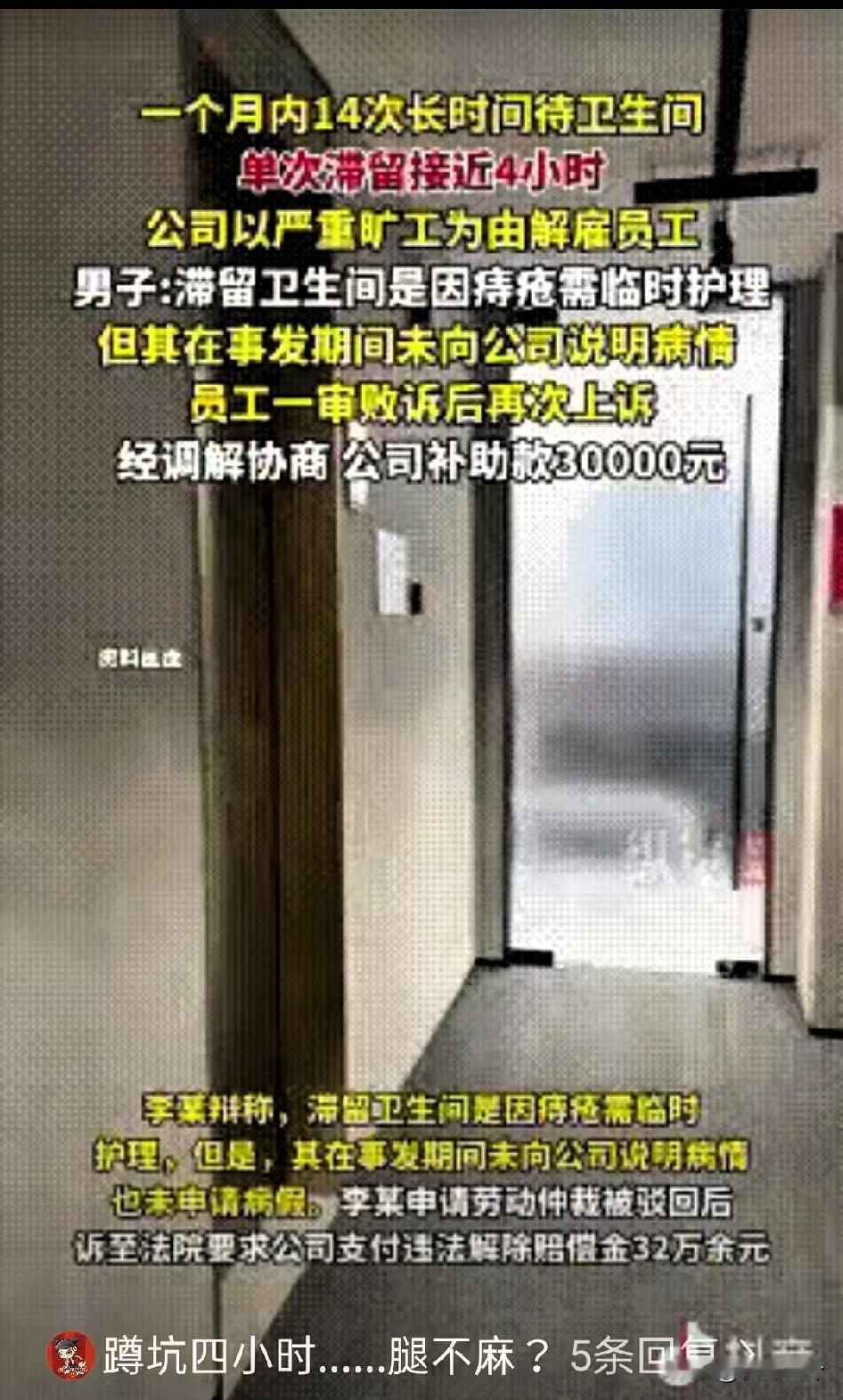 江苏苏州,男子上班期间单次在卫生间滞留近4小时,一个月内出现14次类似情况,这名十年老工程师因此被公司以严重旷工解雇,他以痔疮为由索赔32万,最终经法院调解仅获3万补助,这件事给所有职场人都提了个醒。 这名工程师李先生在科技公司任职十余年,还签订了无固定期限劳动合同,职场稳定性本应很强。 2024年4月至5月,他频繁长时间待在卫生间,最长一次接近4小时,公司多次通过微信联系他都未得到回应。其工程师岗位需要随时响应工作需求,他的长时间失联打乱了团队工作节奏,还造成了部分工作延误,影响了公司正常业务推进。 事后李先生拿出配偶的痔疮购药记录,以及2024年6月和2025年1月的住院手术证明,以此说明离岗是因病情所需。但关键问题在于,事发期间他从未向公司报备过病情,也没有按流程申请病假或事假,全程都是擅自离岗,并未遵守公司既定的规章制度。 这事儿的核心矛盾,是职场健康需求与岗位责任、公司制度的平衡。员工有维护自身健康的权利,但不能以无视规则的方式离岗; 公司有管理职场秩序的权力,同时也应给特殊健康状况员工预留沟通渠道。李先生的维权失利,核心原因就是他把合理的健康诉求变成了违规操作,即便有真实病情,程序上的缺失也让他失去了维权的核心底气。 最终的3万补助,是企业基于其十年工龄给出的人道性让步,并非法律层面的违法解约赔偿。这也印证了职场沟通和流程合规的重要性,身体有恙可以理解,但职场规则和沟通步骤不能省略。 你们觉得如果李先生当初提前向公司报备病情并按流程请假,这件事会不会有不一样的结果?