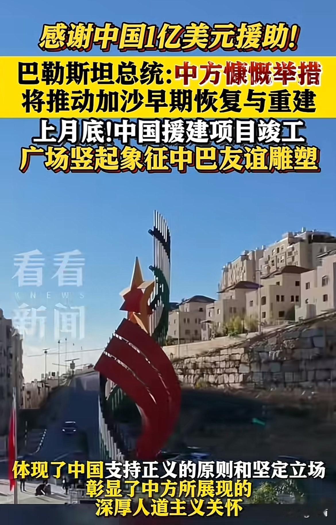 出钱又出力!中国对巴勒斯坦确实是掏心窝子的好呀。去年10月份开始冒着炮火援建公路,整整一年的时间,今年11月份才把路打通。为了表示感谢,广场上树立了象征中巴友谊的雕像。 现在又宣布再给1亿美元的人道主义援助。 这让巴勒斯坦总统阿巴斯很高兴,他专门写信表示了感谢,并强调了这笔钱的用途-用于加沙地带的建设。
