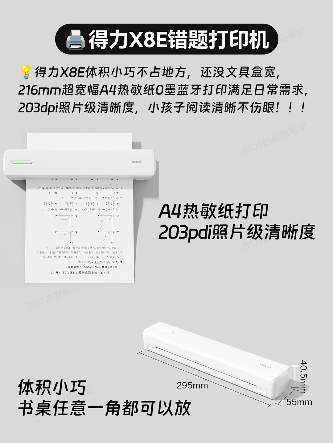 得力X8E体积小巧不占地方,还没文具盒宽,216mm超宽幅A4热敏纸0墨蓝牙打印满足日常试卷打印需求,203dpi照片级清晰度,小孩子阅读清晰不伤眼!自带亿量级免费题库