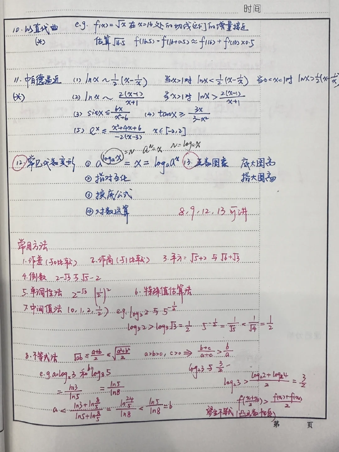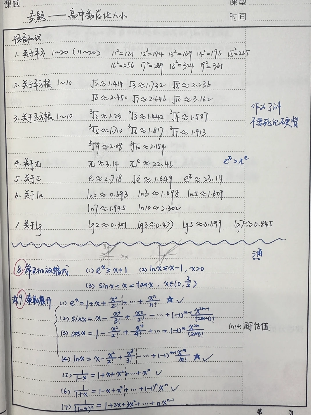 这是高考的热门考点,而且近年来难度很大,难在不容易找到合适的方法。 目前还没有学导数,所以上面五种方法给学生讲一下,另外泰勒展开,常见放缩式,可以给学生提一下,方便估值。 还去查找了一些常用数值,不过不推荐让学生记忆。