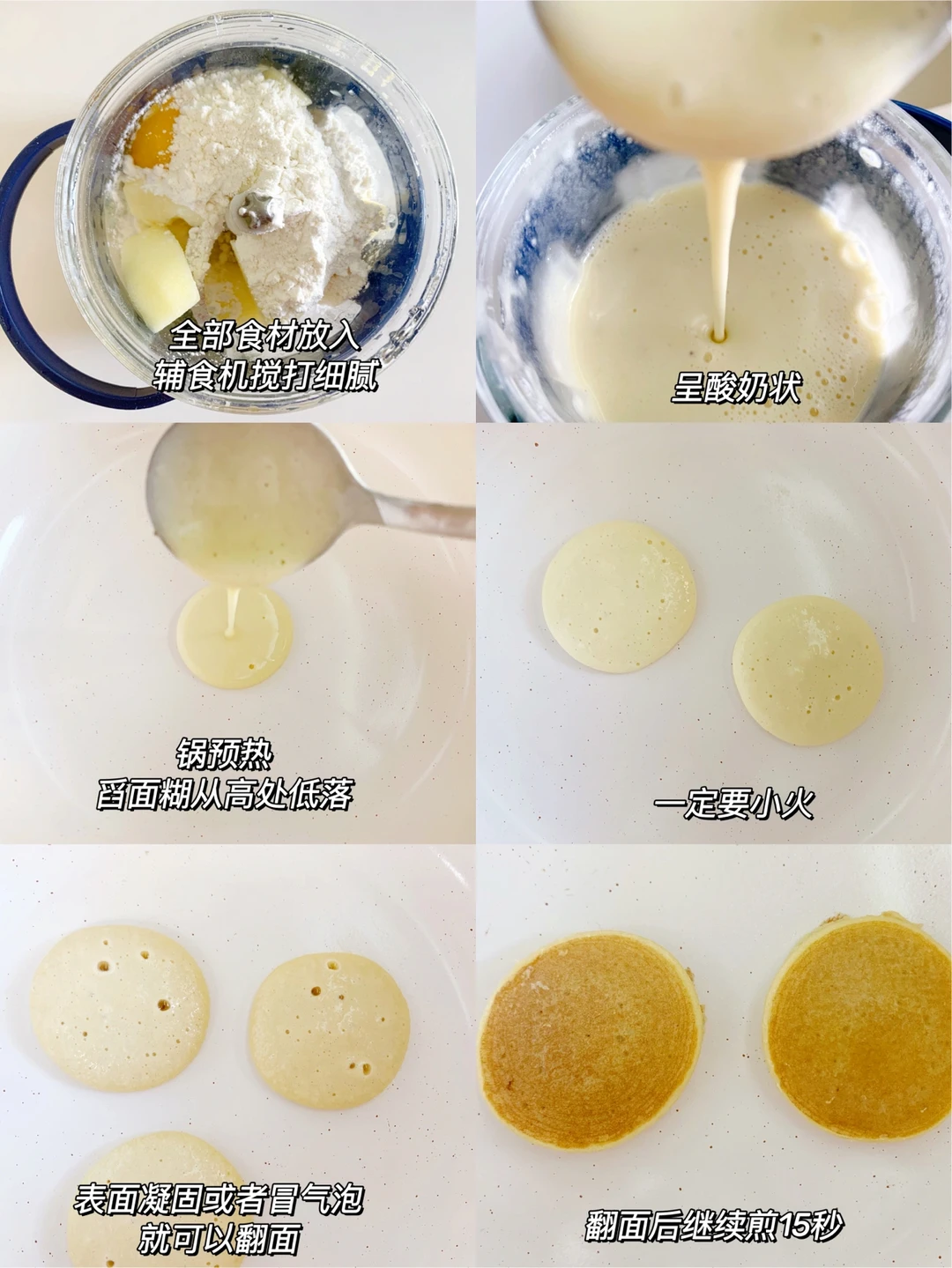 2⃣️锅开最小火预热,舀入一勺面糊,从高处低落自动成圆形,煎至表面凝固或者冒气泡就可以翻面,翻面后继续煎15秒至熟即可