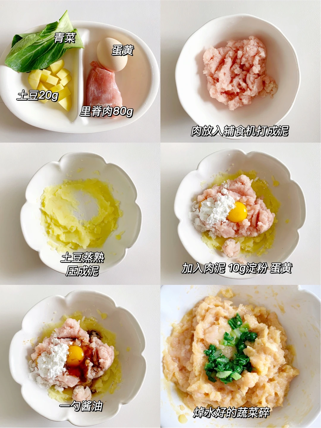 1⃣️把肉放入辅食机搅打细腻,土豆蒸熟压成泥,放入肉泥,蛋黄,10克淀粉,一勺酱油,焯水好的蔬菜碎,顺着一个方向搅拌上劲