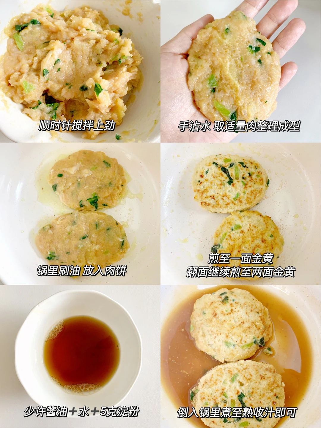 3⃣️锅里刷油,放入肉饼,煎至底部金黄,翻面继续煎至两面金黄