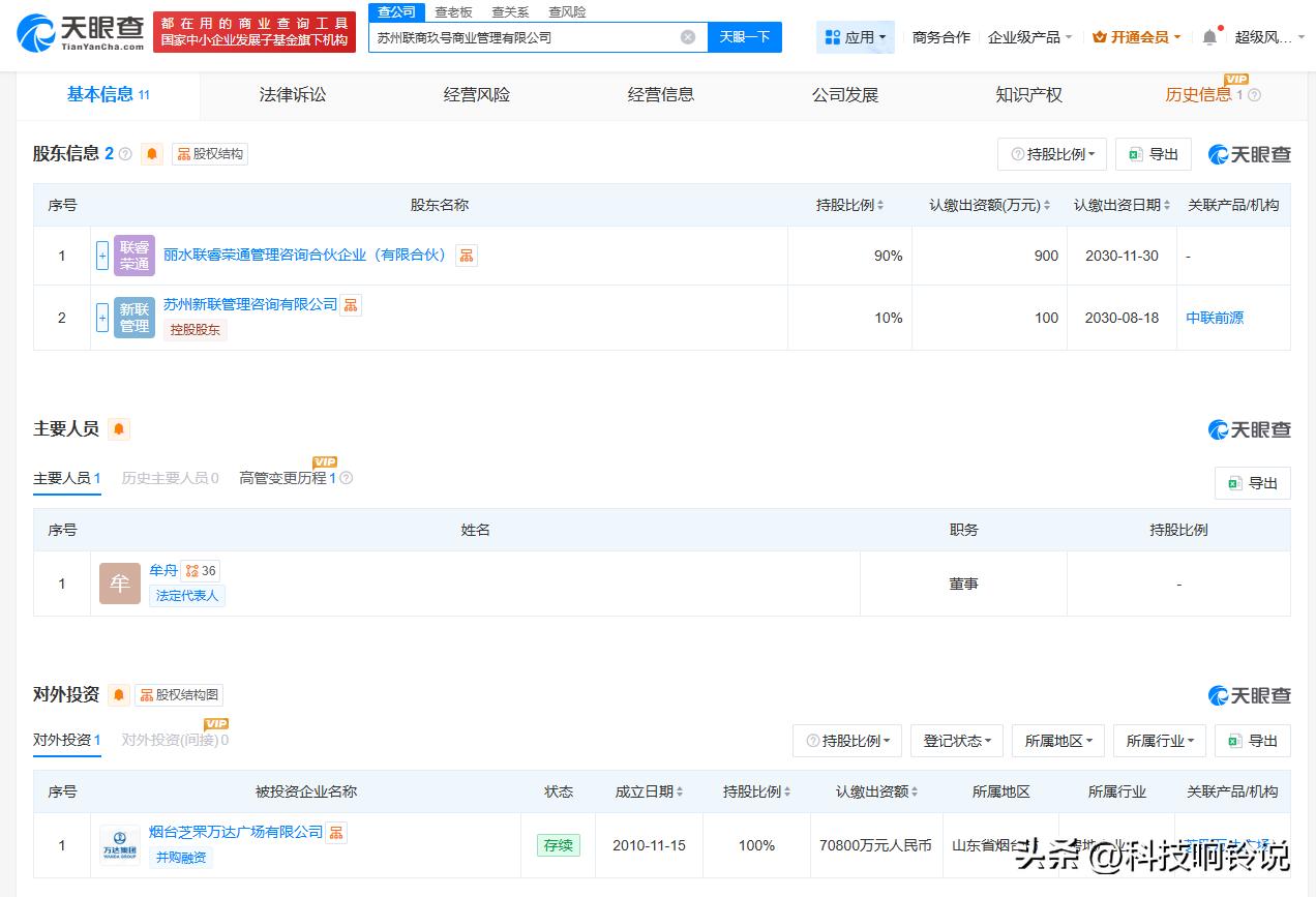 【万达赎回万达广场后又转让 万达再次转让烟台芝罘万达广场】 天眼查工商信息显示,12月3日,烟台芝罘万达广场有限公司再次发生工商变更,上海万达锐驰企业管理有限公司退出股东行列,新增苏州联商玖号商业管理有限公司全资持股,同时法定代表人、主要人员也发生变更。变更记录显示,12月2日,该公司原股东坤华(天津)股权投资合伙企业(有限合伙)、坤元辰兴(厦门)投资管理咨询有限公司退出,由上海万达锐驰企业管理有限公司全资持股。 苏州联商玖号商业管理有限公司成立于今年8月,法定代表人为牟舟,注册资本100万人民币,经营范围包括商业综合体管理服务、企业管理咨询、经济贸易咨询等。股东信息显示,该公司由浙商金汇信托股份有限公司旗下丽水联睿荣通管理咨询合伙企业(有限合伙)和苏州新联管理咨询有限公司共同持股。此前,浙金信托旗下苏州联商柒号商业管理有限公司已接手大连统南企业管理有限责任公司、大连万颛企业管理有限公司。 天眼查信息: