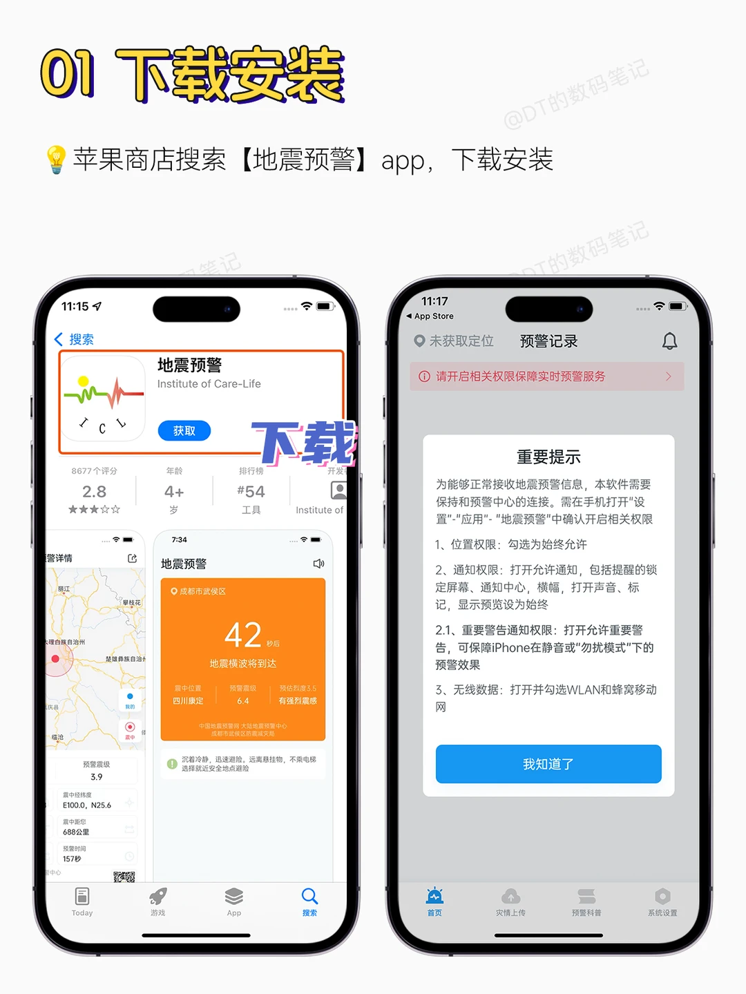 1️⃣app store下载“地震预警”app,成都高新减灾研究所研发的(可安心下载)