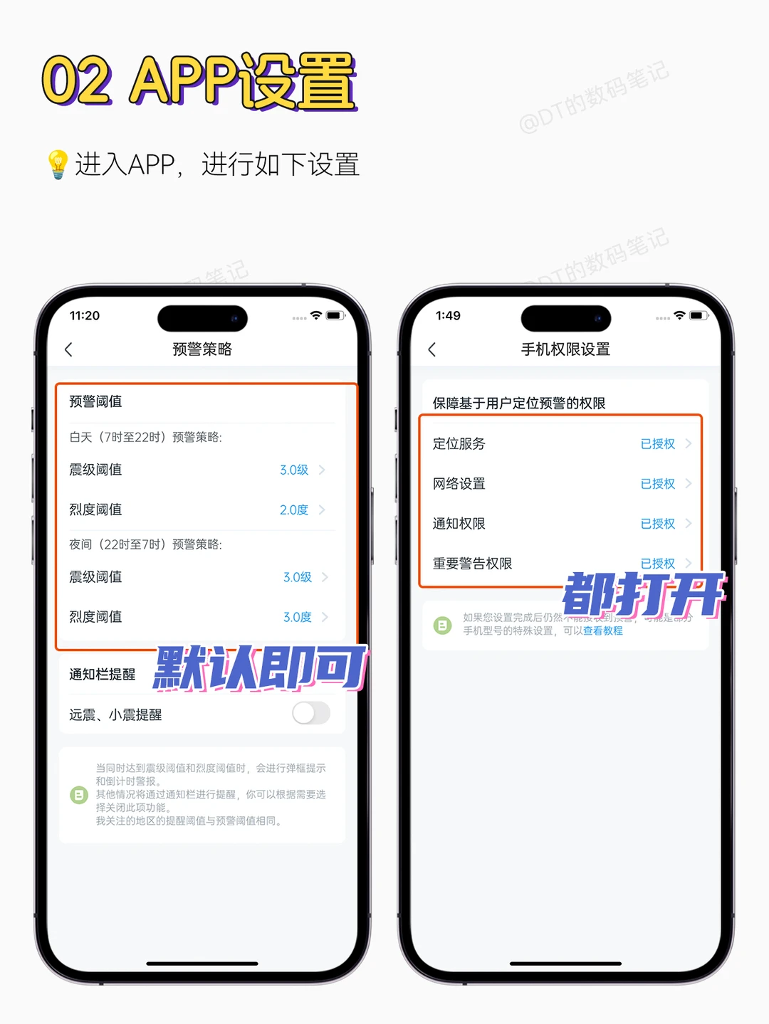 2️⃣进入地震预警app,【系统设置】的【预警策略】默认值即可;【手机权限设置】里的定位、网络、通知、重要警告全授权