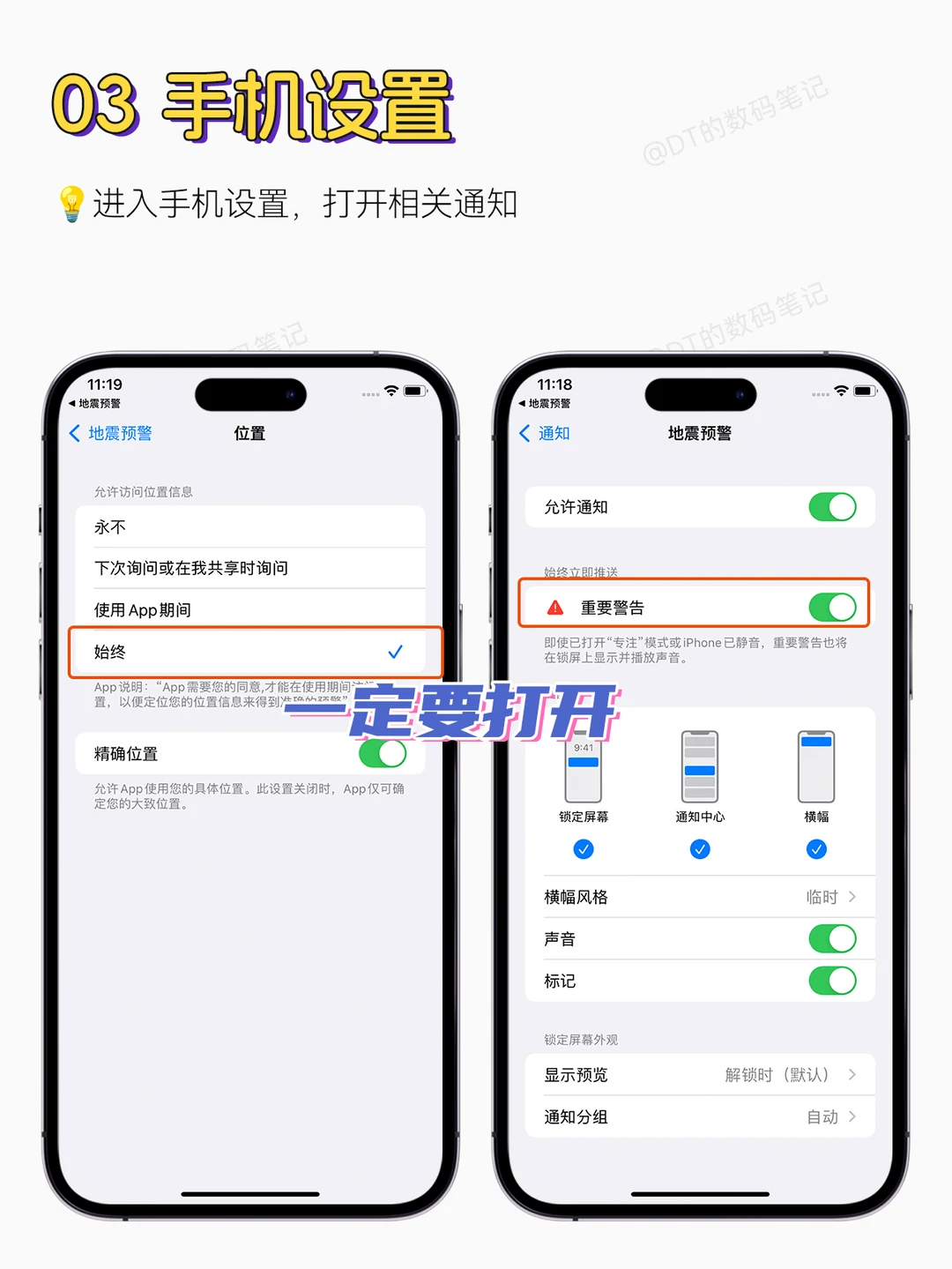 3️⃣打开手机系统【设置】-【地震预警】-【位置】-调整为【始终】