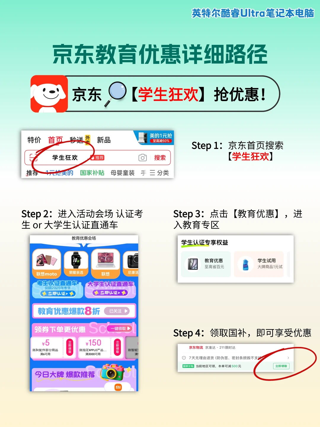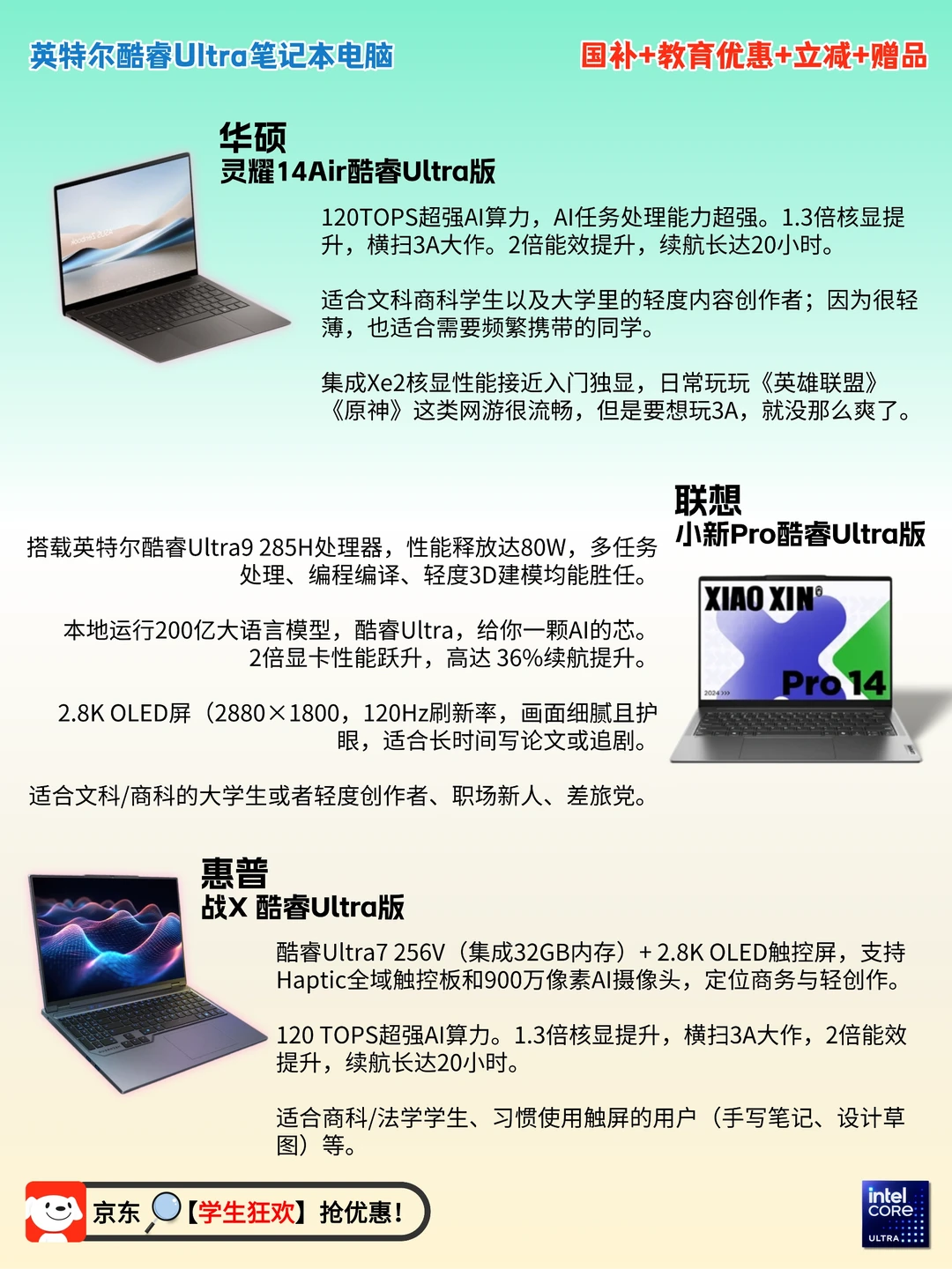 而且现在酷睿Ultra系列国补立省20%!还有晒单返百元E卡,英特尔专享教育优惠等活动[哇R]趁着这么大的优惠补贴力度,赶紧上京东🔍【学生狂欢】冲吧!