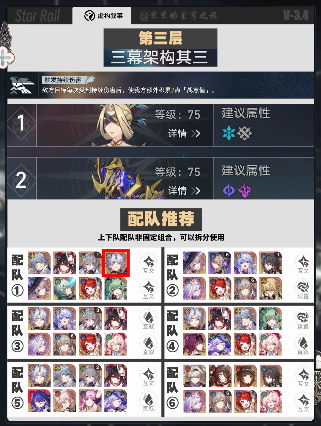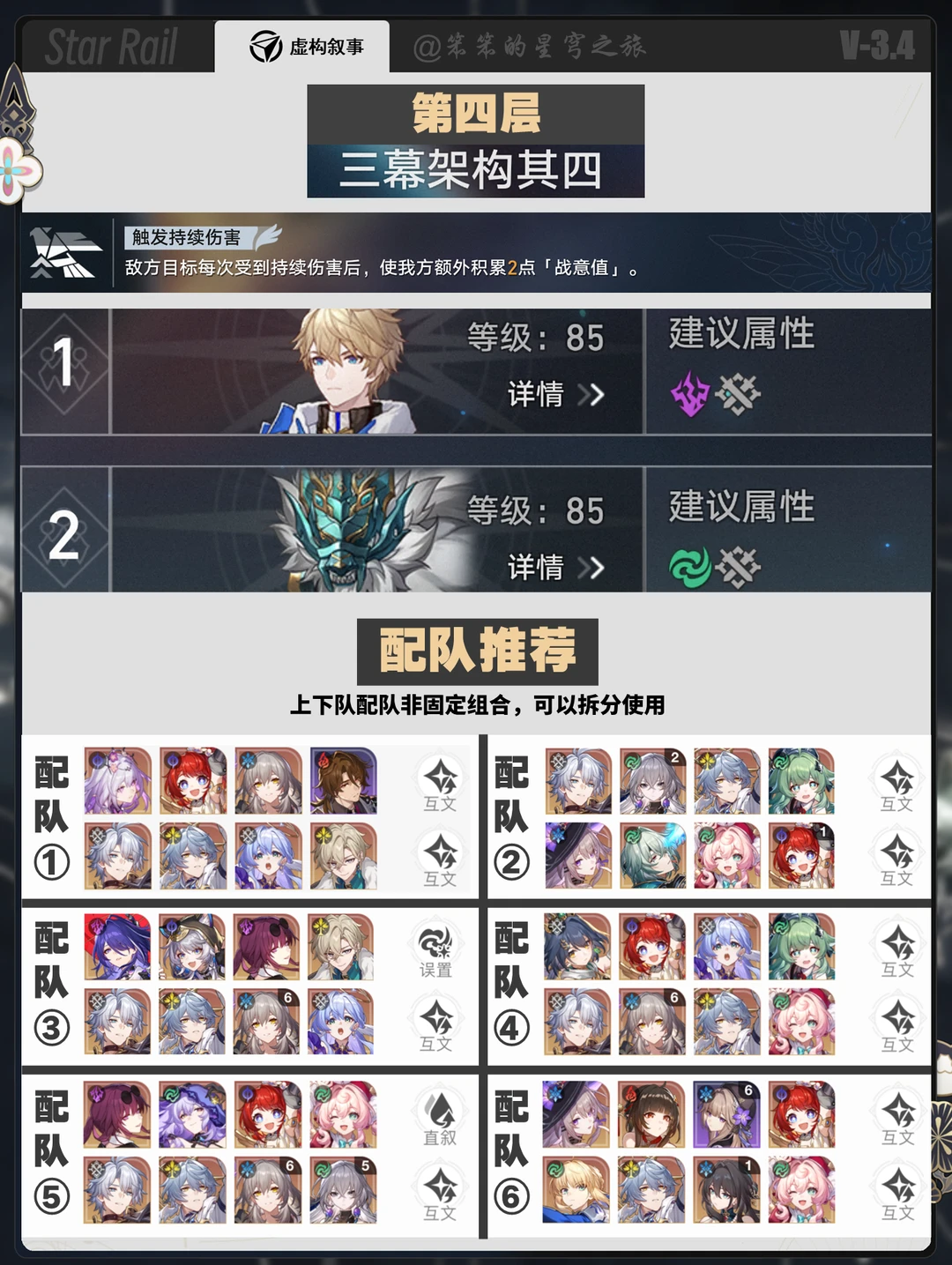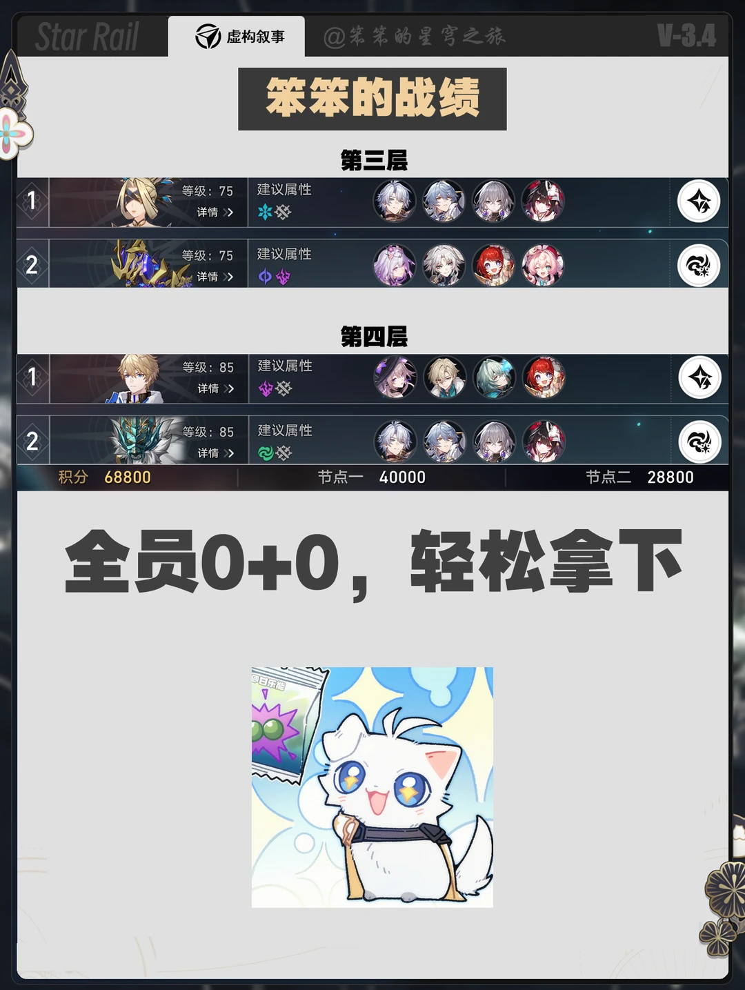 🐱大家好,我是笨笨的铲屎官 新的一期虚构叙事上线了 这一期居然是dot的环境 卡黑、黄泉+dot都可以打 其他的包括白厄、大黑塔、遐蝶都可以一战 巡猎的archer打虚构就不太合适了 但是Saber在第四层风弱可以打 来分享一下你的配队吧