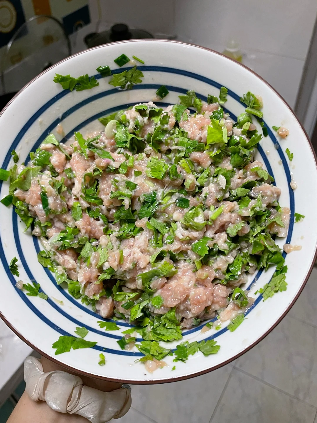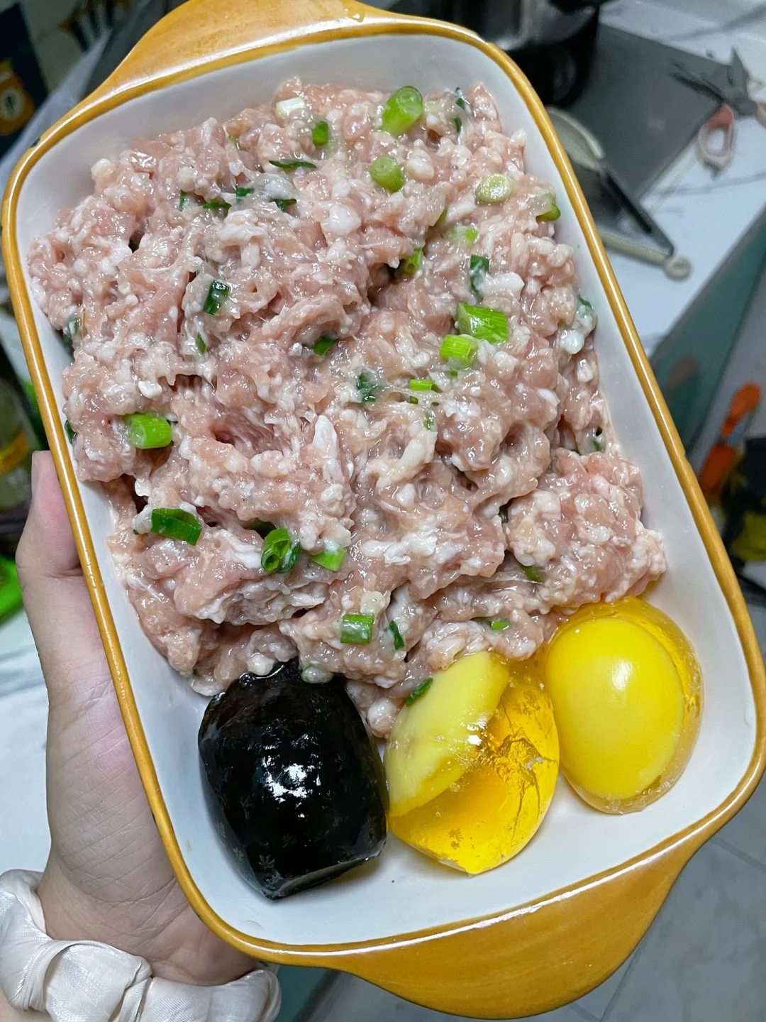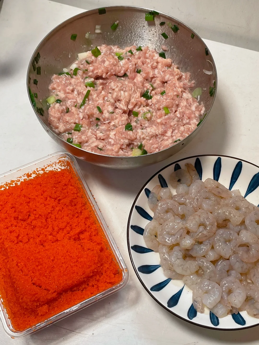 肉馅儿就完成了!再根据个人爱好搭配虾仁鱼子,皮蛋,香菜,或者以上混搭。
