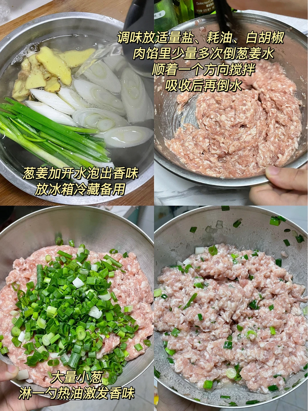 2️⃣肉馅儿里根据自己口味放盐,耗油,白胡椒调味,再少量多次加入葱姜水顺着一个方向搅拌上劲。
