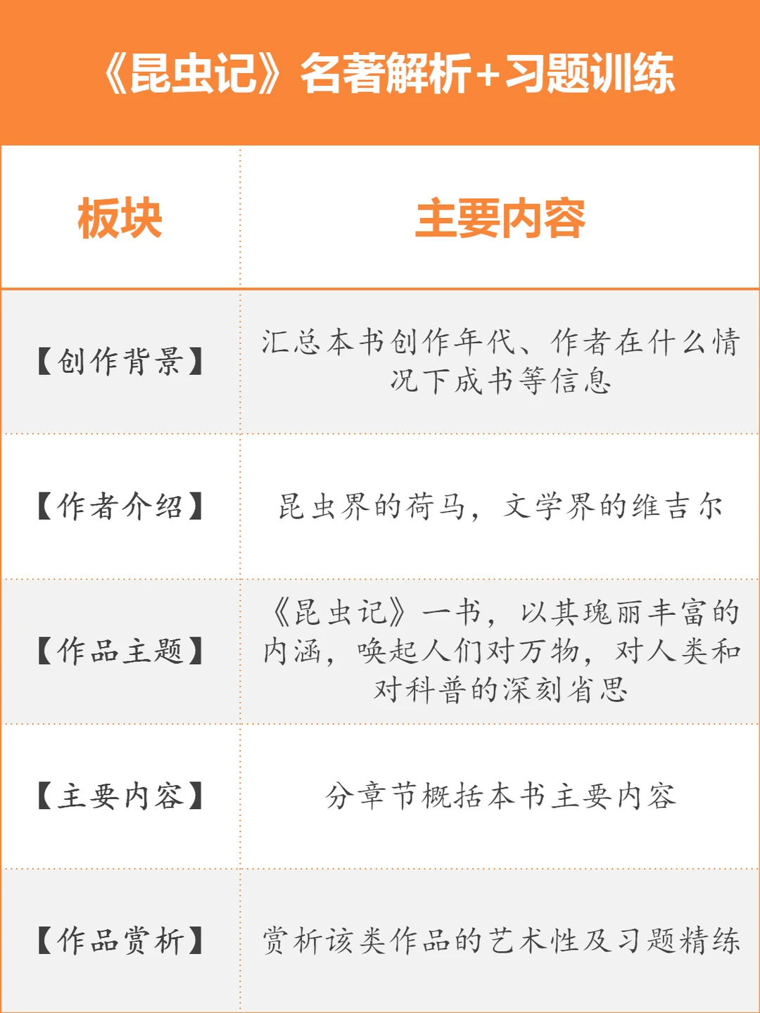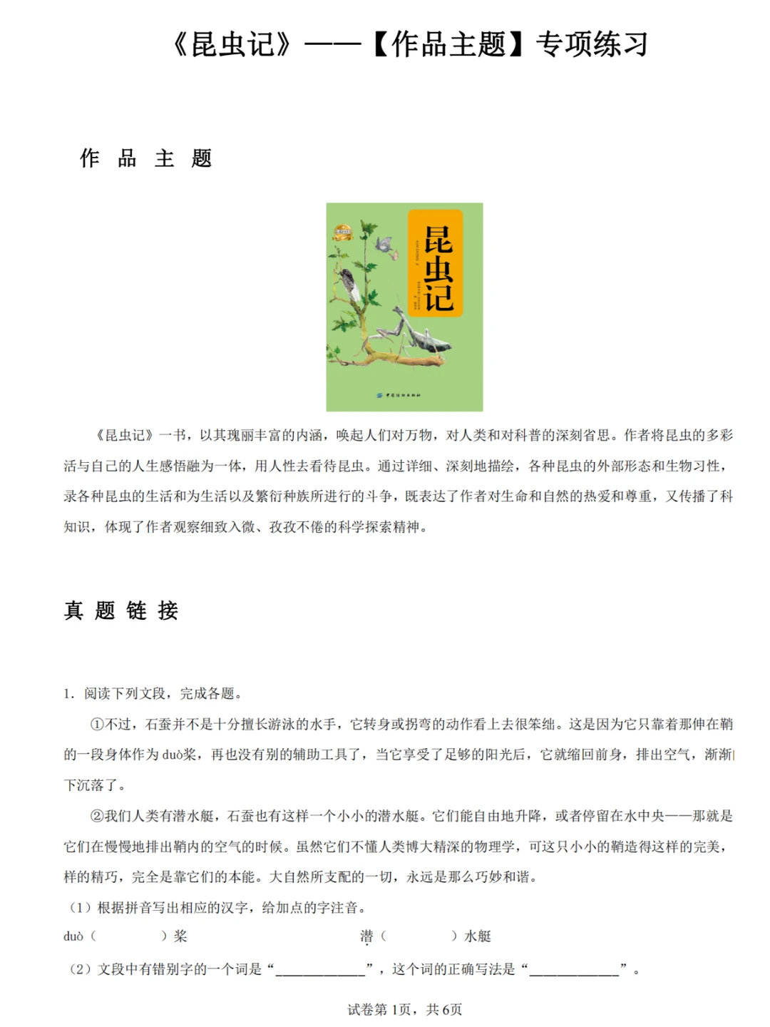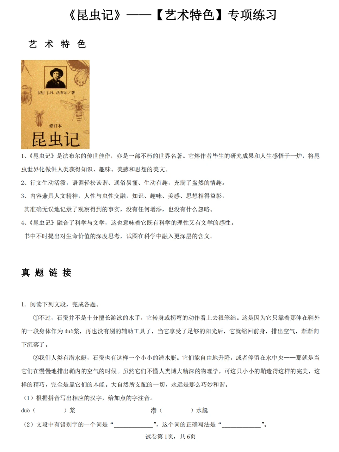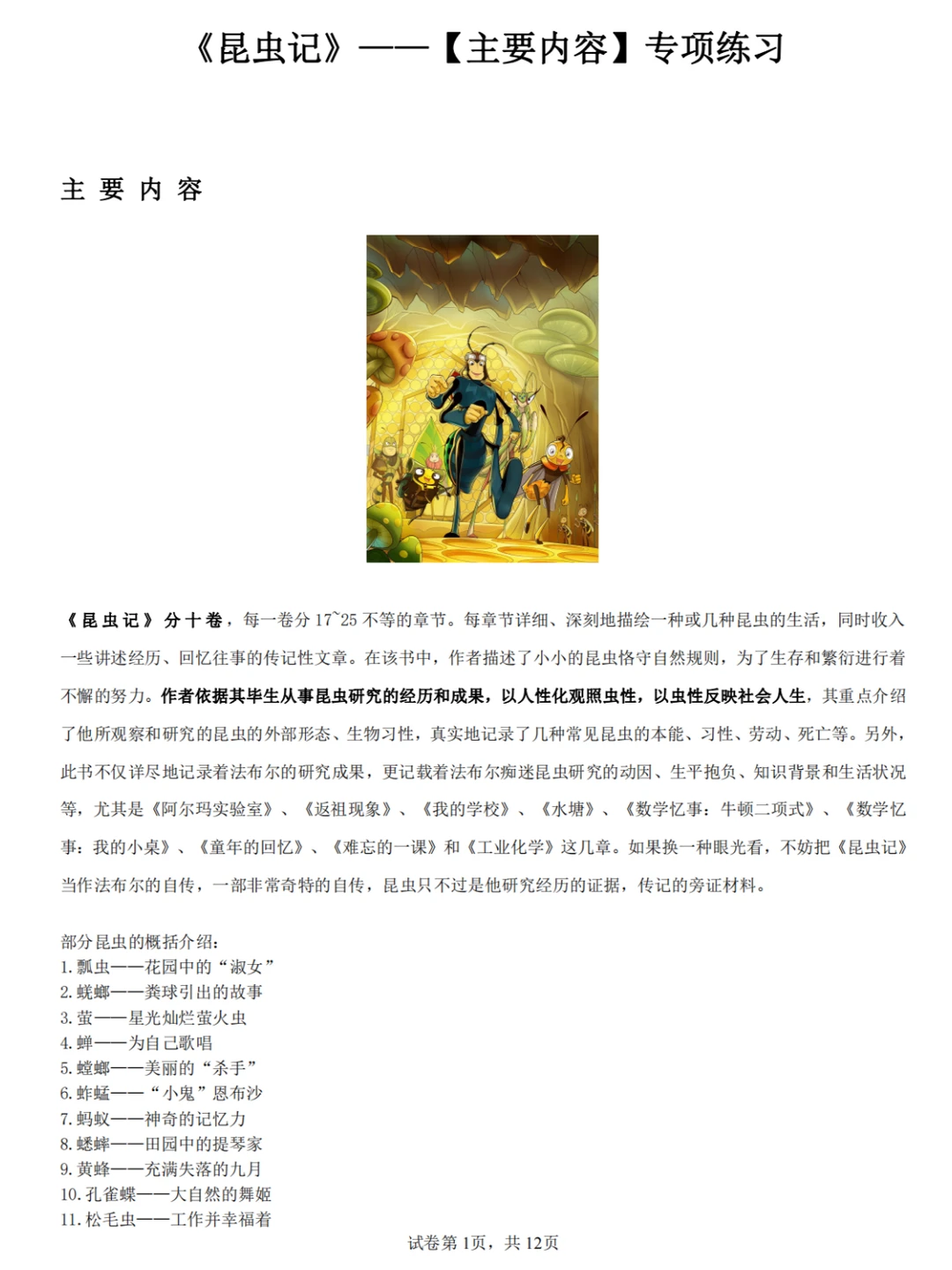 不懂就问有问必答 ❗《昆虫记》作为八上必读的名著之一,重要性不言而喻,建议大家利用这个暑期,好好提前学习。✅ 【材料内容】:从创作背景、作者、主题等五个方面来解析《昆虫记》(共79页)。 ✨ 【使用方法】: 第一步:先看材料的总结部分内容 第二步:看《昆虫记》原著 第三步:做材料后面的习题 第四步:结合答案订正,并回顾书本信息 ✨