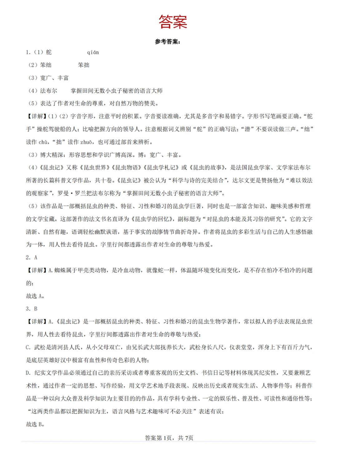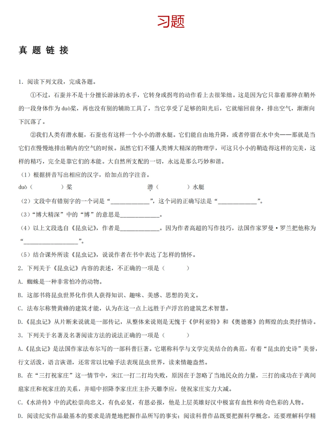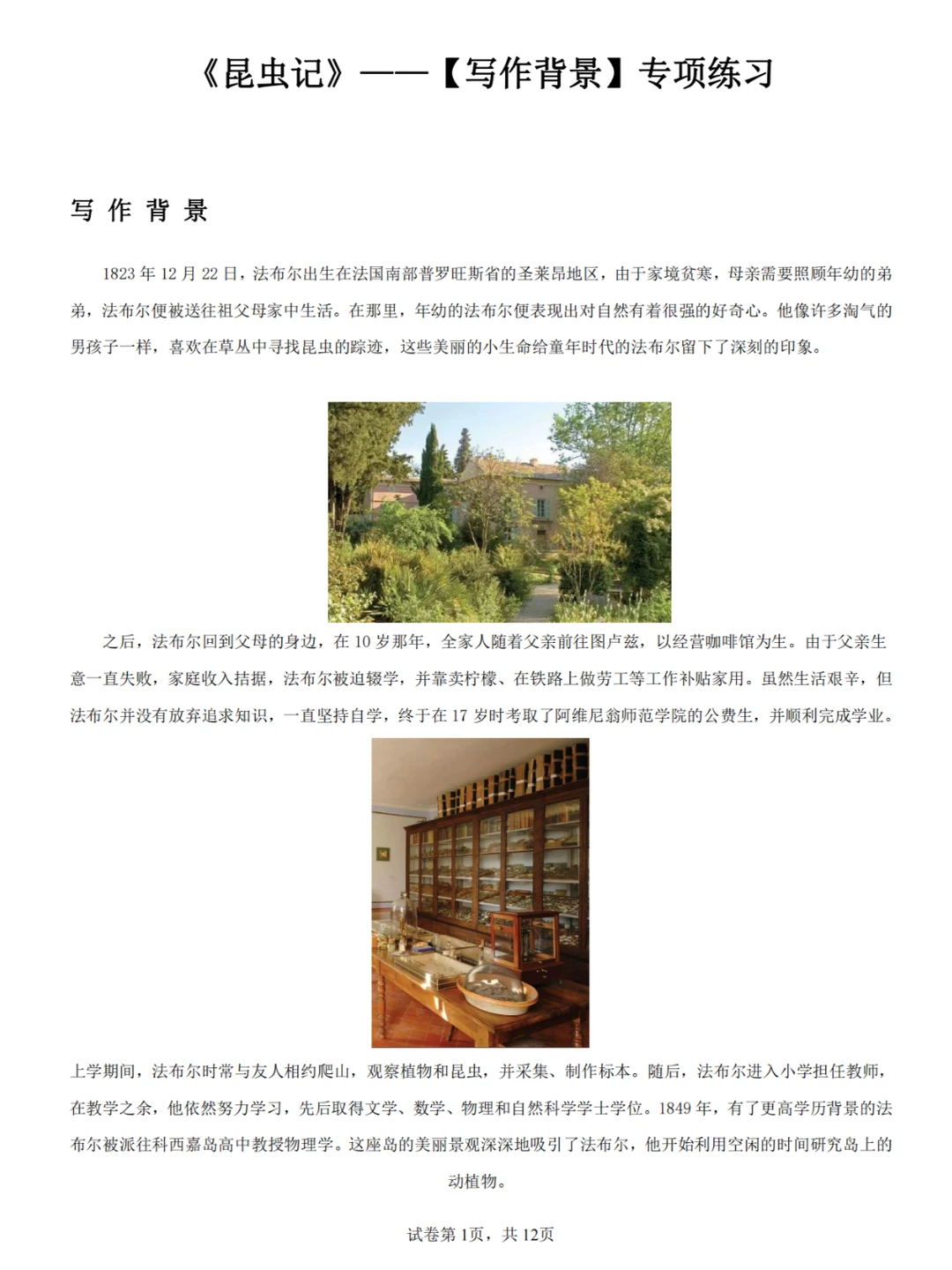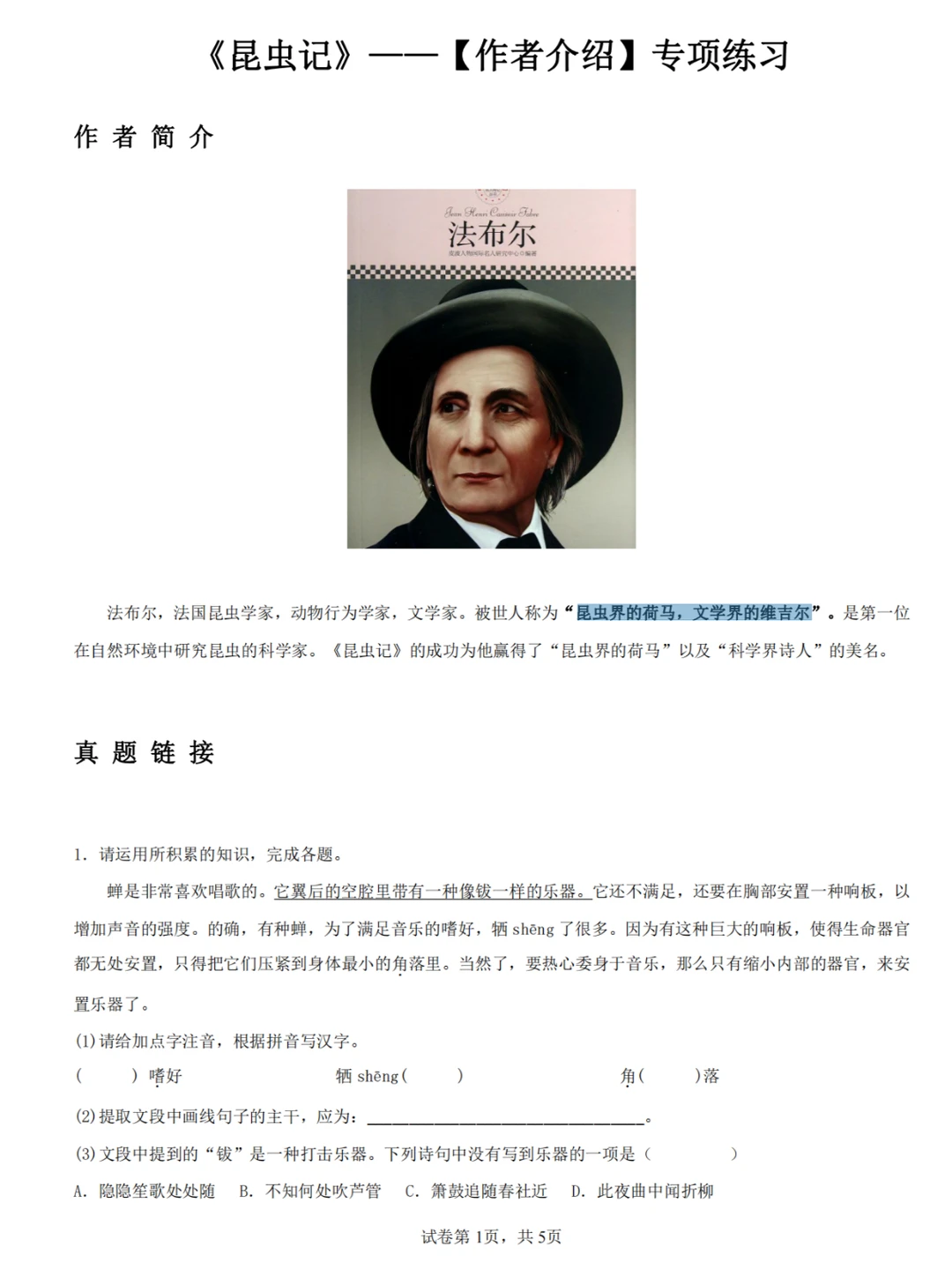 不懂就问有问必答 ❗《昆虫记》作为八上必读的名著之一,重要性不言而喻,建议大家利用这个暑期,好好提前学习。✅ 【材料内容】:从创作背景、作者、主题等五个方面来解析《昆虫记》(共79页)。 ✨ 【使用方法】: 第一步:先看材料的总结部分内容 第二步:看《昆虫记》原著 第三步:做材料后面的习题 第四步:结合答案订正,并回顾书本信息 ✨
