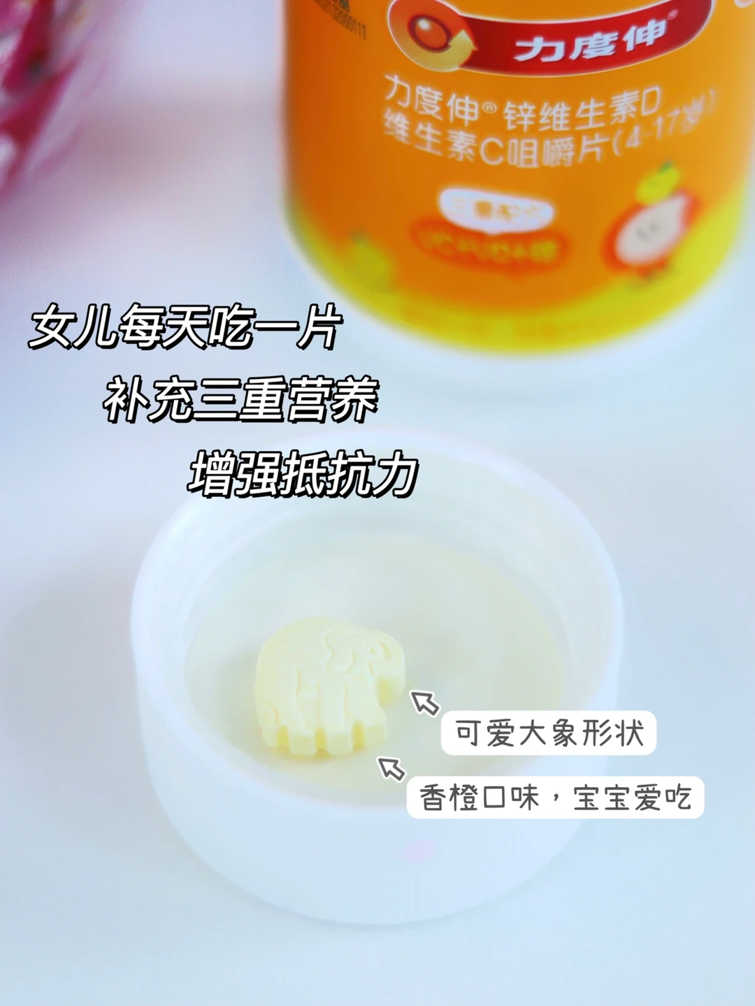 👉每日三餐均衡饮食,摄入一定量的蔬菜🥦和水果🍒,补充不同的营养元素,但食物的营养可能会在高温烹饪时有所流失,所以我每天都会给孩子吃力度伸儿童咀嚼片额外补充营养,每片含有维生素C(可以增强抵抗力)+维生素D(帮助钙吸收)+锌(帮助改善宝宝食欲),可爱的大象形状,吃起来是香橙🍊口味,孩子很爱吃,每天一片嚼出三重营养。