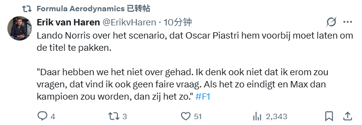 诺里斯谈到正赛可能的车队指令时说道(需要皮亚斯特里让位置来争世界冠军):“我们没有讨论过,我也不认为我会去要求这些。我不认为这是一个合理的要求。如果这就是最终结果,马克斯赢得世界冠军,那就这样吧。”(If that's how it ends and Max becomes champion, then so be it.")2025f1阿布扎比大奖赛