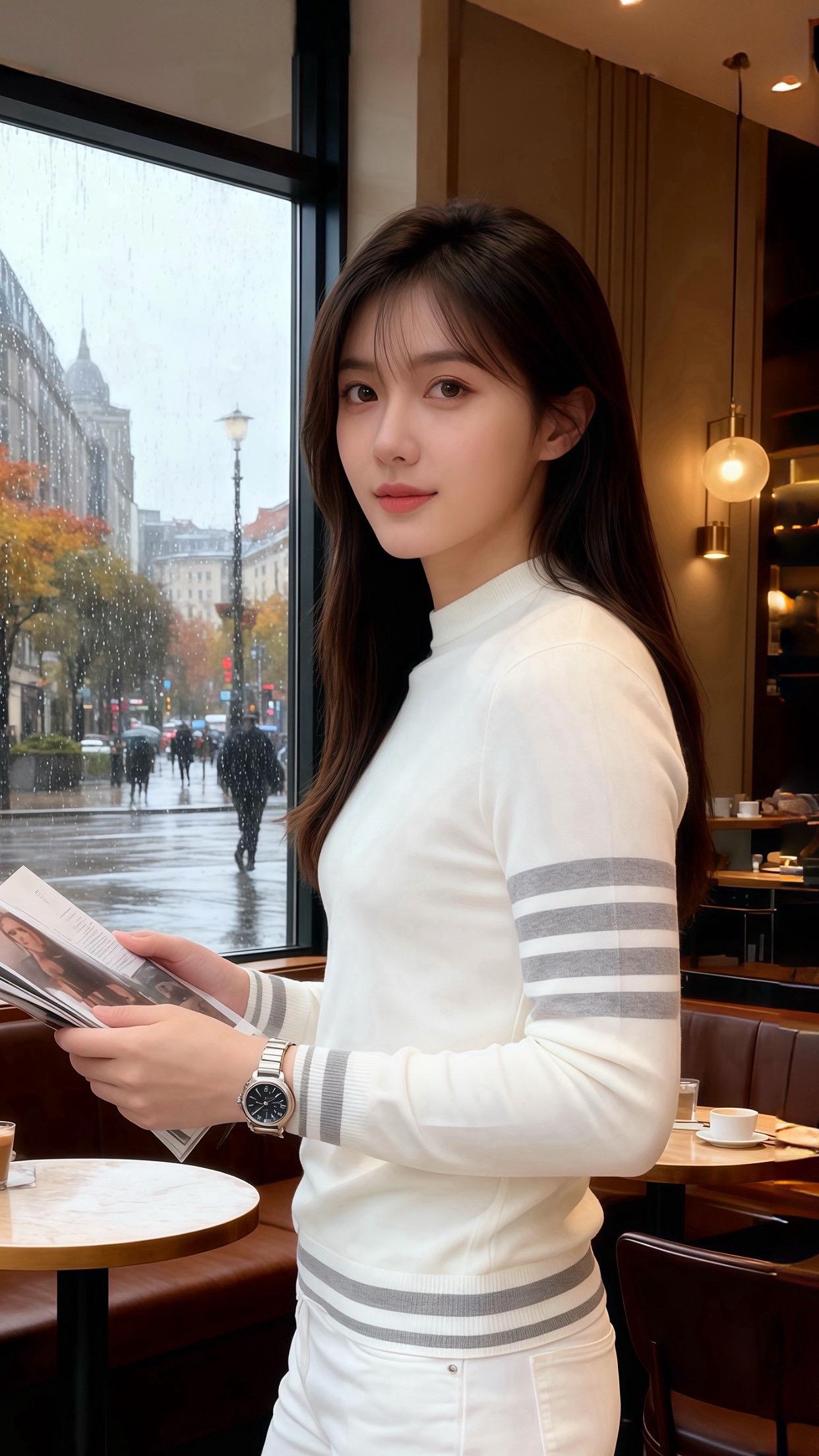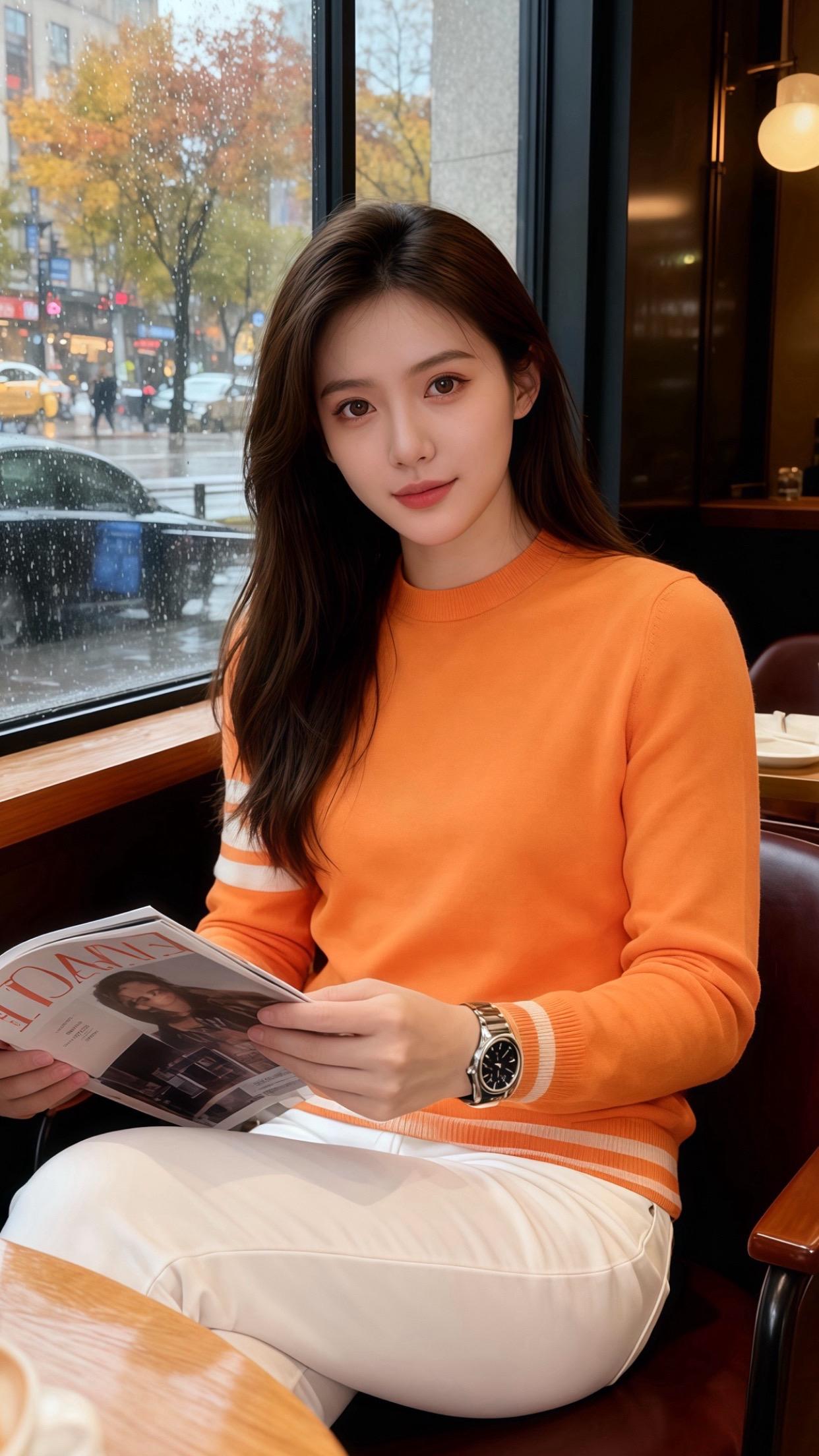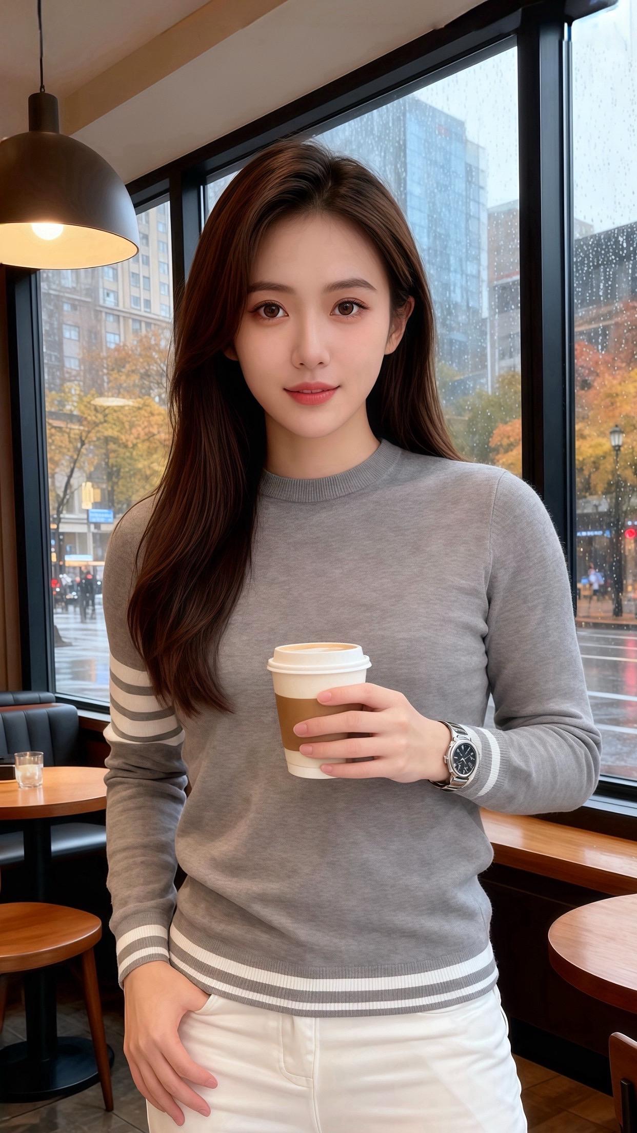 《秋咖》 雨雾裹着梧桐香漫进咖啡馆时,皓明推门进来——身上那件浅灰毛衣,袖口的白条纹像把秋光织得刚好,衬得他肩线清润又舒展。 许妍抬眼笑:“不是说给我挑的新款吗?” 他把纸袋放她手边,是件同款白毛衣:“试了下,觉得你穿会更衬今天的雨。” 许妍指尖碰过毛衣针脚,软而贴肤。抬眼时,皓明正揉她发顶:“这料子不扎,你上次说领口磨,这个刚好。” 窗外车流漫过湿街,许妍摸了摸自己袖口的灰条纹,忽然觉得好穿搭从不是抢眼,是像他这样,把妥帖揉进布料里,像秋咖的温度,刚好裹住两个人的黄昏。