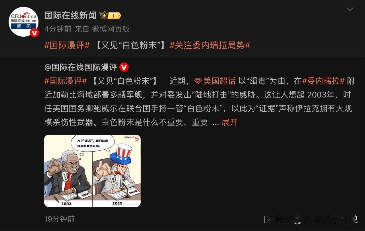 这幅漫画把美国的虚伪本质表现得淋漓尽致了,大家一看就知道了是怎么回事儿!非常佩服这位漫画家,将早前美国的“洗衣粉”事件与这次的的委内瑞拉所谓“打击毒贩”行径完美联动了起来,二者居然如出一辙。这种强权本质下的虚伪看得人既愤怒又无奈,没办法,人家拳头大,说什么都没人敢反对,即使反对也无效。但这种做法是建立在真正强大实力基础之上的,一旦以后国力不济,这将会成为他们自己为自己挖的大坑,说不定也会被人这样对待。