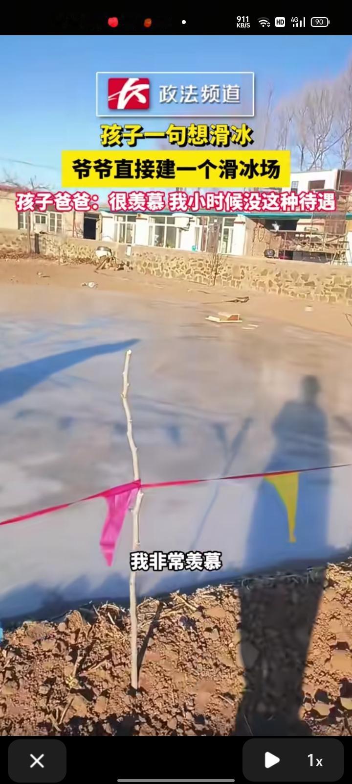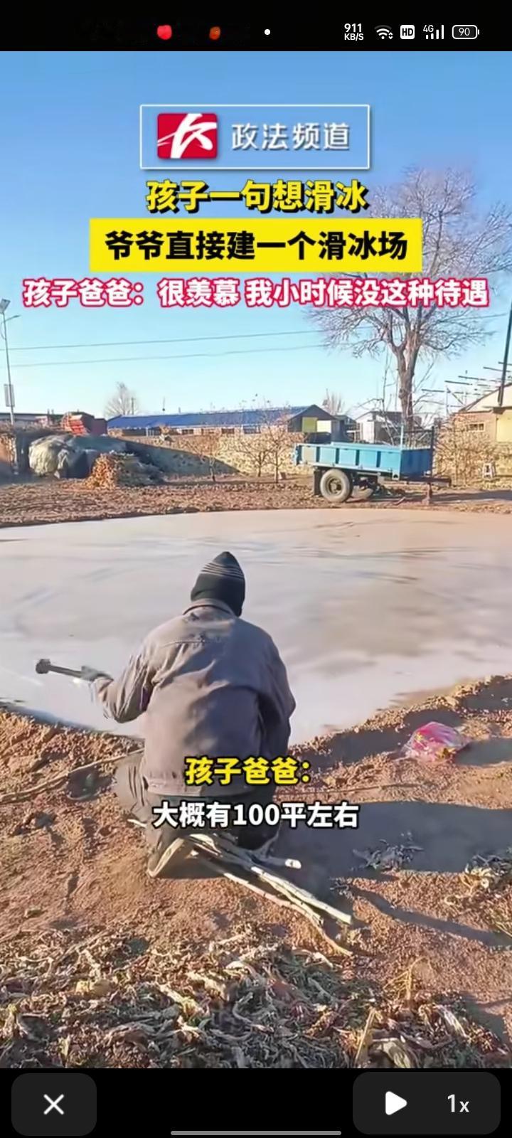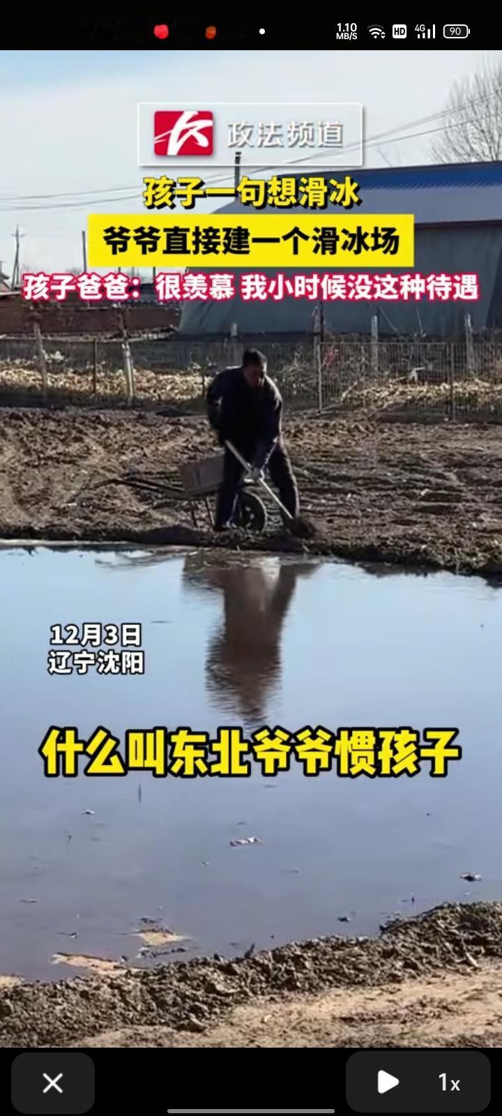 12月3日,辽宁沈阳。网友晒视频称,东北爷爷有多宠溺孩子,孩子一句想滑冰了,爷爷用了一天多时间就把冰场做好了。去年做过一次冰场,孩子玩的很开心,今年冰场从50平扩容到100平,围了一圈围旗,还做了冰车。看着爷爷疼爱孩子,自己感到羡慕,因为小时候就没有这样的待遇