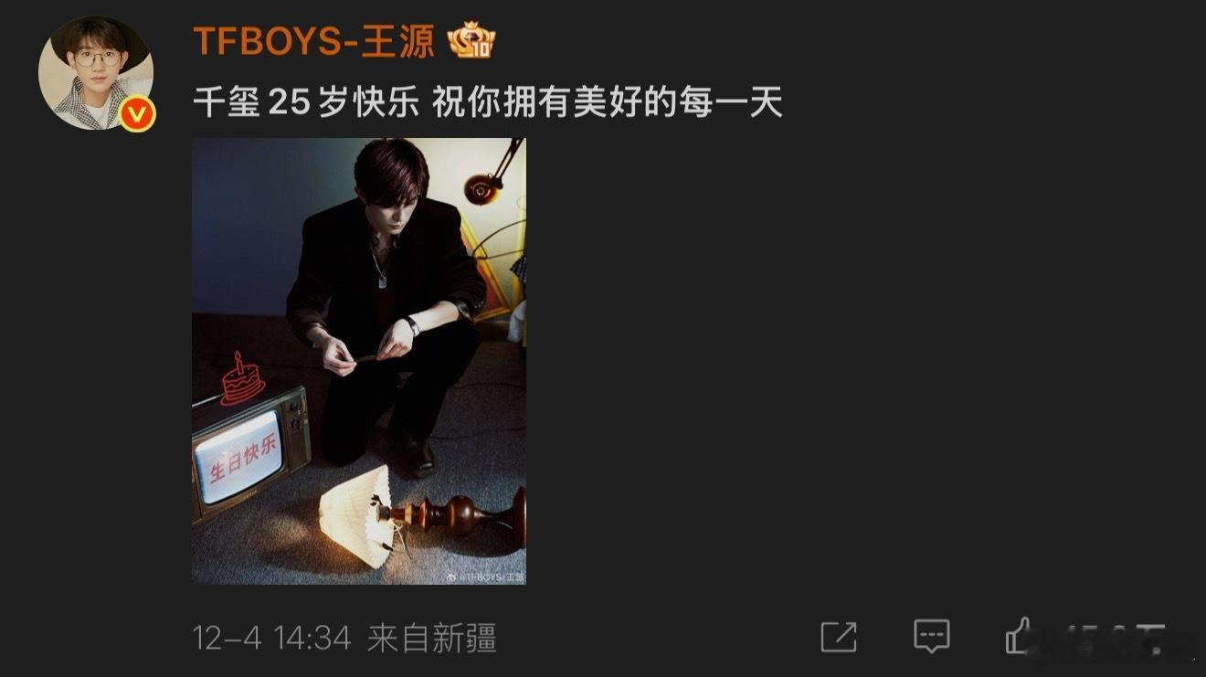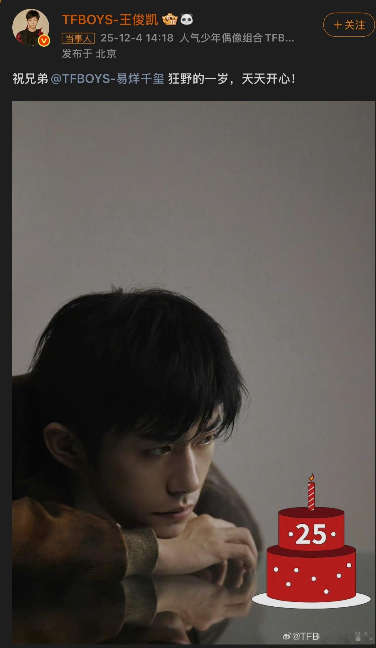 王俊凯王源祝福易烊千玺25岁生日祝千玺25岁生日快乐!从青涩少年到实力演员,你的