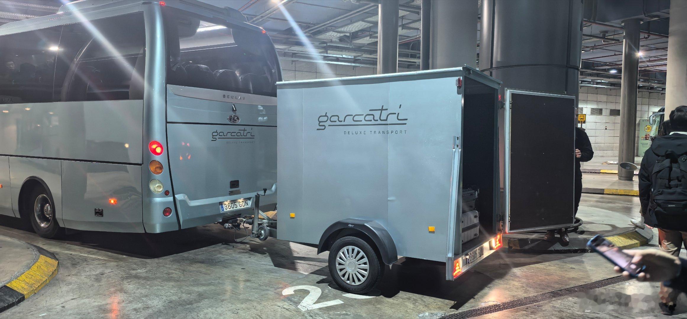 飞机太晃了,我做最后一排都快晕机了。幸好下飞机是阳光明媚的地中海。西班牙的旅行大巴有意思,行李车在后面拖着。