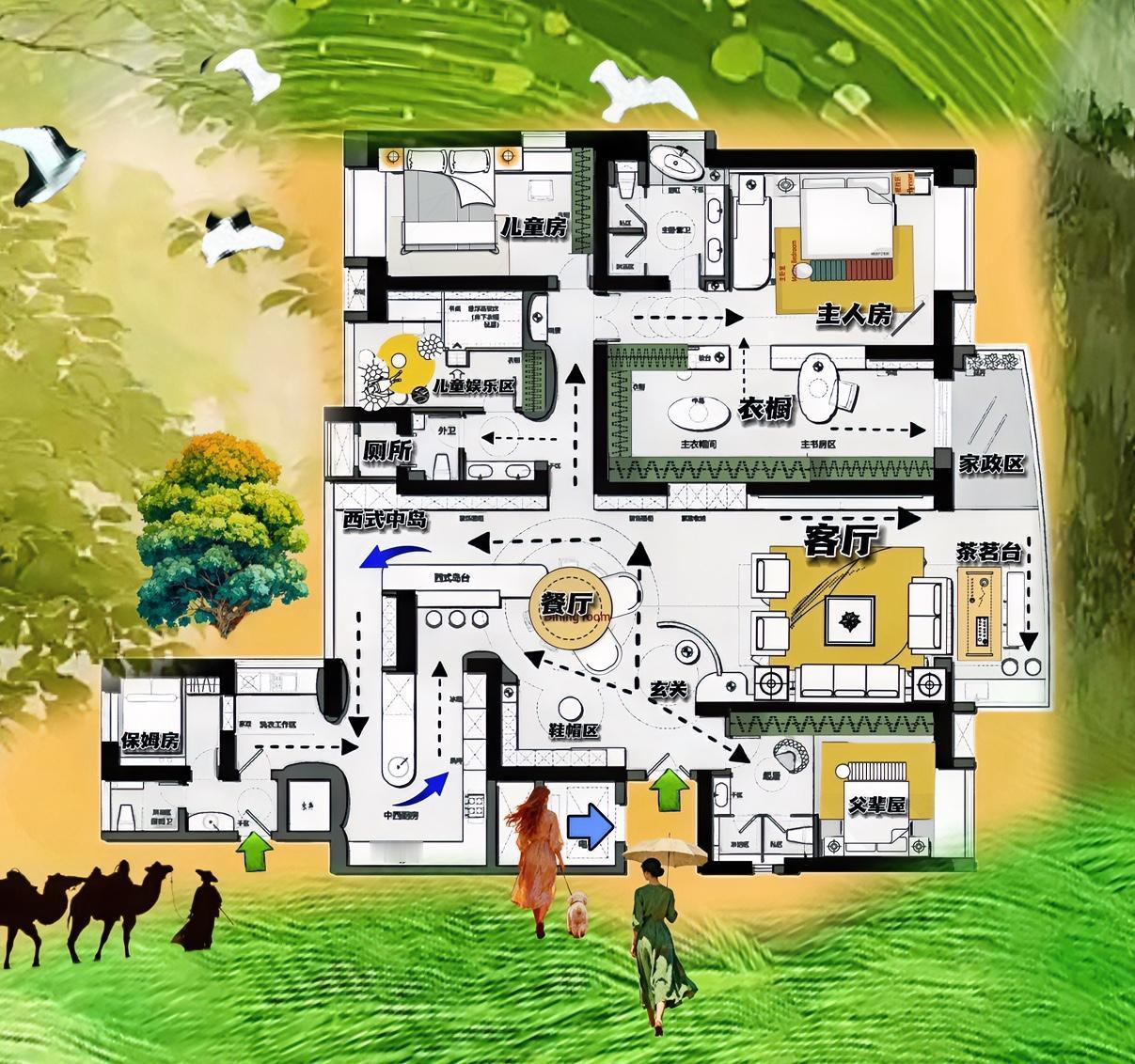 今晚上,这个户型格外的美丽,优雅的动线,306㎡里都装满了艺术! 我上一次见到,这么特别的三居室,八多年前的事了,还是房产最繁华的时期,呆萌呆萌的,全开放式能气死人! 我为厨房操碎了心,一夜之间,餐厨和玄关一体化,四合一空间,特别像 八大山人的抽象画! 动线曲折,布局灵活! 如果你喜欢,就是慧眼识“魂”,魂是双中岛,还有阳台的茗茶台! 一边讲烟火气,另一边注重意境,还有主卧的男女双衣橱,品质保满分! 其实还有一个儿童娱乐活动中心,也对路子,遇到了儿童房,做一对好邻居! 大平层转世了,种菜在洄游中岛,吃茶喝到茗茶台,方便如门口的老人房,暗藏玄机西南的保姆房! 所以说,后门见保姆房,拐弯到厨房,不翻跟斗,碰巧与家政间,撞个满怀! 两条动线,打造出三代同堂的完满气场!