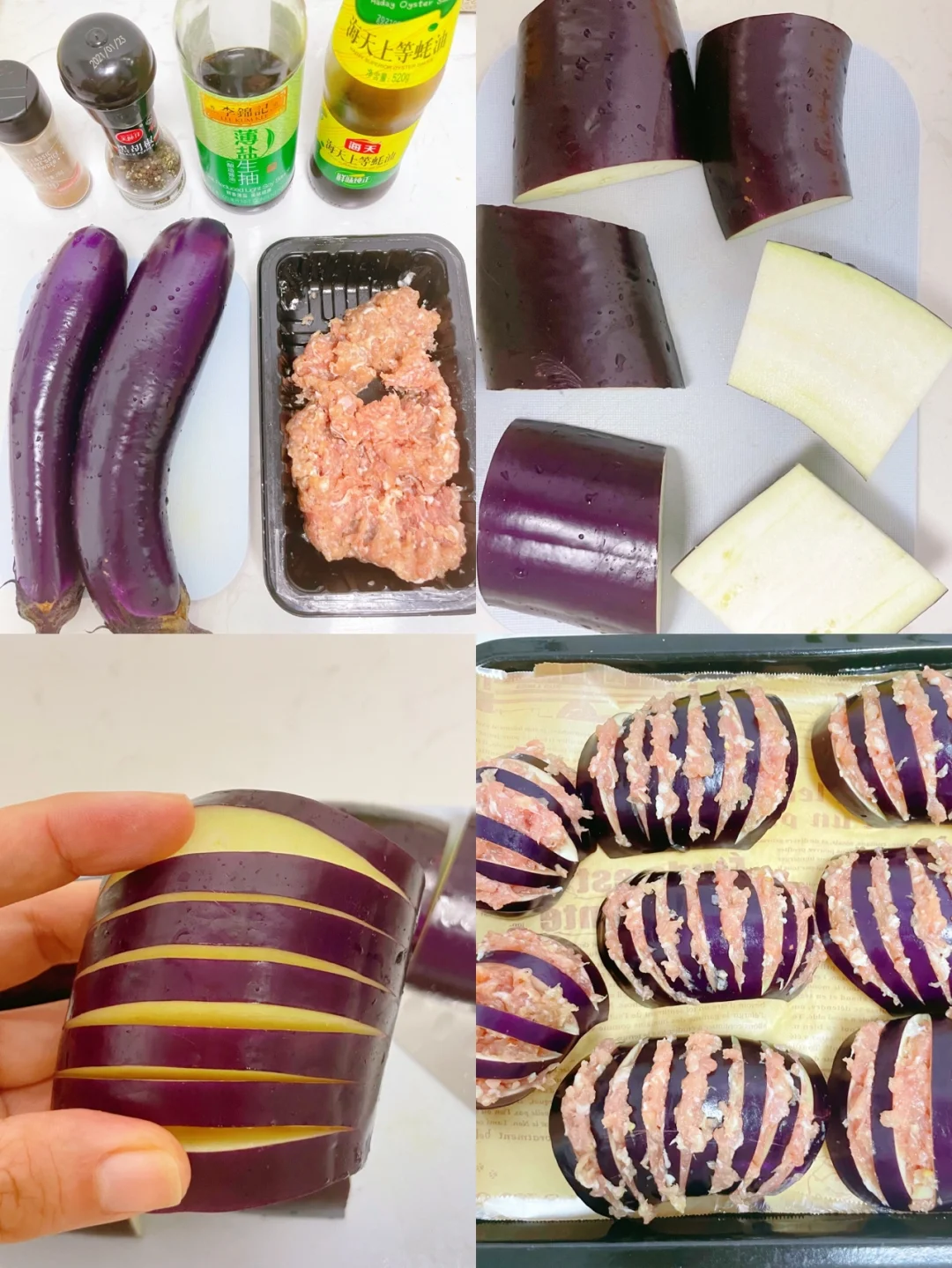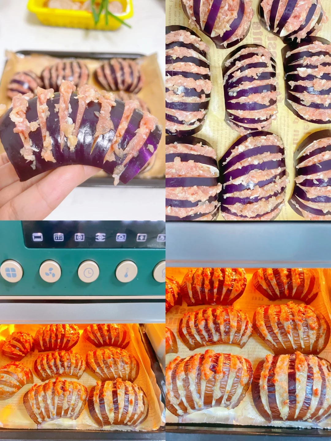 空气炸肉茄 材料: 茄子🍆一根(选肥一点圆润些的) 猪肉末150g(肥瘦2:8) 调料: 五香粉,酱油,蚝油,黑胡椒。 肉末放入调料把味道调好(凭感觉和经验调味[偷笑R])茄子切成手指的一段段,再对半切开,茄子皮一面刮刀,不要切断。把肉泥酿在茄子里面。 空气炸模式180度9分钟。 这样就得到了一盘低卡无油还好吃的茄子。✅