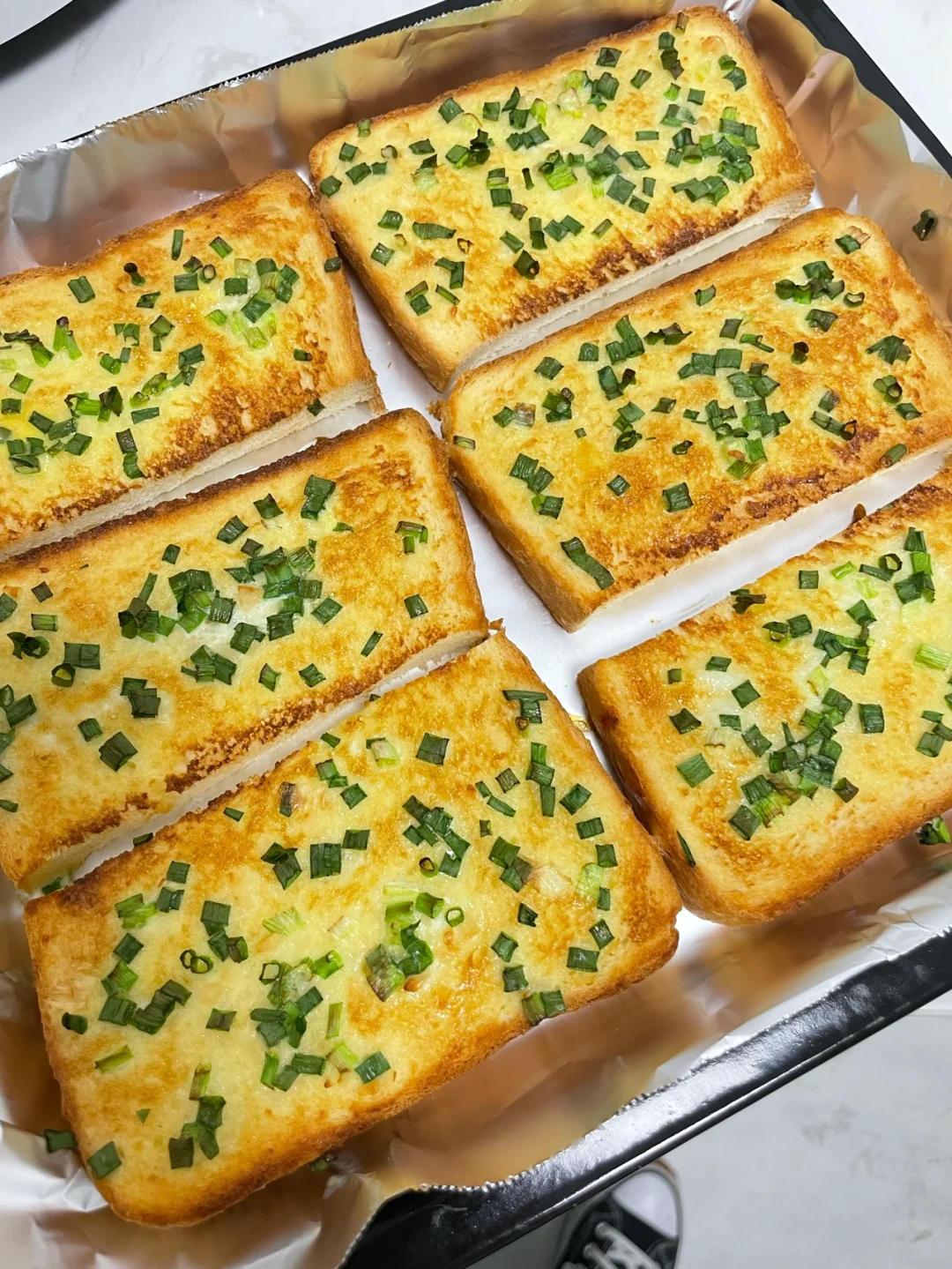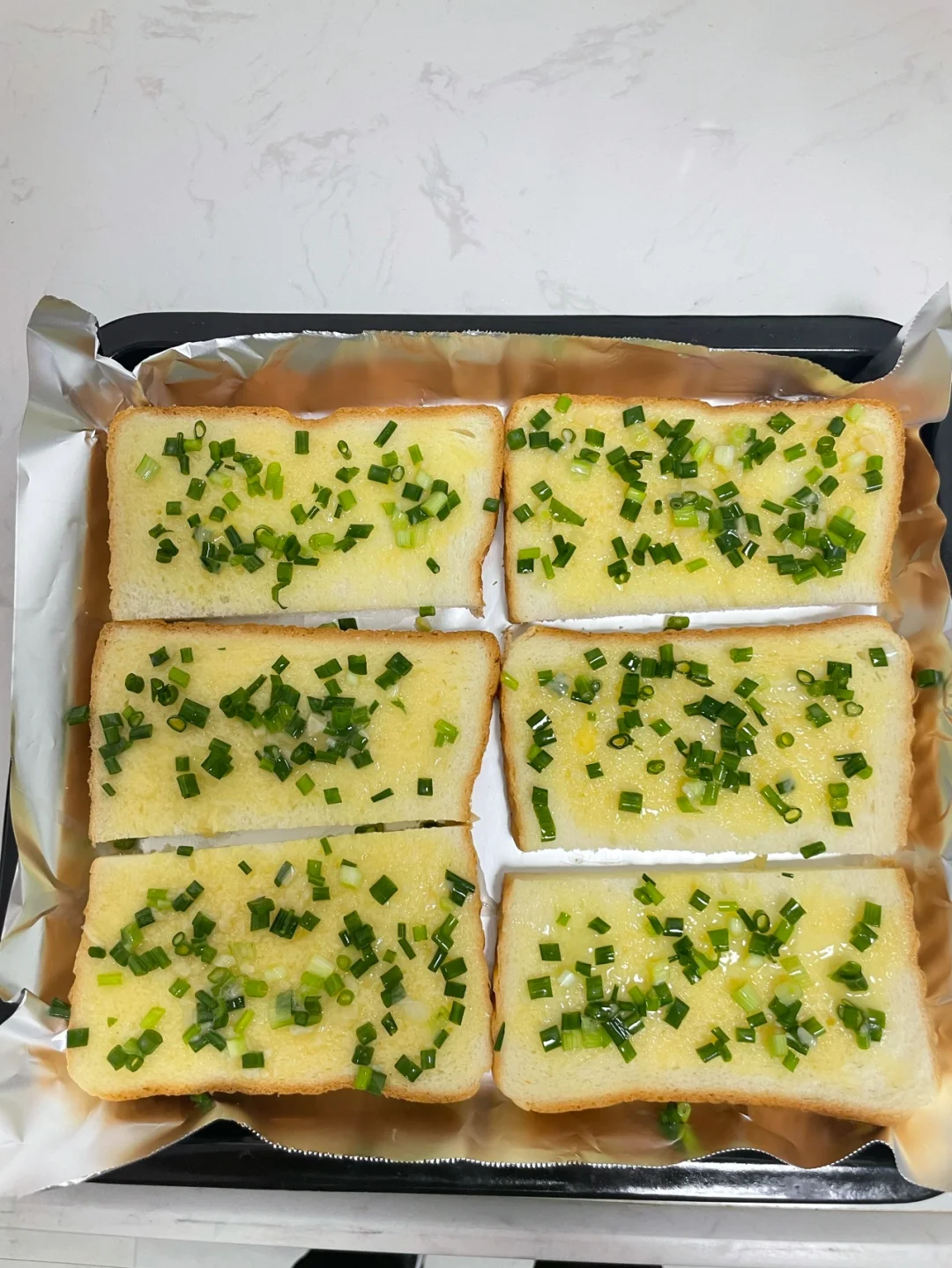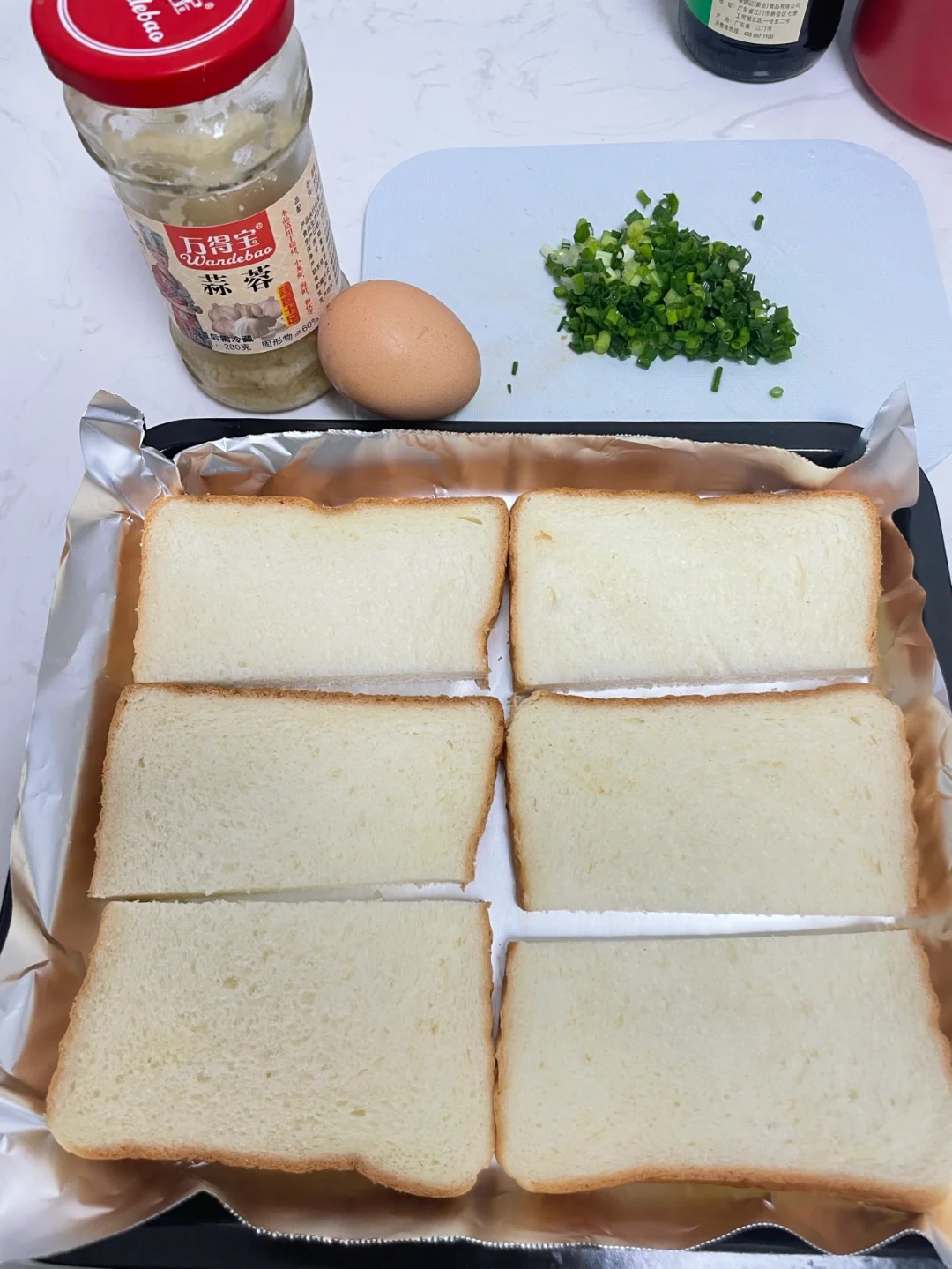 葱蒜烤吐司 材料:吐司,蒜泥,香葱,鸡蛋 吐司切成你想要的形状,蒜泥香葱鸡蛋混合。我用的是即食蒜泥自带咸味,如果自己剁可以加适量的盐。有条件再放点五香粉,这是我吃的时候想到的。 把混合好的液体涂抹在吐司表面,160度烤10分钟。如果喜欢吃再脆一点的翻面再烤2分钟。 没加黄油,有鸡蛋衬托还是很香的。毕竟秋天不能让自己贴上膘[微笑R]