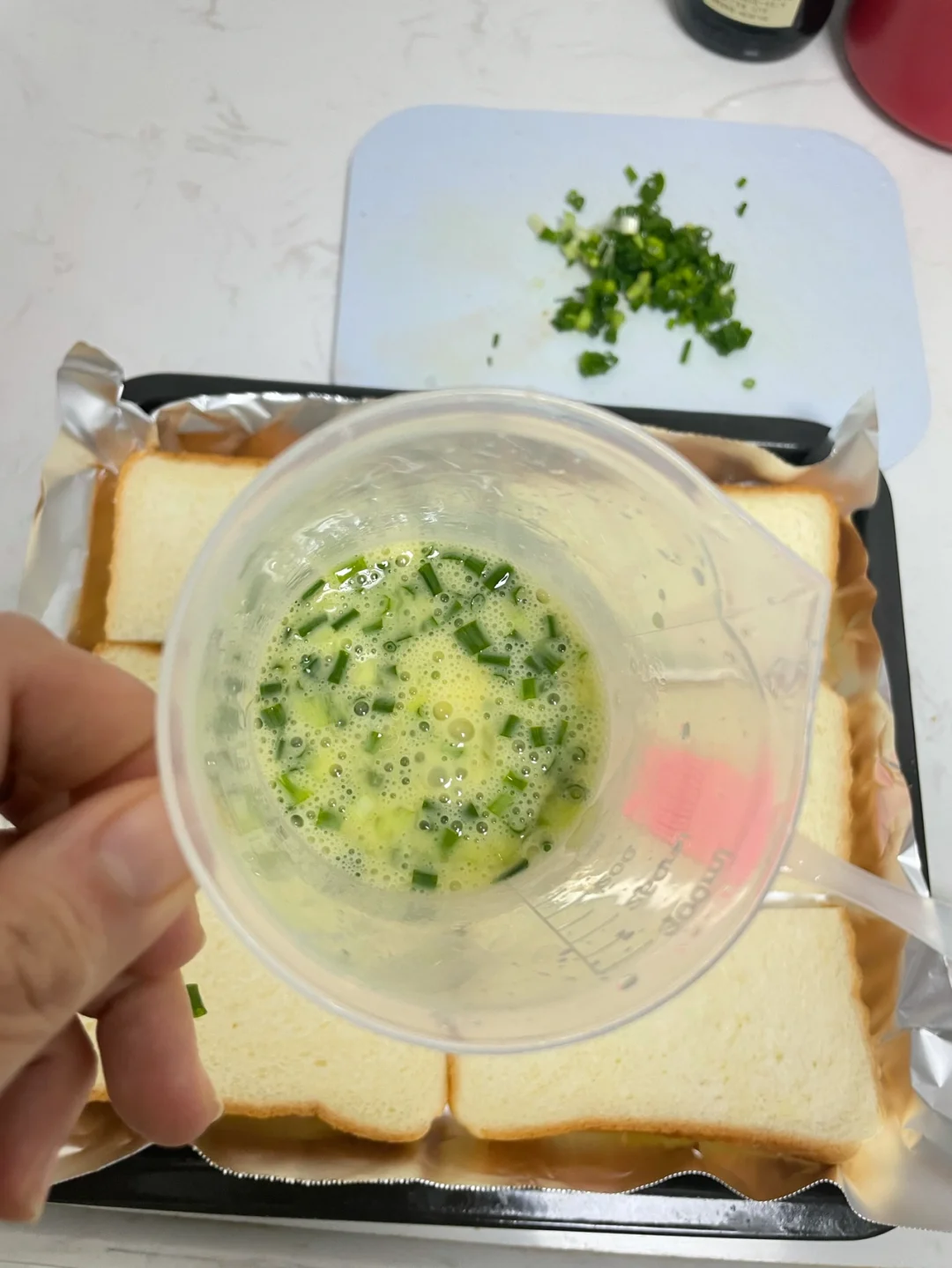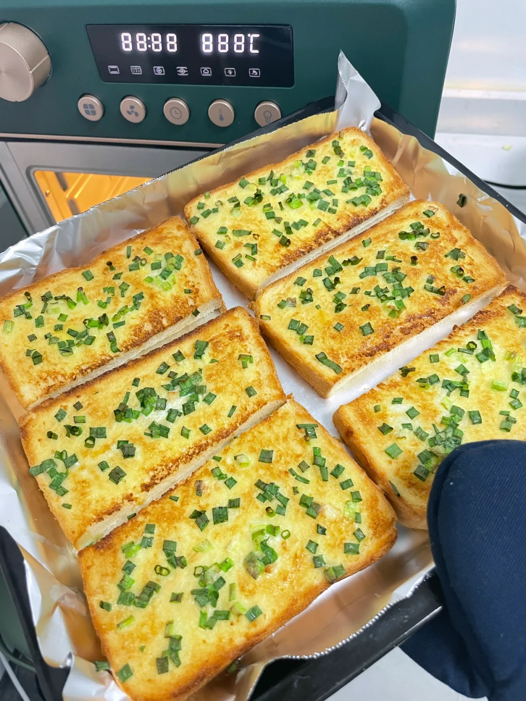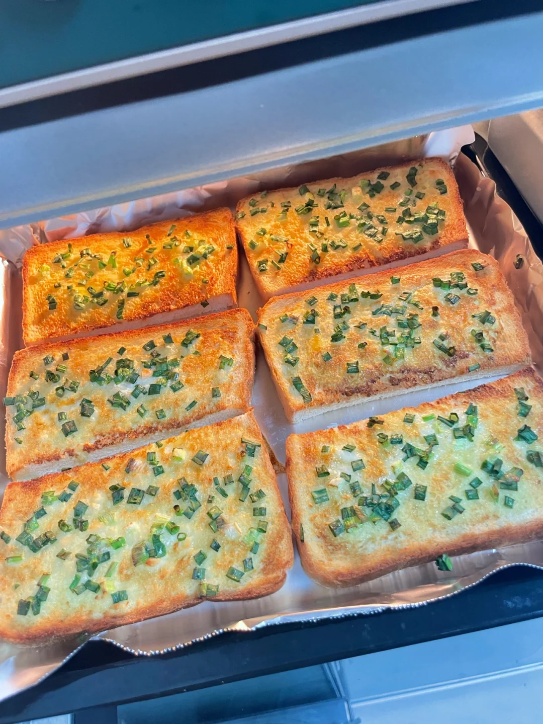 葱蒜烤吐司 材料:吐司,蒜泥,香葱,鸡蛋 吐司切成你想要的形状,蒜泥香葱鸡蛋混合。我用的是即食蒜泥自带咸味,如果自己剁可以加适量的盐。有条件再放点五香粉,这是我吃的时候想到的。 把混合好的液体涂抹在吐司表面,160度烤10分钟。如果喜欢吃再脆一点的翻面再烤2分钟。 没加黄油,有鸡蛋衬托还是很香的。毕竟秋天不能让自己贴上膘[微笑R]