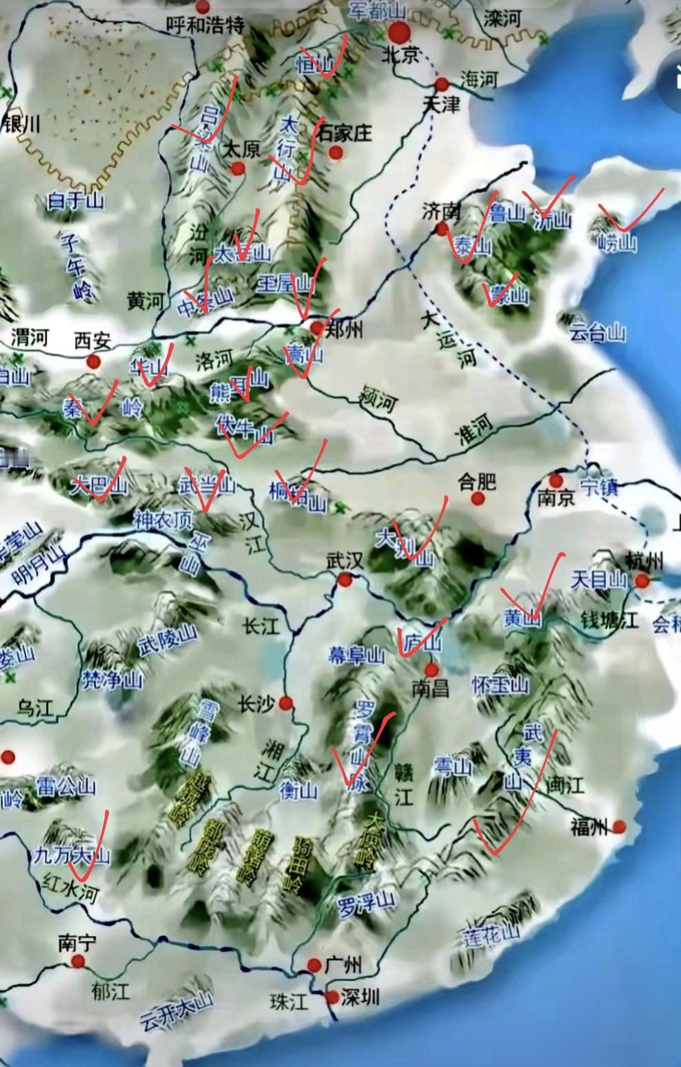 用一张图片来记录生活这图上凡划对勾的山我全都去过,另外图上没标出的山,比如九华山、太姥山、胡里山、岳麓山、老君山、天山、长白山等也都去过。现在年龄大了,不适合再爬山了,只能跑跑平较平坦一点的景点了!活着不逛,死了冤枉!