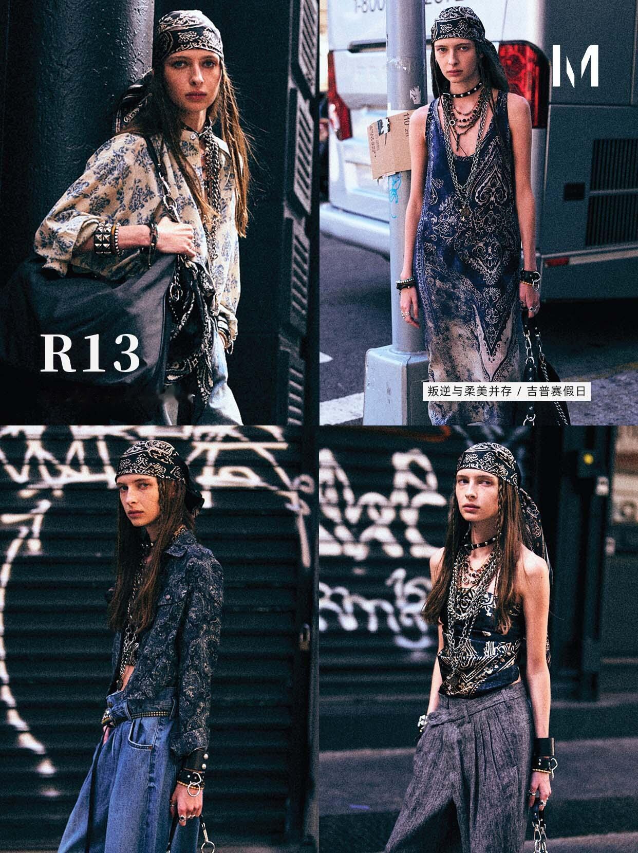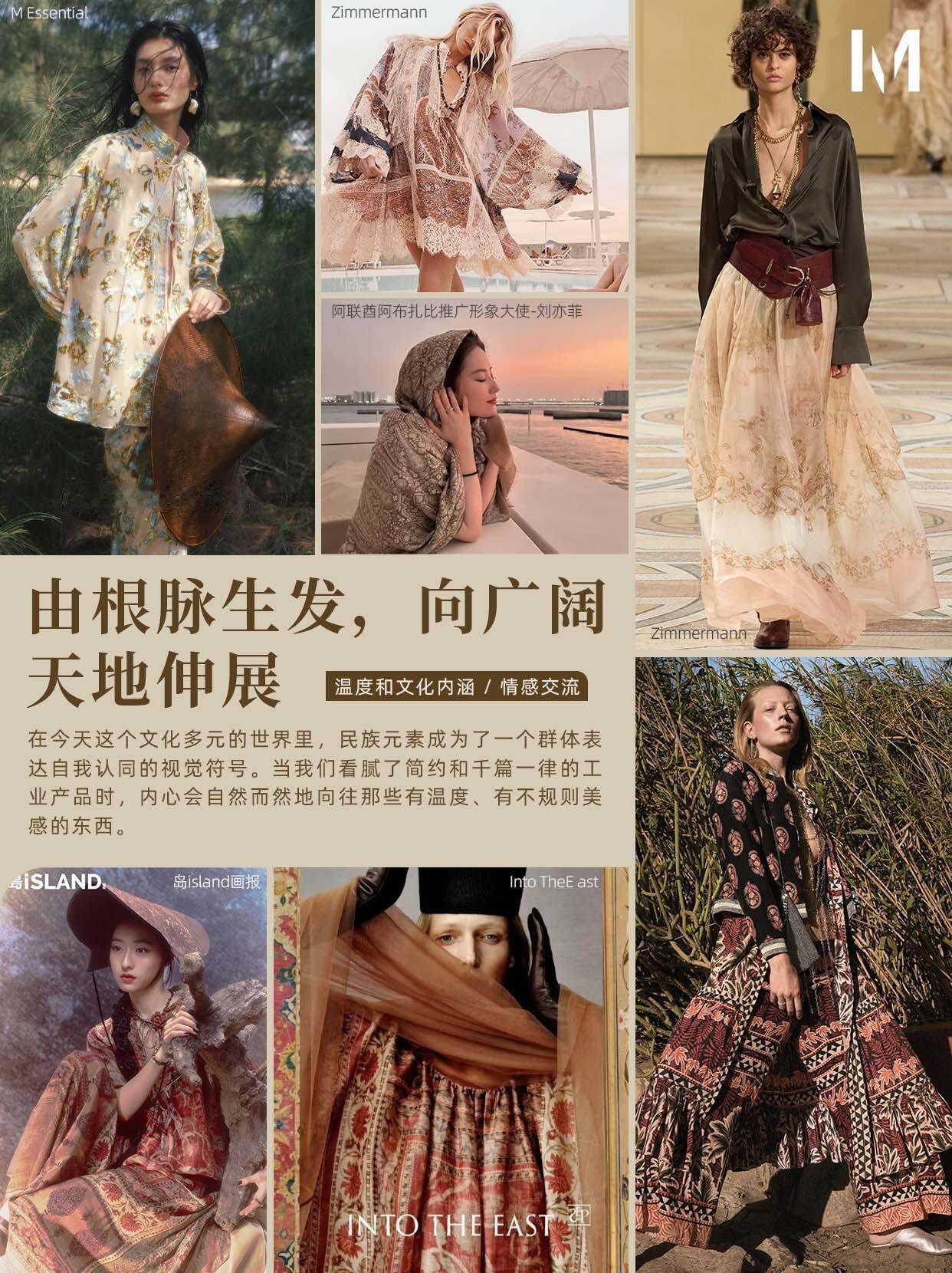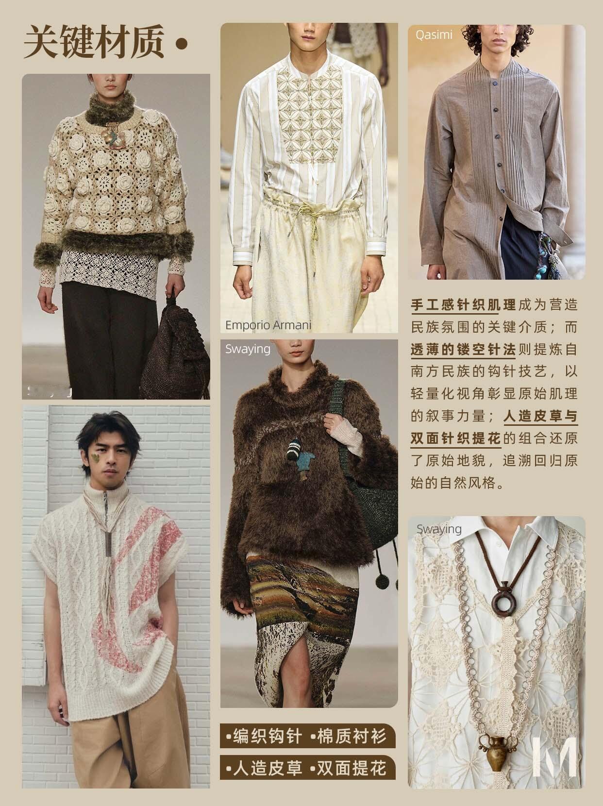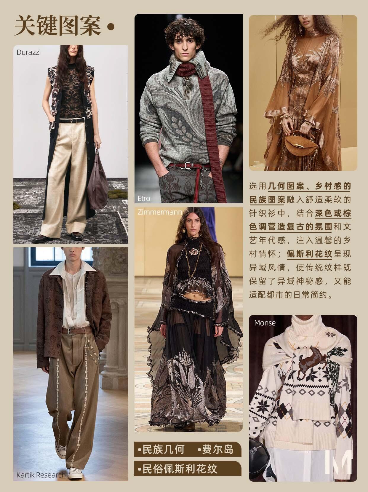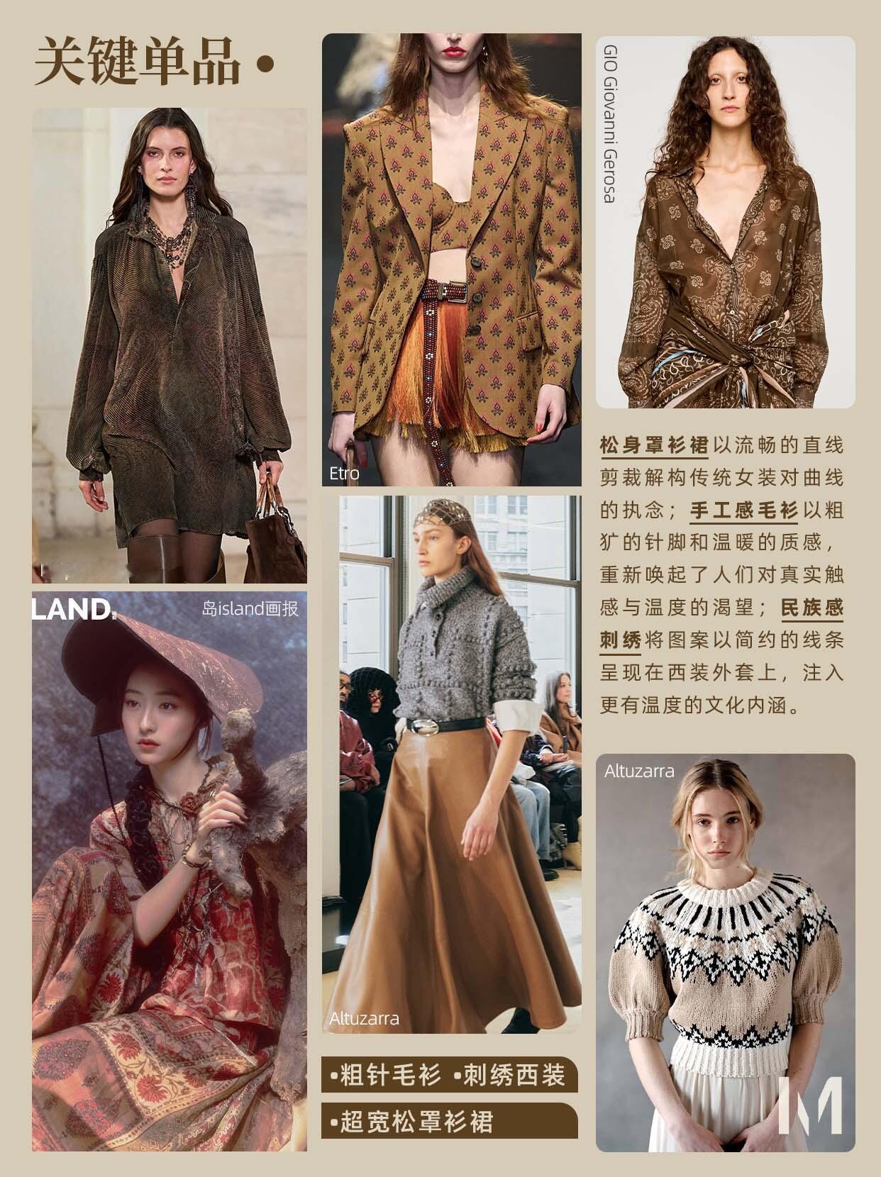风格大赏时尚灵感解读 2026风格趋势🍂民族文化的破茧与共鸣在今天这个文化多元的世界里,民族元素成为了一个群体表达自我认同的视觉符号。当我们看腻了简约和千篇一律的工业产品时,内心自然而然地向往那些有温度、有不规则美感的东西。于是,无论是在日常生活还是时尚领域,民族风的再次流行和不断创新,恰恰证明了传统文化正以一种新的方式被激活,并焕发出全新的生命力。任何富有生命力的文化,都深深植根于其独特的民族土壤。它可能源自一个族群的历史记忆、生活哲学,或是特定的审美表达。“从民族到世界”概括了文化从孕育于特定地域,到跨越边界、拥抱世界的升华过程。◆关键单品:粗针毛衫 刺绣西装 超宽松罩衫裙松身罩衫裙以流畅的直线剪裁解构传统女装对曲线的执念;手工感毛衫以粗犷的针脚和温暖的质感,重新唤起了人们对真实触感与温度的渴望;民族感刺绣将图案以简约的线条呈现在西装外套上,注入更有温度的文化内涵。◆关键图案:民族几何 费尔岛 民俗佩斯利花纹选用几何图案、乡村感的民族图案融入舒适柔软的针织衫中,结合深色或棕色调营造复古的氛围和文艺年代感,注入温馨的乡村情怀;佩斯利花纹呈现异域风情,使传统纹样既保留了异域神秘感,又能适配都市的日常简约。◆关键材质:编织钩针 棉质衬衫 人造皮草 双面提花手工感针织肌理成为营造民族氛围的关键介质;而透薄的镂空针法则提炼自南方民族的钩针技艺,以轻量化视角彰显原始肌理的叙事力量;人造皮草与双面针织提花的组合还原了原始地貌,追溯回归原始的自然风格。◆关键品牌Into The East——包容万象的东方哲学精致的松弛/民族文化/传统手工Miu Miu——知识分子风与民族感融合学院+民族/少女感/名人效应Kartik Research——关于传统工艺的现代表达民族+街头感/手工质感/反工业化R13——艺术流浪与都市现实结合叛逆与柔美并存/吉普赛假日M Essential——东方美学的雅致欢愉中式元素/回归本源/古典温婉ZhuChongYun——在传统与现代之间找到平衡优雅都市/实用舒适/新中国风从生活到时尚,民族风的回归与再造,正是古老传统在现代世界里的生动叙事。