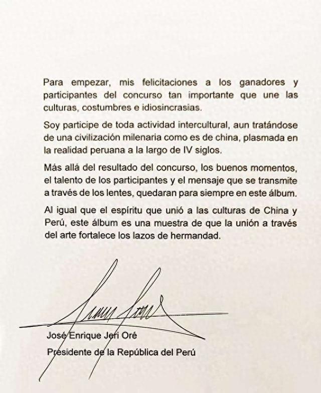 当地时间12月3日,秘鲁总统何塞•耶里向中国外文局美洲中心参与主办的首届“中国文化在秘鲁”摄影比赛发来贺信,向比赛的获奖者和参与者表示热烈祝贺,并指出,“中国文化在秘鲁”摄影比赛颇具重要性,充分联结了中秘两国的文化、习俗与民族特质。