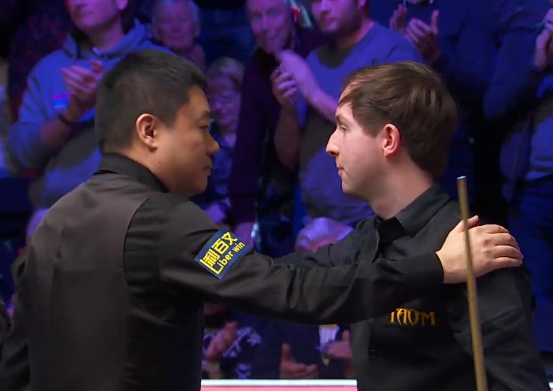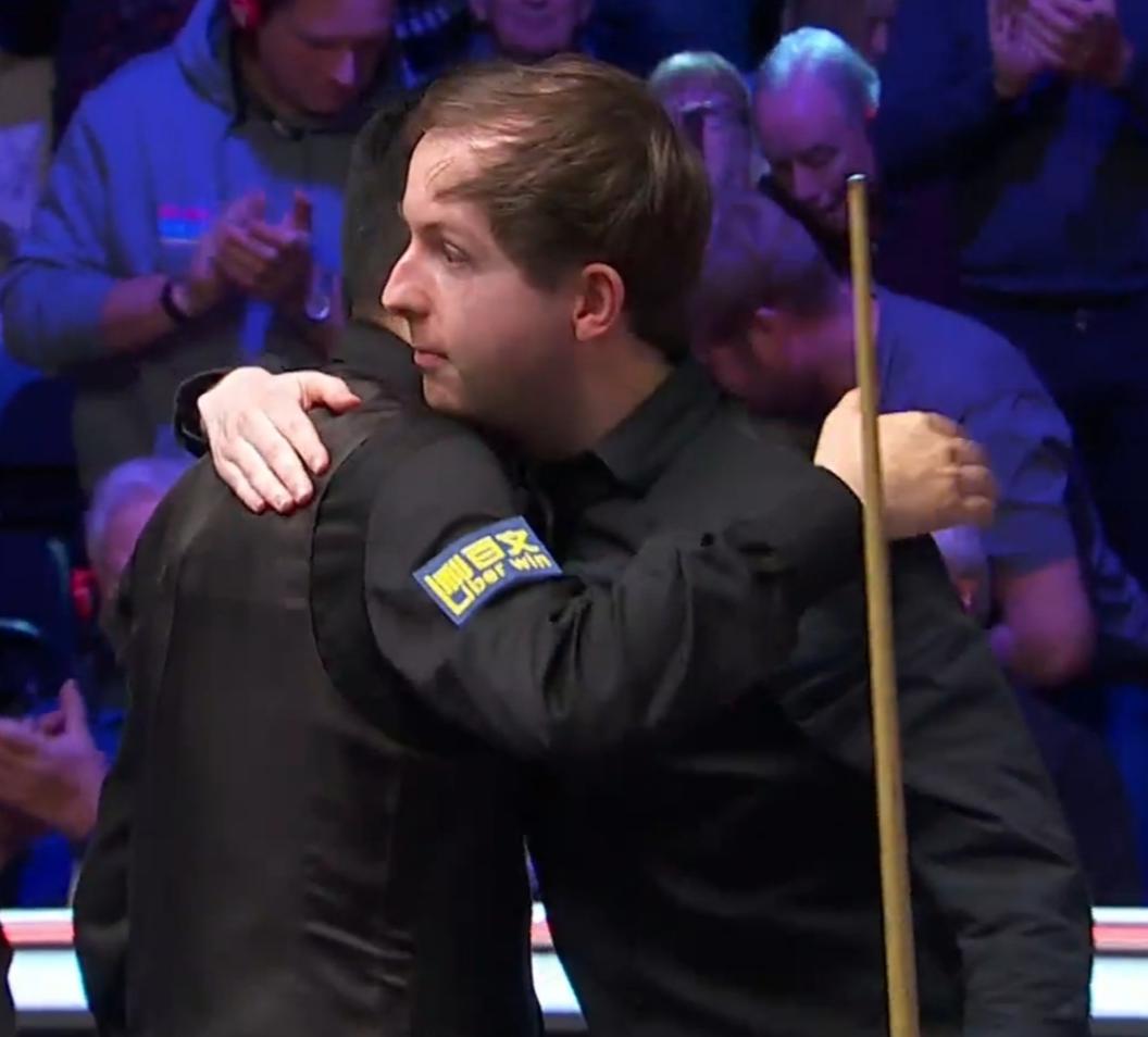 昨晚进行的斯诺克英锦赛一场1/8决赛焦点战,丁俊晖对阵“克星”苏格兰选手唐纳森,之所以说是“克星”,是因为唐纳森在与丁俊晖的最近三次交手都取得了胜利,而且这波三连胜还是在2020年的10天内达成的。昨天的再次相遇,唐纳森从资格赛一路杀出,首轮又6-1大胜世界排名第七的马克·艾伦,士气正盛,两人一直战至决胜局,丁俊晖顶住压力,凭借一记精彩的长台红球,最终以6比5险胜,终结了交手连败,成功晋级8强。比赛结束后,丁俊晖还暖心地拥抱了上个月刚刚经历丧父之痛的唐纳森。