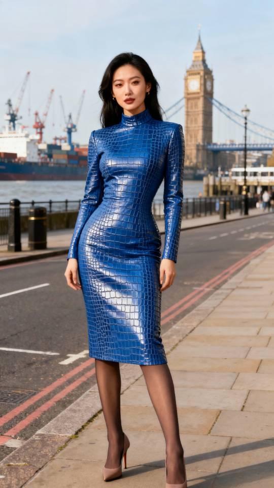 蓝色皮旗袍裙女子英国伦敦留影。旗袍 美女壁纸