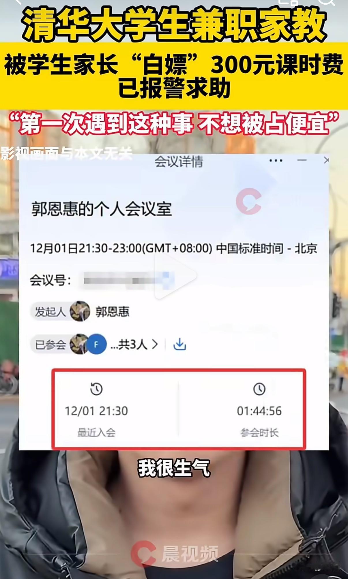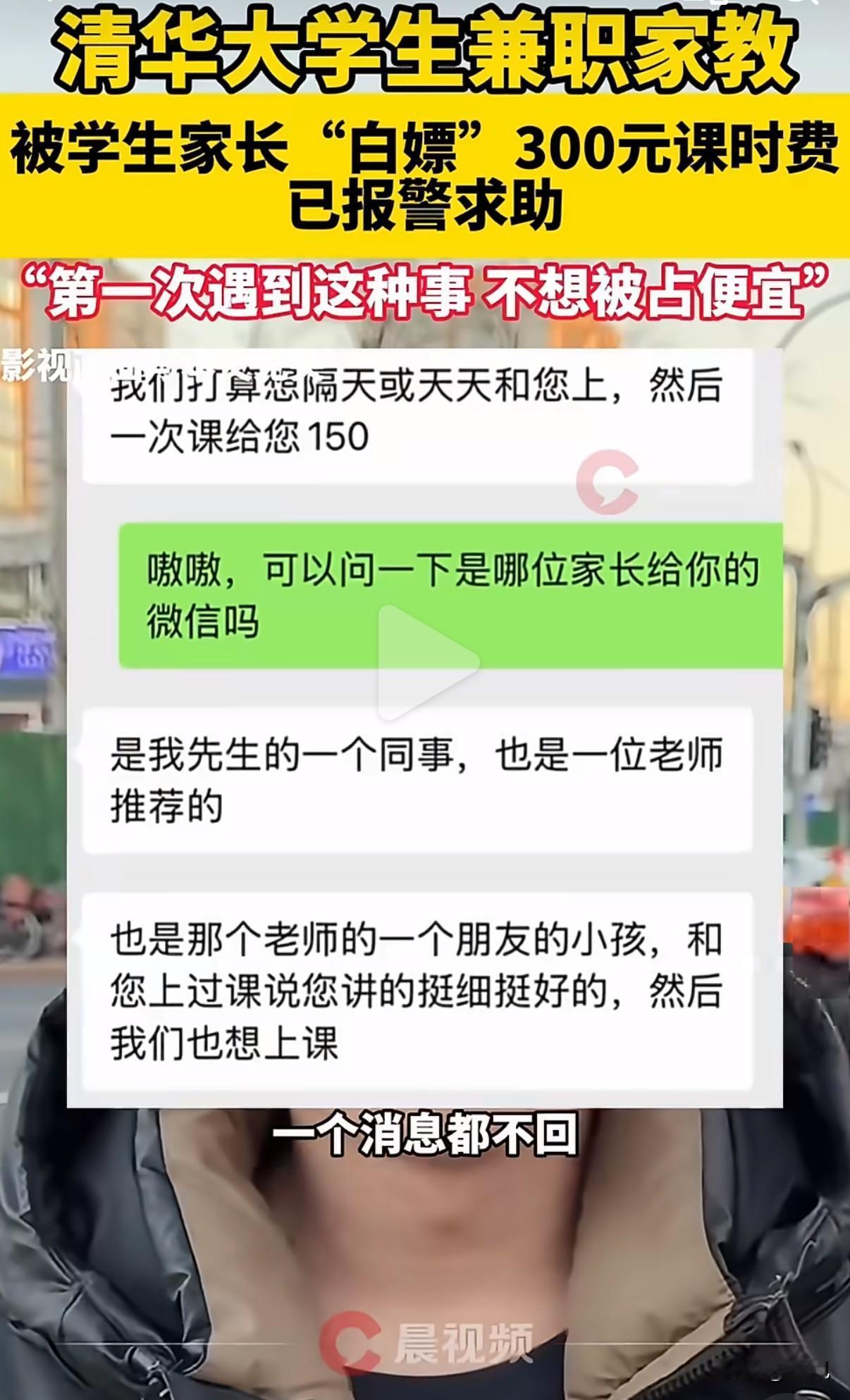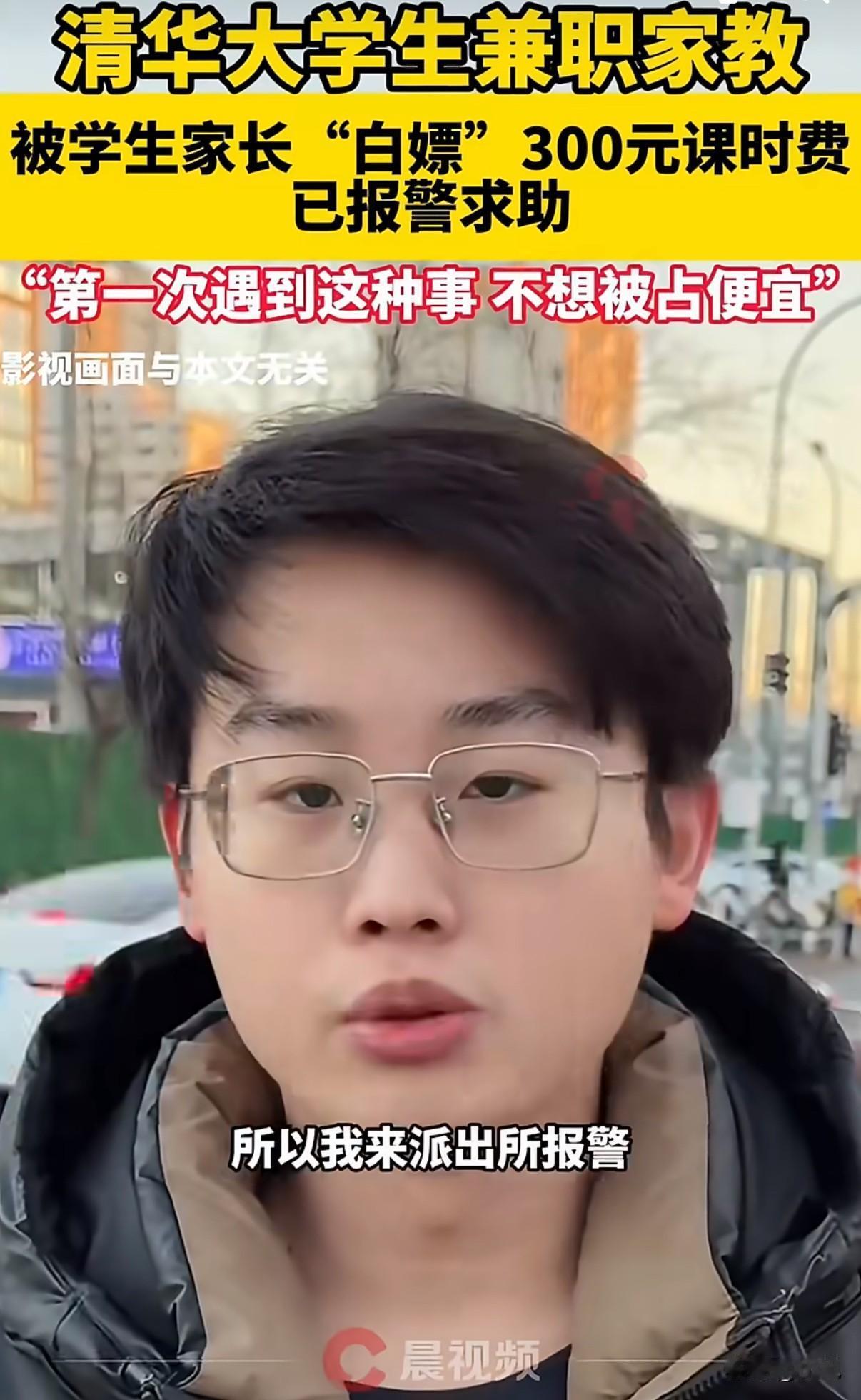 清华学霸当家教,1个半小时挣300还被赖账!最近,清华大学本硕在读的郭恩惠,在网上说了自己的一次糟心经历。他给沈阳一个高三学生线上辅导数学,说好一次课1点5小时,收费300块。 你可能觉得,清华学生这个价,已经很实在了。在北京,清华学生家教时薪普遍超过300。她这相当于时薪200,确实不算高。 上课过程也不顺。学生中途接班主任电话,课程断了。后来学生又急着要“数列速成技巧”,郭恩惠觉得他心态浮躁,不想继续教了。 结果刚说终止教学,家长那边立刻就“消失”了。微信不回,电话不接,整整300块钱课时费,一分没给。 郭恩惠没办法,去报了警。警方回复很直接:金额太小,立不了案。300块钱,就这样打了水漂。 回头看看,这事儿有几个点挺值得琢磨。 第一,价格本身就有意思。家长一开始还讨价还价,从150砍到300。清华背景、高三数学辅导,这个价钱在很多城市都算很低了。但即便这样,家长还是选择了赖账。 第二,维权的无力。300块钱,警察管不了,法院起诉成本又太高。对于学生兼职来说,除了网上曝光,好像真的没有别的办法。这种小额欠薪,成了“灰色地带”。 第三,对知识劳动的轻视。1.5小时,看似不长,但备课、沟通、实际授课,付出的远不止这点时间。家长也许觉得“就上了会儿网课”,但这背后是别人十几年的苦读和积累。 郭恩惠自己说,这是“清华学不到的课程”。社会这堂课,有时候确实挺现实的。 这件事很小,却很典型。它像一个切片,映出了兼职市场里,那些没合同、靠信任的交易,有多脆弱。也让人看到,一份看起来“轻松”的知识型工作,它的价值是如何被讨价还价,甚至被无视的。 大学生靠知识赚钱,本该是件挺光明正大的事。但如果连最基础的诚信和尊重都得不到,那就太让人心寒了。 这件事,你怎么看?