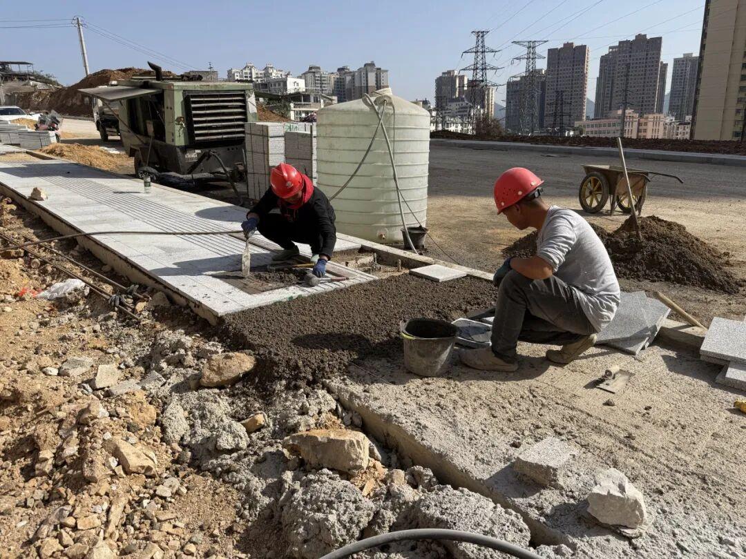 在项目施工现场,挖掘机、工程车往来穿梭,30余名施工人员各司其职,边坡防护、人行道道板铺设等作业正紧张有序推进,一派热火朝天的建设景象。