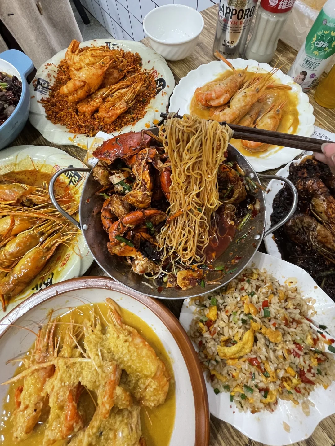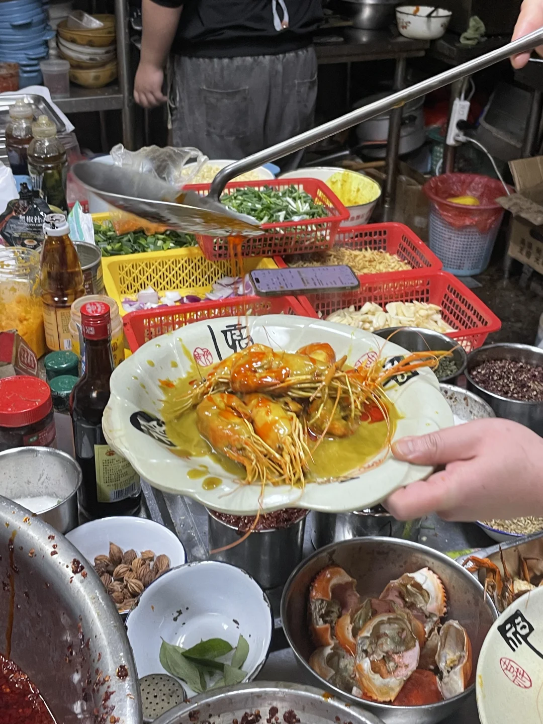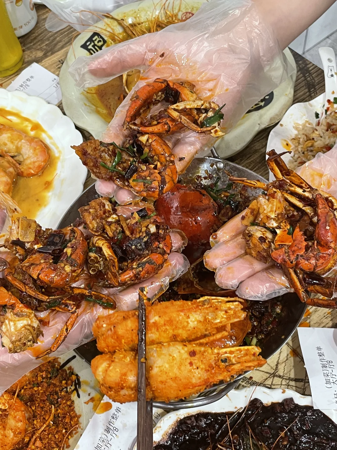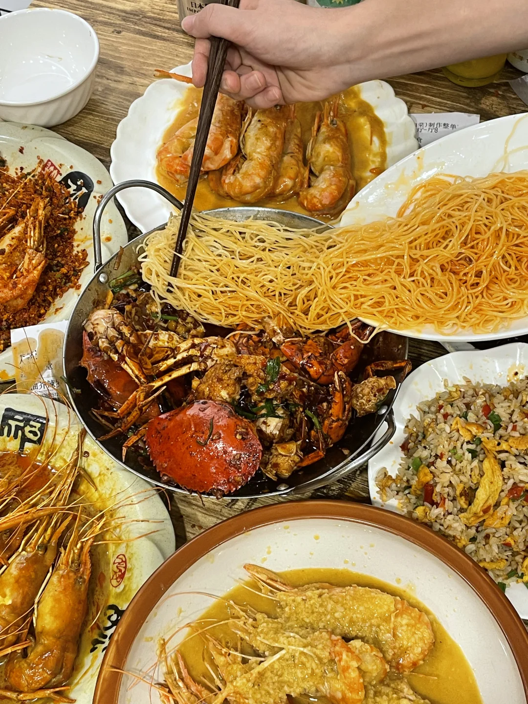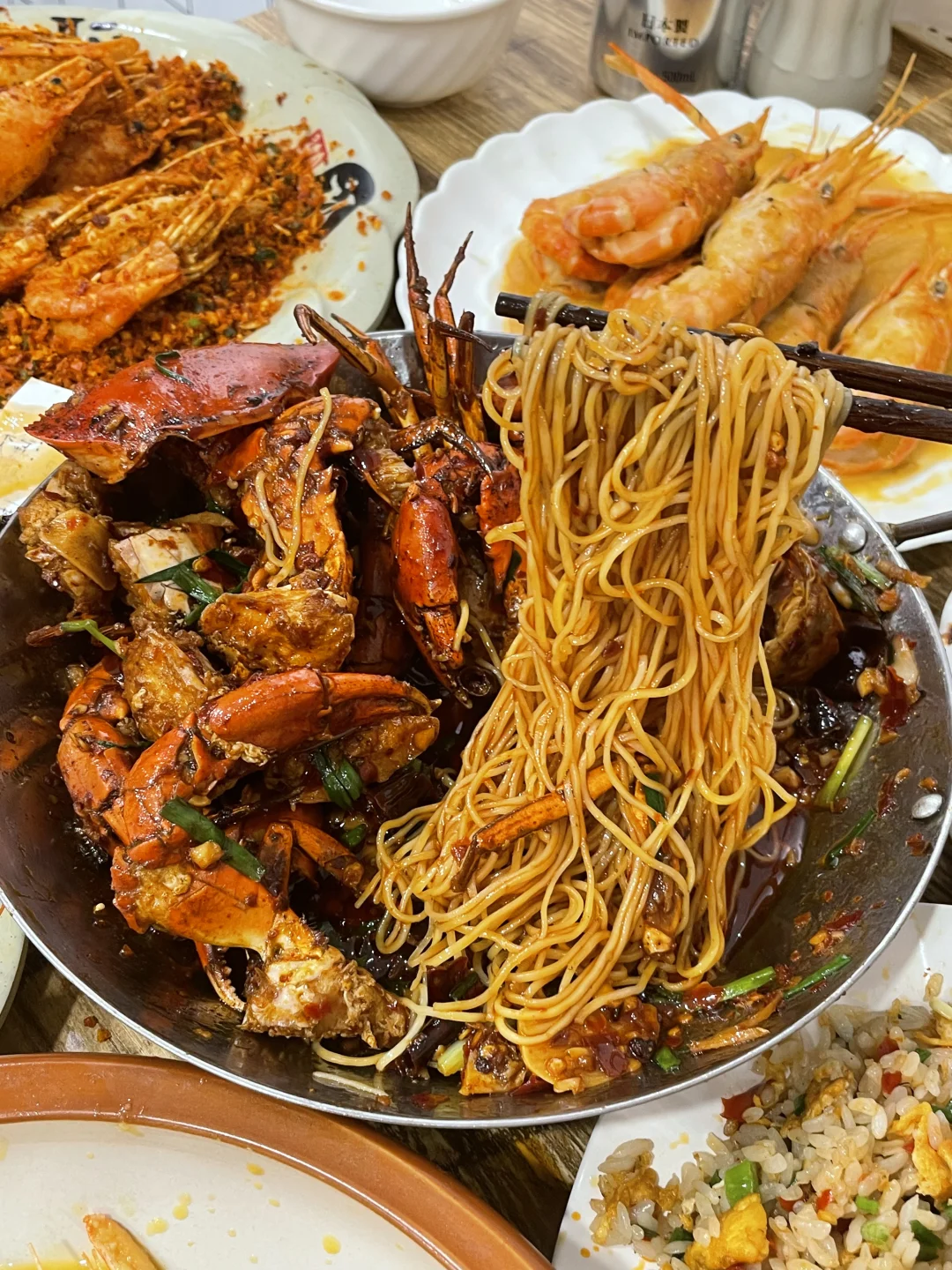 能在他家吃到最多的罗氏虾口味!避风塘/黄油芥辣/黑胡椒/咸蛋黄/泰式咖喱,特地找了朋友一起来吃,把所有味道都点了一遍!巨巨巨推荐避风塘和咸蛋黄!他家的避风塘很有贵阳特色,是加了辣椒,土豆脆做的和平时吃的避风塘不一样,更香更符合贵州口味!! 咸蛋黄味也很绝!每一个大虾都裹满咸蛋黄,满口咸香的幸福谁懂!!!!他家的虾巨大一个,全都是开了背的,现宰现炒 香辣蟹也很推荐!满满的蟹黄和蟹肉,再加一份拌面🍜吃了三大碗😋