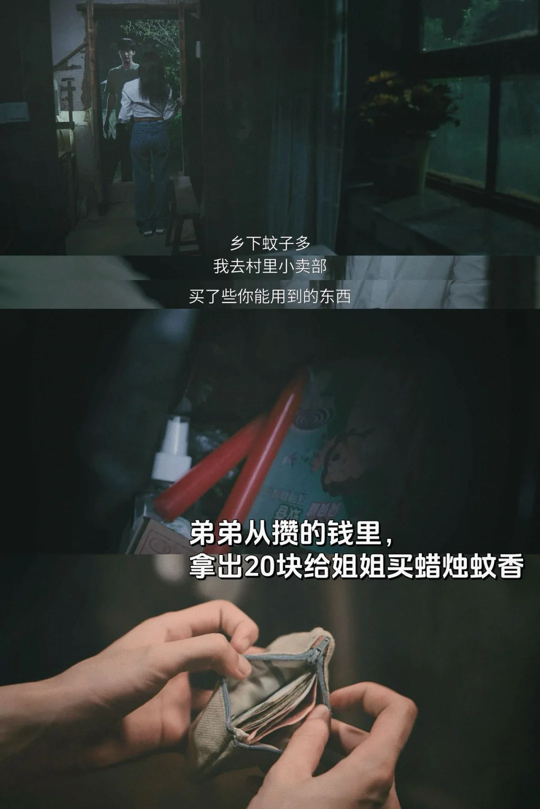 自己小心翼翼存了一点钱藏在床板底下,看看下雨停电,特意抽出20块去村里的小卖部买了蜡烛和蚊香给女主送去,看到女主住的地方门栓坏了,特意在女主门前守了一夜,喂了一晚上蚊子。