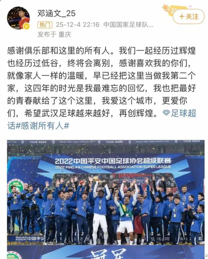 别惦记了!邓涵文不会来山东泰山! 今天武汉三镇右后卫邓涵文在社媒发文,正式告别了效力4年之久的武汉三镇,山东泰山球迷牛刚在直播时,与球迷们讨论了邓涵文来山东泰山的可能性。 其实山东泰山追求邓涵文的消息已经传出过好几次,但是最终都不了了之。感觉邓涵文根本就对山东泰山无感,有球迷甚至感觉邓涵文对山东泰山有很大的成见。据《足球》报李璇报道,武汉三镇给邓涵文开出顶薪续约,邓涵文都没有答应,所以邓涵文肯定有更高的追求,山东泰山他是看不上的,目前来看,他的下家大概率是上海海港或者上海申花。武汉三镇 邓涵文 山东泰山 上海海港 上海申花