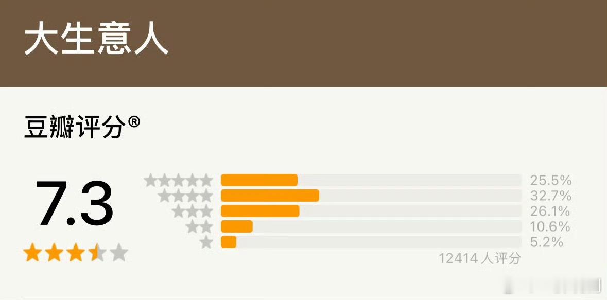 大生意人豆瓣开分7.3分,四星占比居多达32.7% ,明年角逐奖项没啥问题!大家