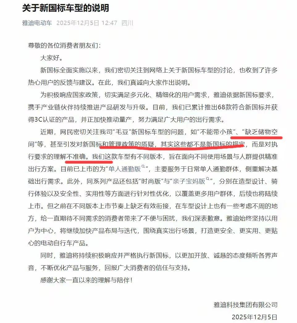 雅迪真太搞笑了!两天发两次声明!自己打自己的脸! 针对近期很多人吐槽新国标电动自行车的问题,例如不能带小孩,无储物箱,铁皮座等问题,随后自行车行业协会和工信部发声说明这是部分企业对标准理解不准导致,标准没问题。 12月4日雅迪发声说他们的车子不存在这些问题,这些产品只是个别车企车型,雅迪铿锵有力的说他们产品不会有这种设计。 12月5日雅迪又发声雅迪毛豆车型存在不能带小孩和没有储物箱,承认自己对标准理解有误,并不是标准的问题。 雅迪真是搞笑,前言不搭后语,前面刚信誓旦旦的说没问题,后面就打自己的脸。 雅迪真行!