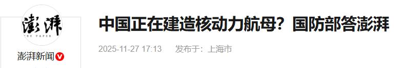 12万吨广东舰核航母出现?2025年11月27日,国防部例行记者会议中,记者就中国正在建造核动力航母提问!美日研判后认清现实,胁迫中国绝无可能! 自建国之后,我国就一直在大力研发军事装备。短短几十年的时间,中国的军事实力就得到了高速的提升。 也正因此,越来越多的国家紧盯中国军事研发的一举一动。毫不夸张的说,有的时候国家的一些军事装备研发,国人还不知道的时候,外媒就已经通过卫星窥探。 就在近期,外媒有传消息称,中国正在修建第四艘国产航母。更是在经过分析后发现这是一艘排水量,为12万吨左右的广东号核航母。 此事引起国际的高度讨论,就在2025年11月27日下午,国防部举行的例行记者会议中。就有记者就此事进行了提问,对此,国防部发言人明确回应.有关航母建设发展情况,中国始终根据国家安全和装备技术发展需要,推进航母建设。 发言人没有否认我国正在建造核动力航母这一事件,所以相关消息在一经流出后,国际极为震惊。 中国能够修建12万吨的核航母,也就意味着中国的航母建造能力要远胜于美国,毕竟美国的航母上限是11万吨级。 目前我国已有三艘航母,对于这艘刚刚出现的航母,外媒称之为广东舰。在该航母成功研发后,也就意味着我国将迈入四航母时代。祖国的军事实力得到提升,国人的底气也油然而增。 对此,您怎么看?欢迎评论区留言您的看法,我们一起讨论一下。 (信息来源:中国正在建造核动力航母?国防部答澎湃 -澎湃新闻)