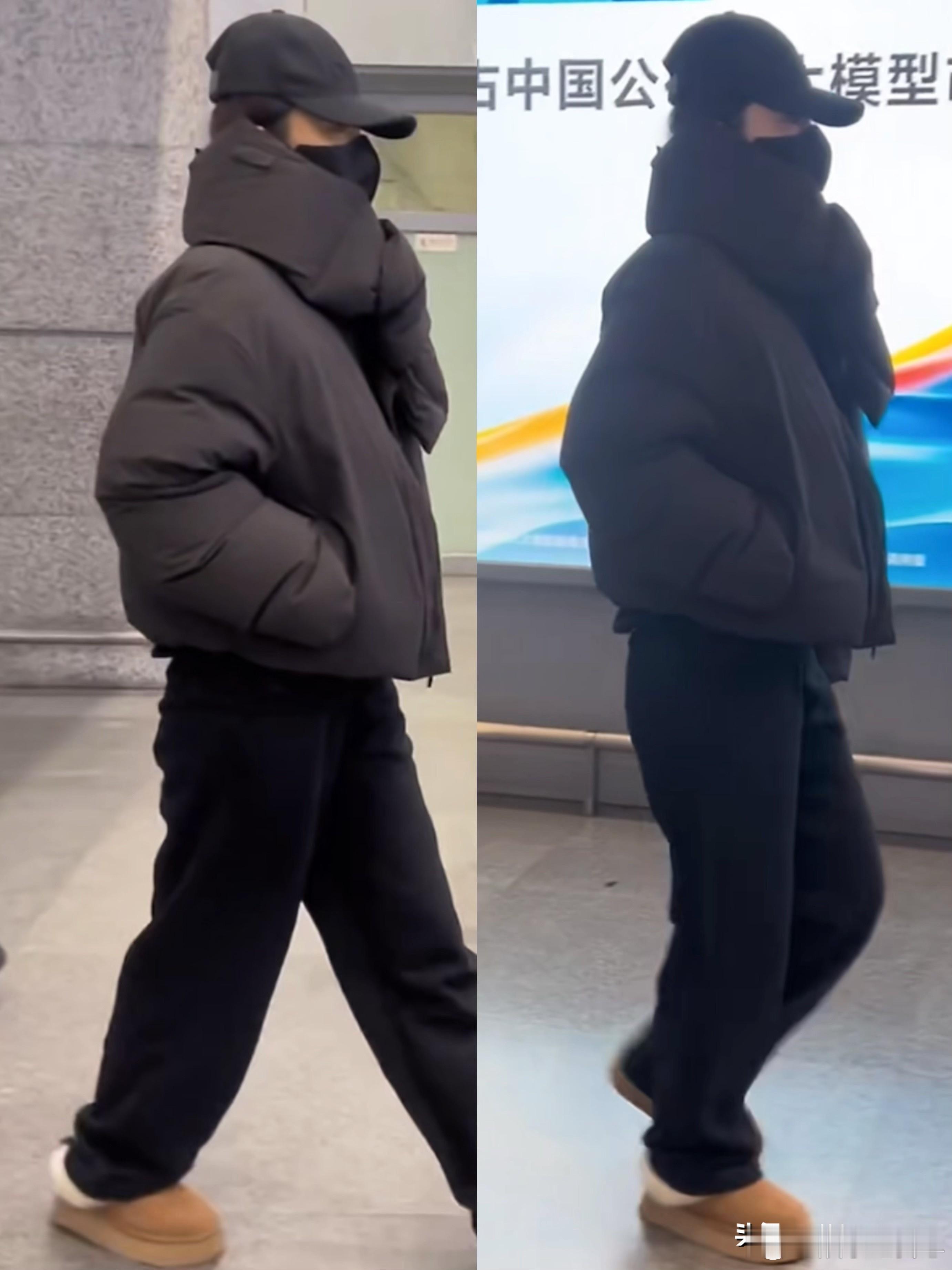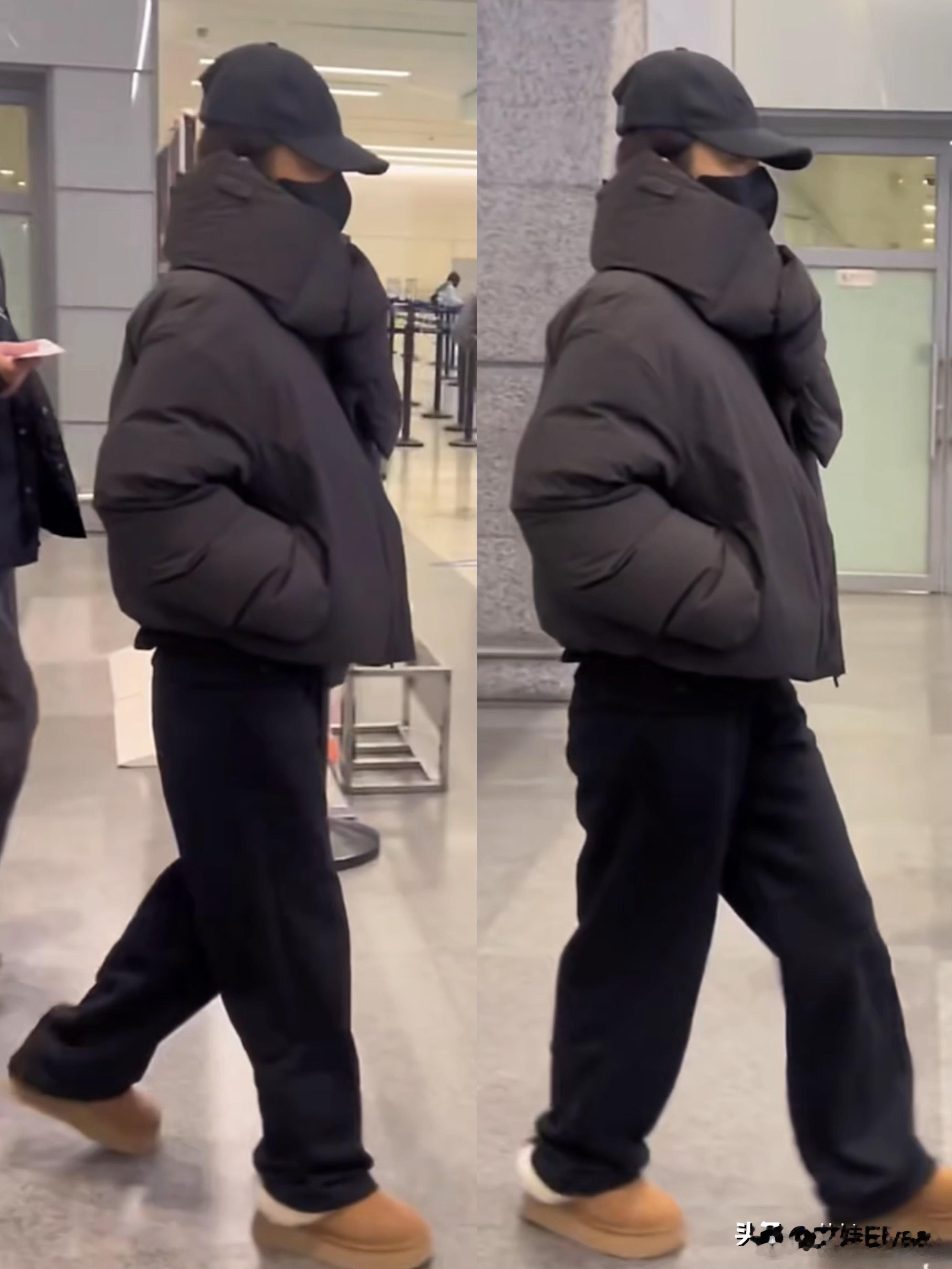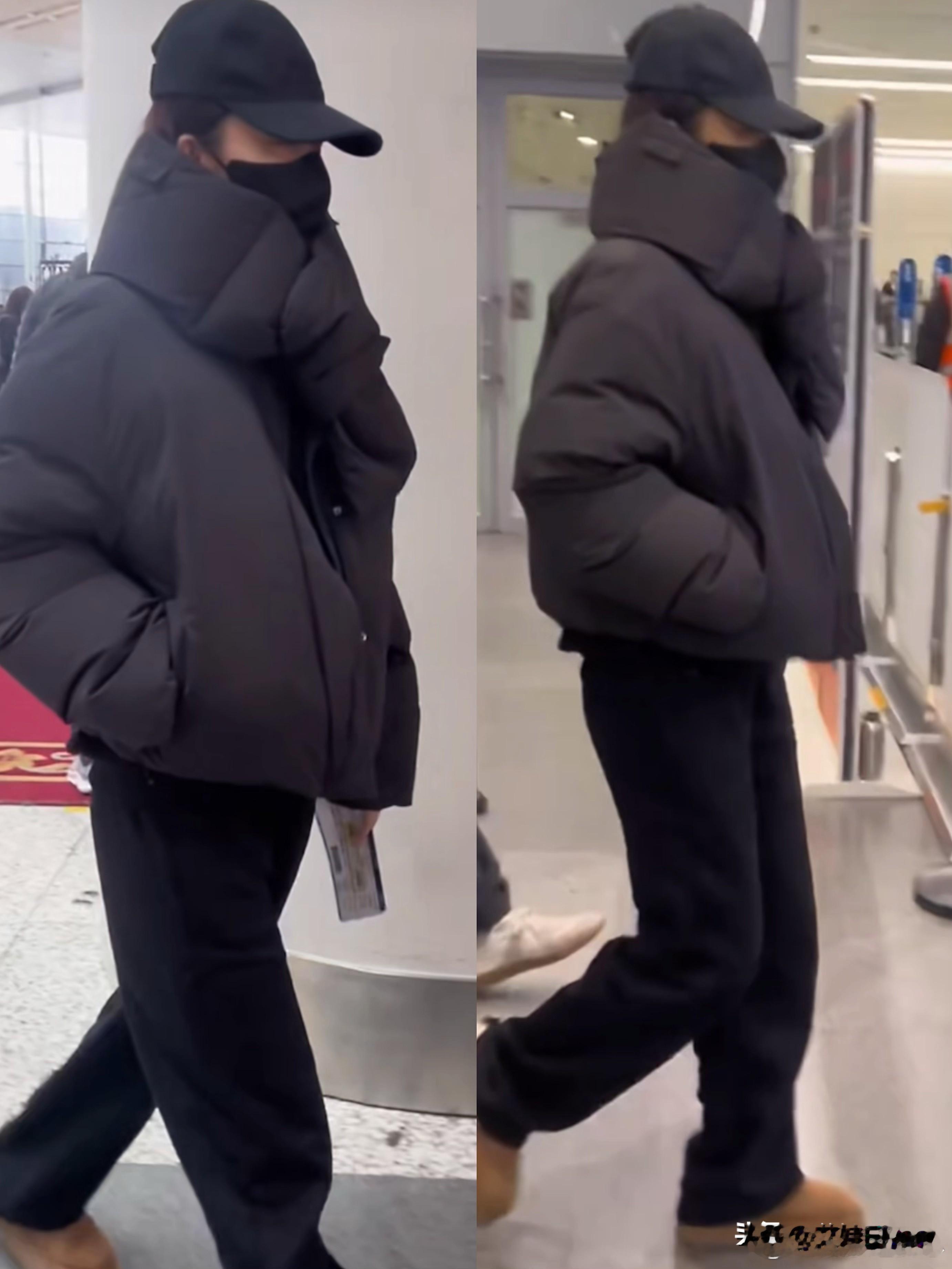 李沁将保暖做到极致,好厚的围巾。李沁机场行走时,穿得是真暖和,跟普通一样棉服加阔